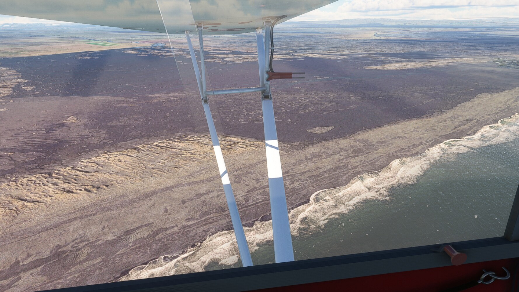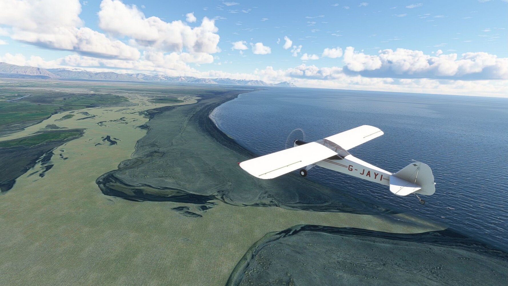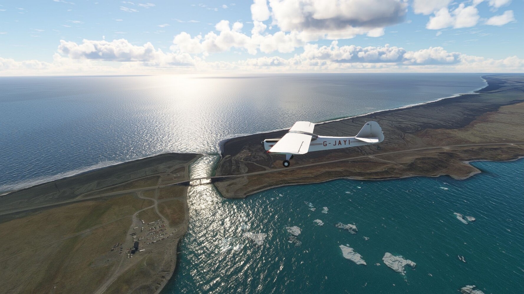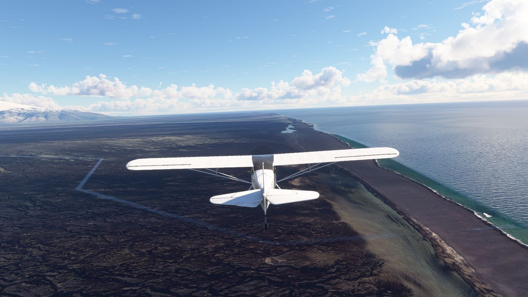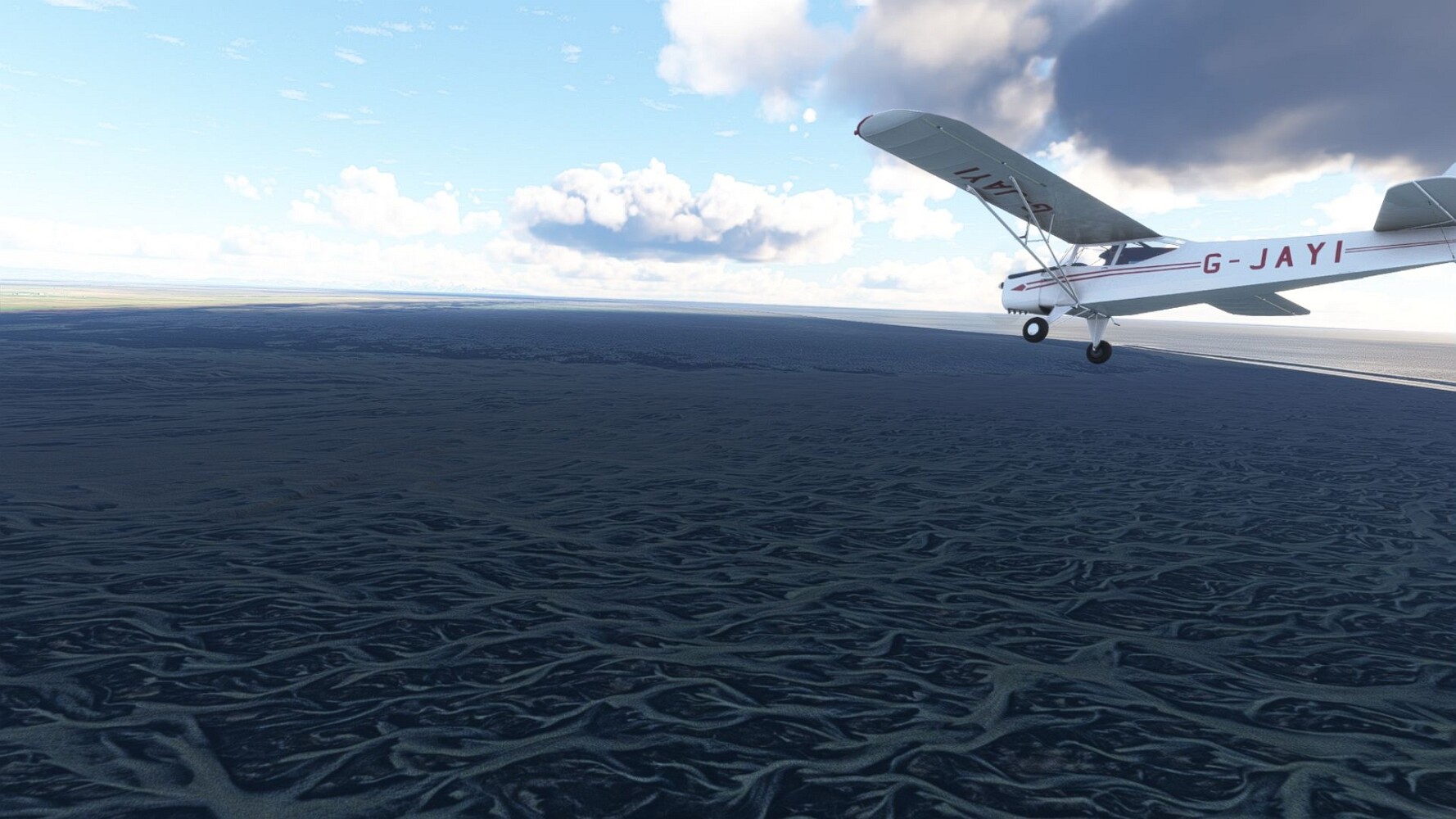 Am nächsten Morgen gings weiter von Vestmannaeyjabaer (BIVM) wieder zurück zur Südküste und weiter gen Osten. da muss irgendwo die DC3 liegen... An der Küste wurde im großen Stil aufgeforstet oder mit Büschen begrünt? Hier wirds was luftiger Und hier ist alles öde. Der übliche Bewuchs :-) Anflug auf die Klippe von Dyrhólaey... mit dem Leuchtturm Nummer 12, der wieder aus dem Haus Asobo stammt. Nett! Wirklich eine beeindruckende Lage. Hier endet nun die weiten Schwemmebenen und die Berge schieben sich an die Küste. Die Vulkanreste von Hálsanefshellir Sehr beeindruckend Erstmal kein Leuchtfeuer in Sicht. Aber neue Mündungen und neue Schwemm-Ebenen Gewaltig Und da habe ich wieder einen entdeckt. Die Nummer 13! Verloren in der Weite, der Alvidruhamrar Leuchtturm Liegt wirklich einsam. Es folgen die gewaltigen Ebenen die die Kettla hier hinterlassen hat. windgepeitscht Phantastische Muster von hier oben! Leider gibts hier manch unschöner AI-Flusslauf Aber es geht auch besser, allerdings sind die Muster nicht als Wasser markiert, schade... Grandios Wieder ein Fels im Nirgendwo: Ingólfshöfði Das Kap ist nur bei Ebbe zu erreichen, so sagt es zumindest die Wiki. Der Leuchtturm stammt aus dem Jahr 1916. Wieder ein eher klassisches Modell, dieses Mal von Garf. Sehr schön! Da passt auch die Nummer 14! Und weiter gehts Wir nähern uns Fjallsjökull Eisschollen... Auf dem Parkplatz ist es schon was eng... Wirklich tolle Bergformen Und grandiose Farben... Eine neue Schwemmebene Höfn ist erreicht, hier findet sich die Nummer 15. Ein kleiner Turm, der die Einfahrt in die flache Bucht markiert. Hier ist leider viel von dem was Wasser sein sollte im Flusi als Land dargestellt. Wieder sehr schade. Der kleine Flugplatz liegt hinter dem Städtchen. Der Tank war schon wieder leer, die Auster hat einen gewaltigen Durst nach Kerosin. Teil 02Teil 04