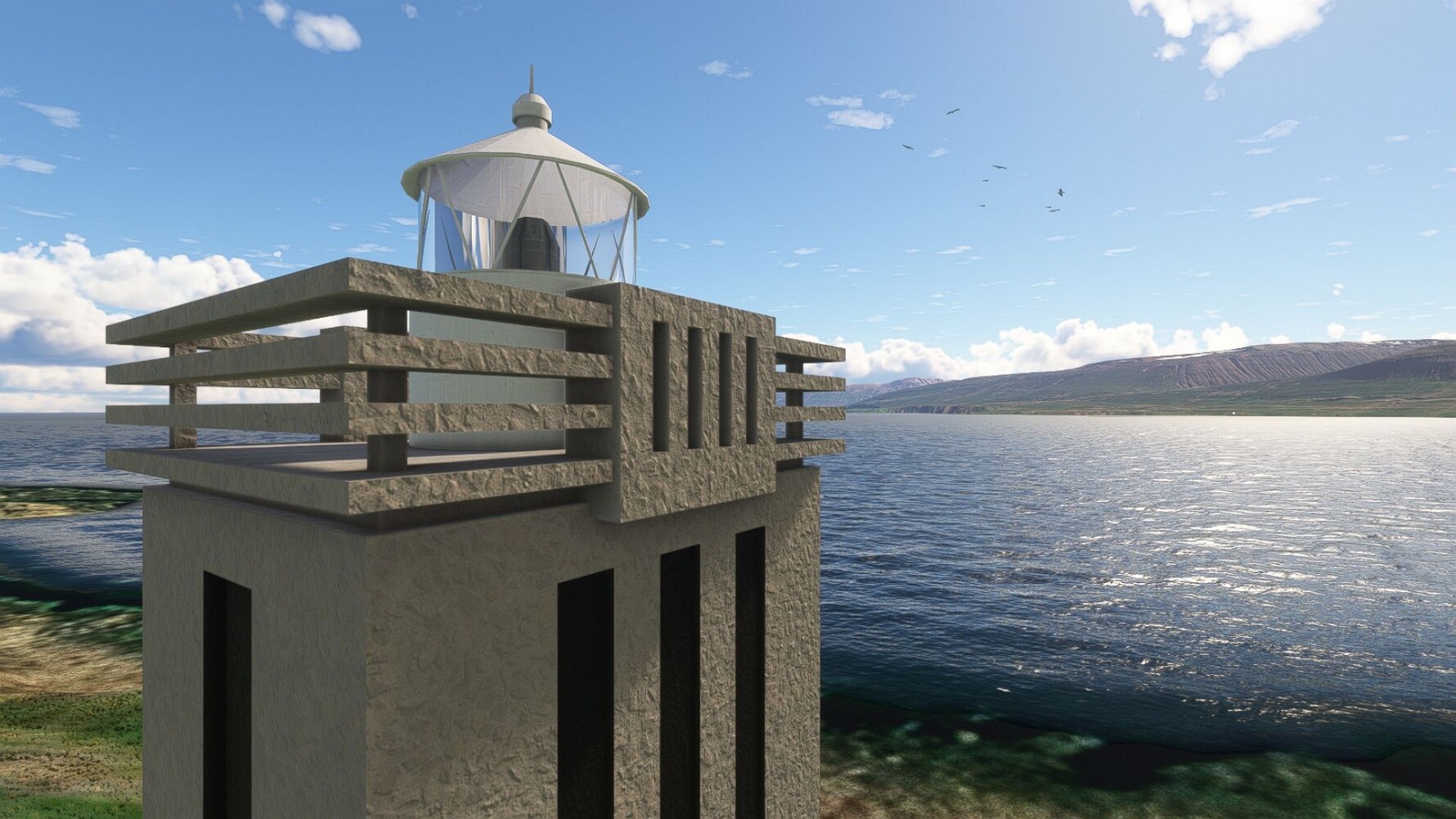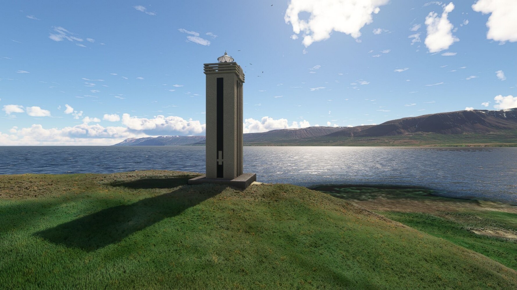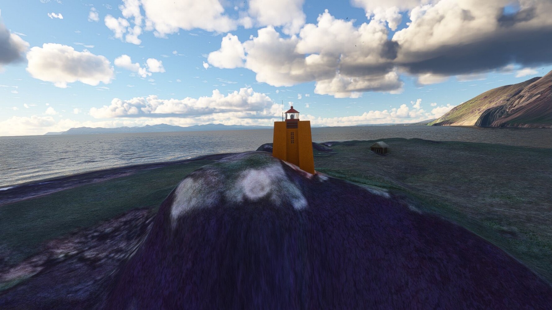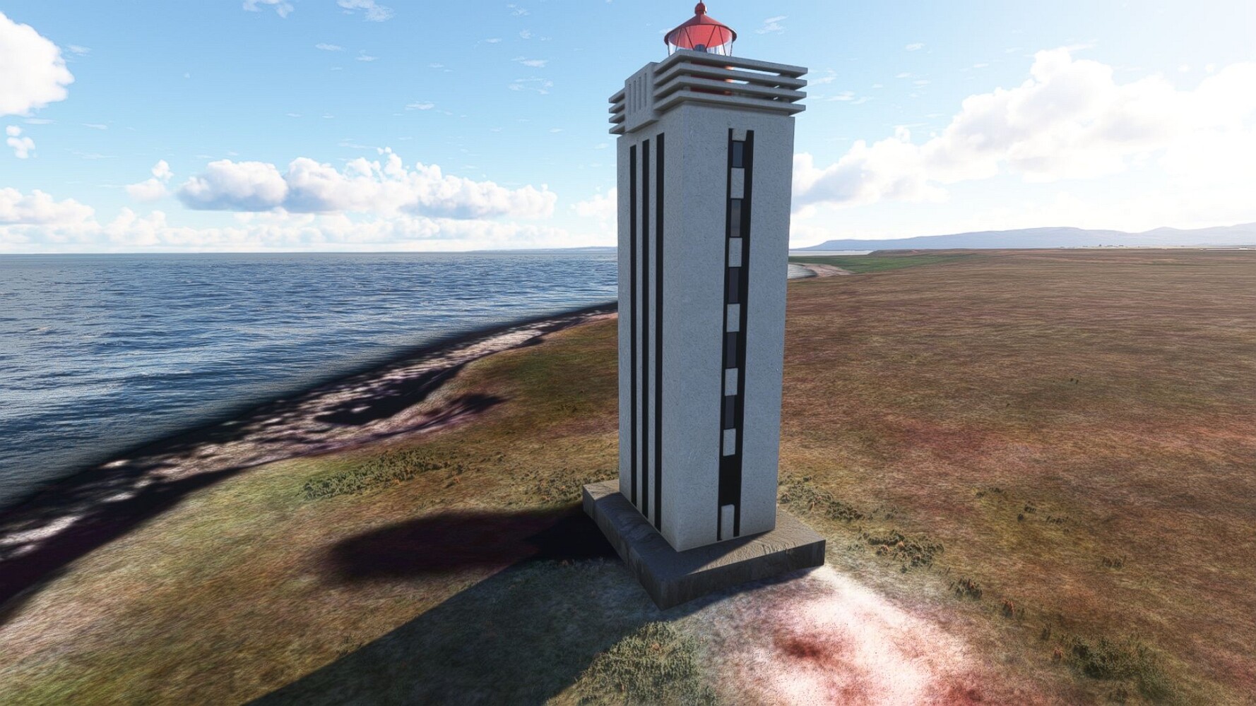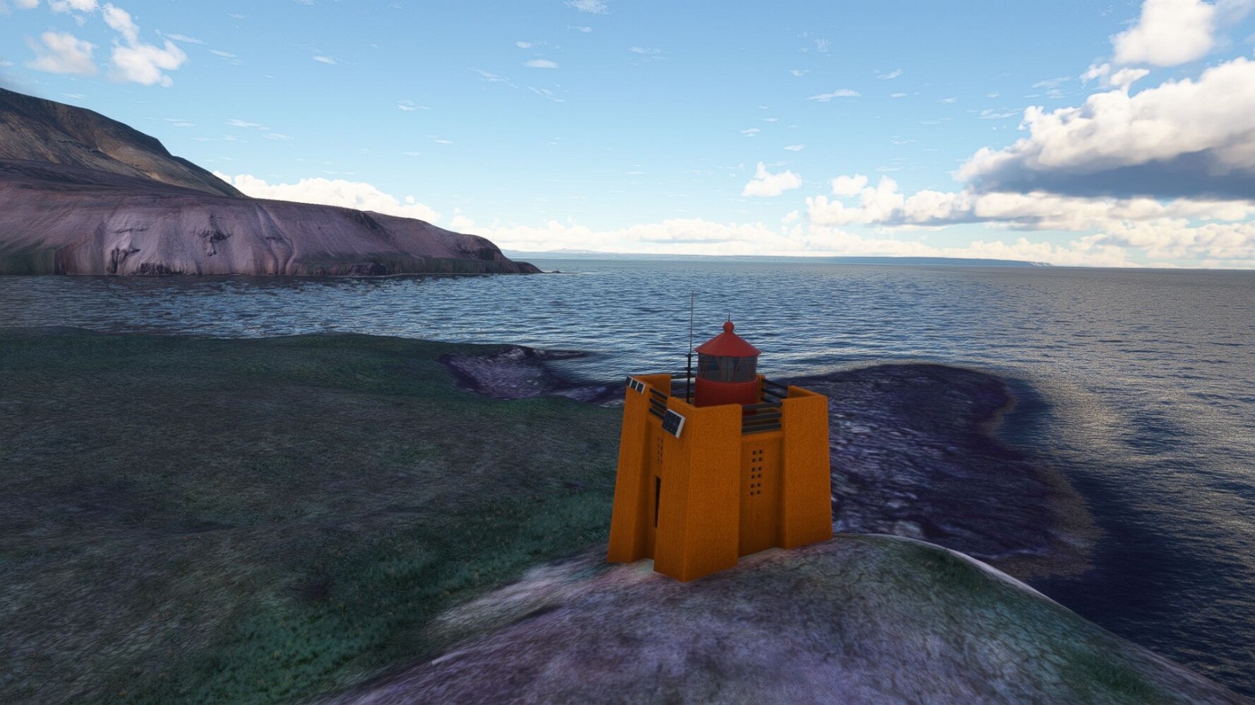 Start war in Borgarfjödur Eystri, BIBF Gleich gehts wieder an Steilhängen entlang. Kleine Buchten öffnen sich hier. Die Landschaft bleibt aber wild und die Berge steil. Der erste Leuchtturm dieser Etappe voraus, 32. der Umrundung. Es ist der von Kögur. Mit Schutzmauer und ohne leuchtenden Anstrich. Und sehr abgelegen. Dann kommt die weite Bucht von Heradsfloi. Mal wieder ein weiter, schwarzer Strand. Mal im Sommerlicht, ein anderes Wettertheam, passt nicht finde ich... so ist es besser. Die Nummer 33 findet sich auf einer kleinen Insel, die dem Kap vorgelagert ist. Es ist der Leuchtturm Bjarnarey. Eine kleine Festung, die Laterne eingekeilt zwischen den starken Eckpfeilern. Langsam werden die Berge flacher... und das Land weiter. Der kleine Flugplatz von Vöpnafjördur (BIVO) Der zugehörige Ort liegt auf der Halbinsel. Nördlich außerhalb des Ortes liegt der nächste Leuchtturm, die 34 in der bisherigen Zählung. Er nennt sich Kolbeinstangi Mal wieder ein klassisches isländisches Modell. Blick auf Vopnafjördur. Und weiter gehts Merkwürdige Begegnung, AI-Traffic auf Meereshöhe... Hier wirds nun ganz flach, mit einer Steilküste. Die steigt langsam an... Die Nummer 35 kommt in Sichtweite. Das Leuchtfeuer Digranes. Wieder ein klassisches Islandmodell. Die Küste steigt weiter an. Trogtäler zeugen von der vergangenen Vergletscherung. Hier ragt eine flache Halbinsel weit ins Meer. Und an ihrer Spitze einsam ein Leuchtfeuer. Sein Name ist Langanessviti, die Nummer 36. Drei Dutzend sind schon voll. Eine ganz andere Landschaft hier. Schneereste. Die 37 markierte die Bucht von Lonafjördur Auf meiner Karte ist er namenlos... Google sagt es ist der Turm von Grenjanes Es handelt sich wieder um ein Standardmodell Schon ist der nächste Landplatz in Sicht... Thorshofn BITN Teil 07Teil 09