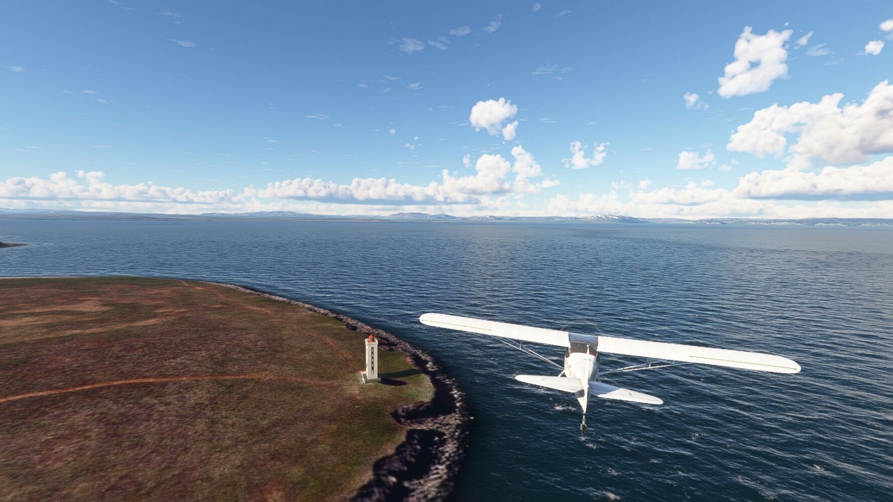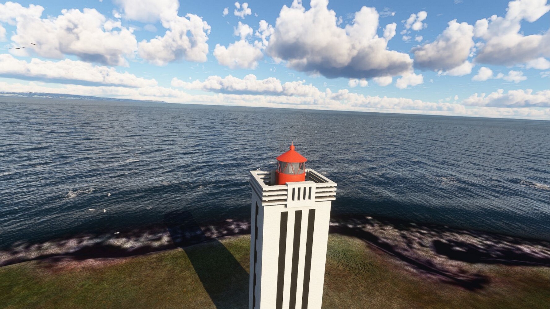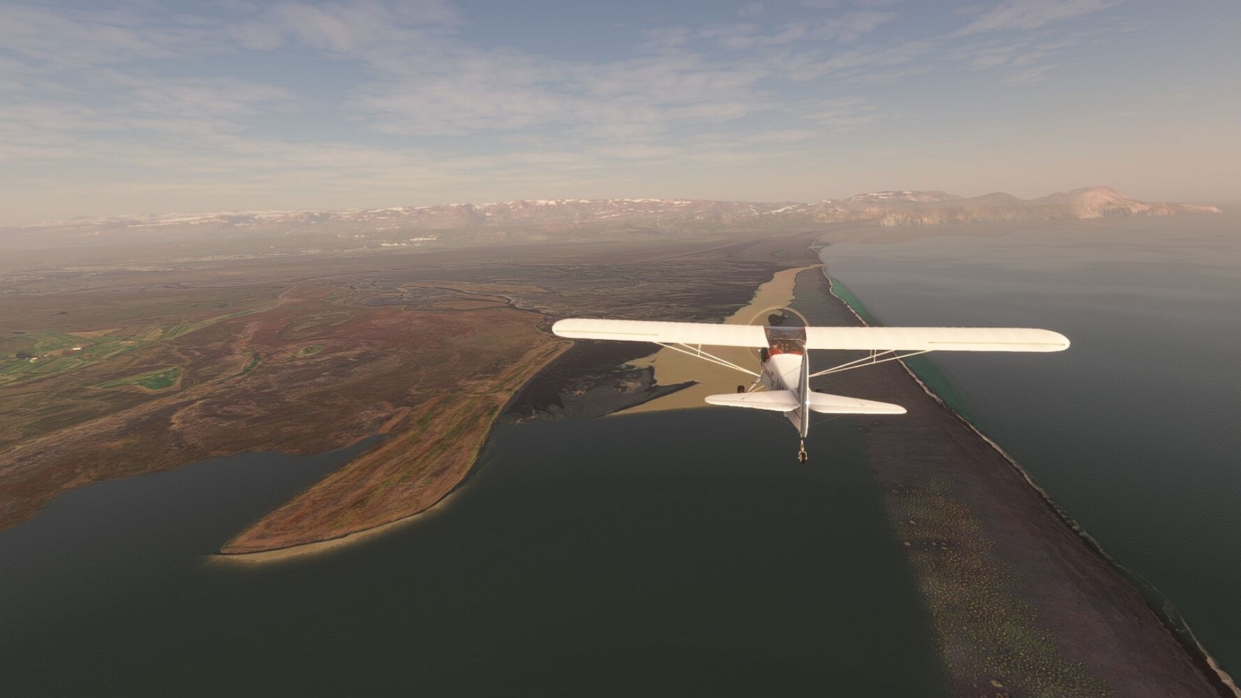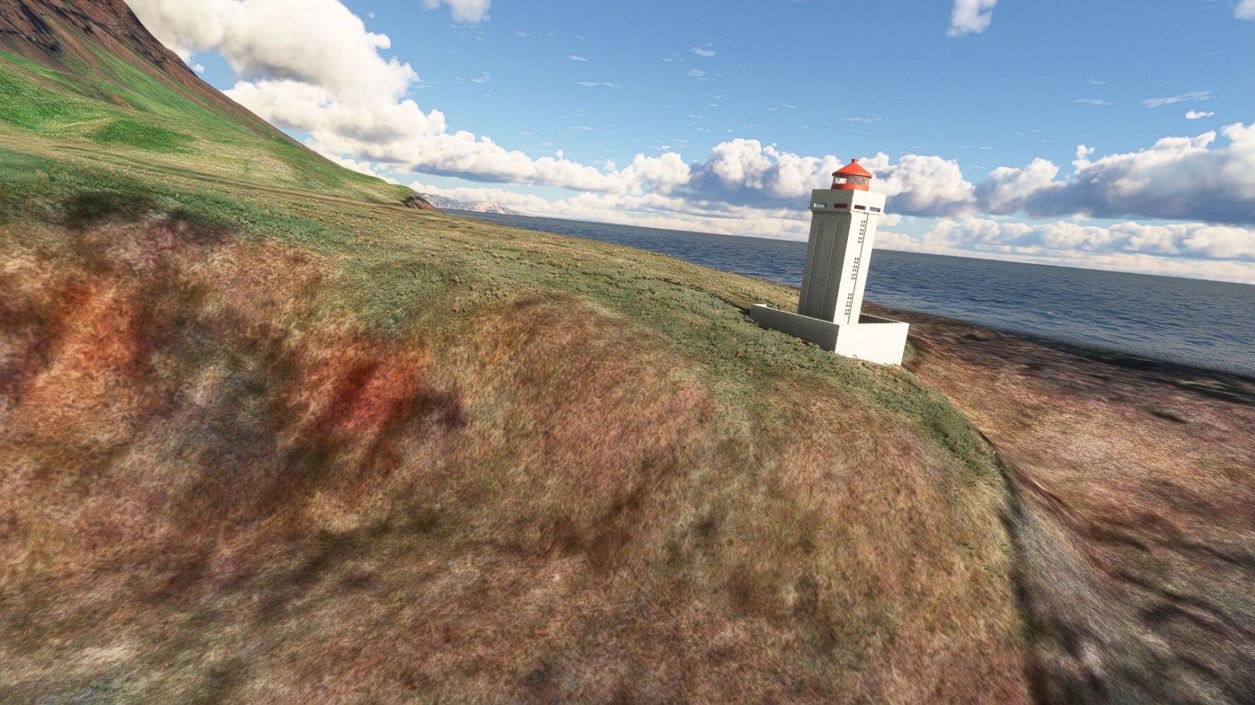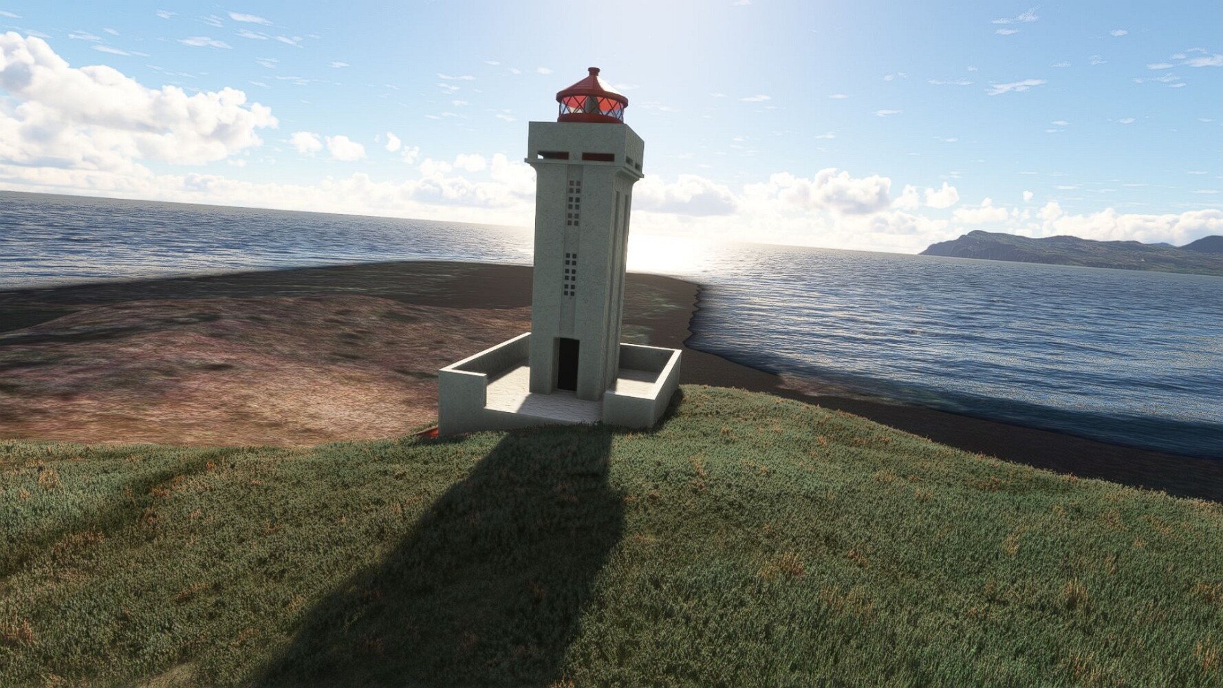 Start war in Borgarfjödur Eystri, BIBF Gleich gehts wieder an Steilhängen entlang. Kleine Buchten öffnen sich hier. Die Landschaft bleibt aber wild und die Berge steil. Der erste Leuchtturm dieser Etappe voraus, 32. der Umrundung. Es ist der von Kögur. Mit Schutzmauer und ohne leuchtenden Anstrich. Und sehr abgelegen. Dann kommt die weite Bucht von Heradsfloi. Mal wieder ein weiter, schwarzer Strand. Mal im Sommerlicht, ein anderes Wettertheam, passt nicht finde ich... so ist es besser. Die Nummer 33 findet sich auf einer kleinen Insel, die dem Kap vorgelagert ist. Es ist der Leuchtturm Bjarnarey. Eine kleine Festung, die Laterne eingekeilt zwischen den starken Eckpfeilern. Langsam werden die Berge flacher... und das Land weiter. Der kleine Flugplatz von Vöpnafjördur (BIVO) Der zugehörige Ort liegt auf der Halbinsel. Nördlich außerhalb des Ortes liegt der nächste Leuchtturm, die 34 in der bisherigen Zählung. Er nennt sich Kolbeinstangi Mal wieder ein klassisches isländisches Modell. Blick auf Vopnafjördur. Und weiter gehts Merkwürdige Begegnung, AI-Traffic auf Meereshöhe... Hier wirds nun ganz flach, mit einer Steilküste. Die steigt langsam an... Die Nummer 35 kommt in Sichtweite. Das Leuchtfeuer Digranes. Wieder ein klassisches Islandmodell. Die Küste steigt weiter an. Trogtäler zeugen von der vergangenen Vergletscherung. Hier ragt eine flache Halbinsel weit ins Meer. Und an ihrer Spitze einsam ein Leuchtfeuer. Sein Name ist Langanessviti, die Nummer 36. Drei Dutzend sind schon voll. Eine ganz andere Landschaft hier. Schneereste. Die 37 markierte die Bucht von Lonafjördur Auf meiner Karte ist er namenlos... Google sagt es ist der Turm von Grenjanes Es handelt sich wieder um ein Standardmodell Schon ist der nächste Landplatz in Sicht... Thorshofn BITN Teil 07Teil 09