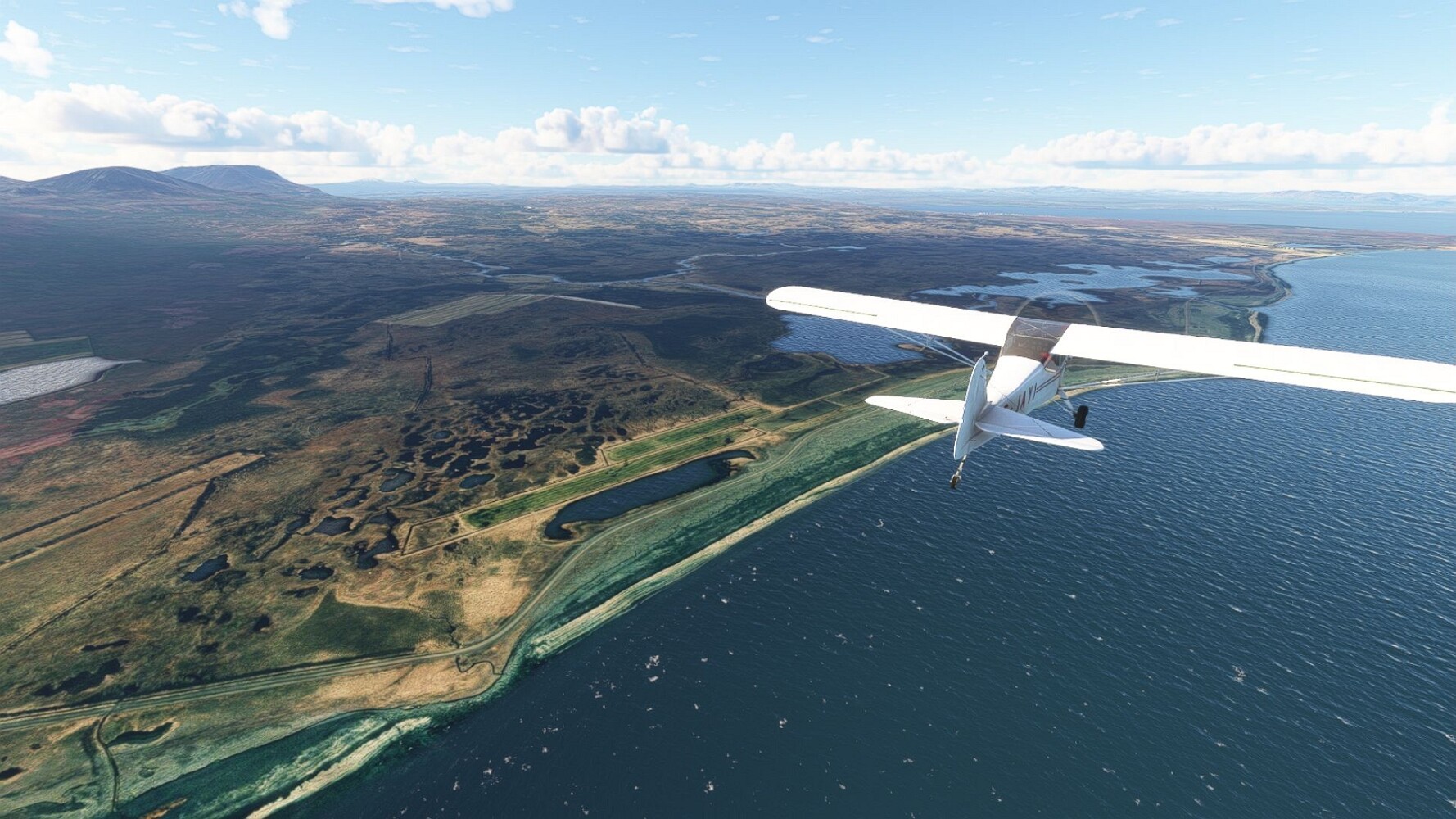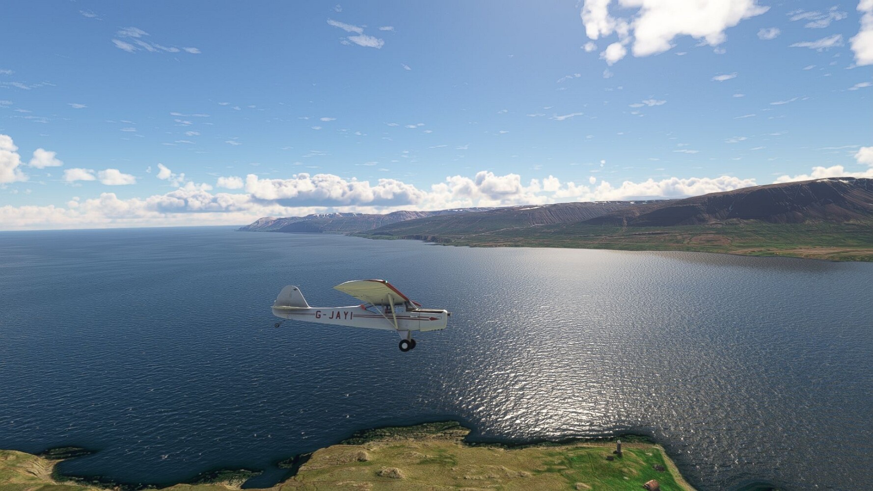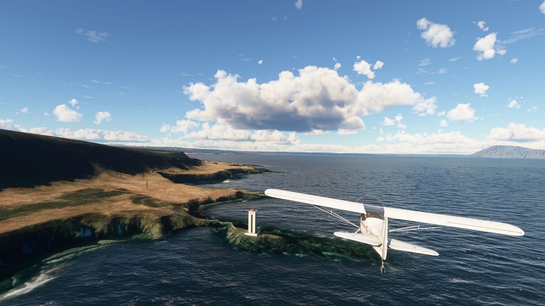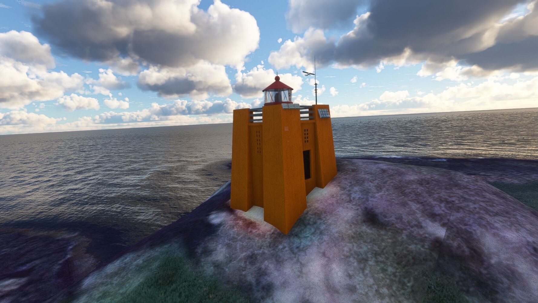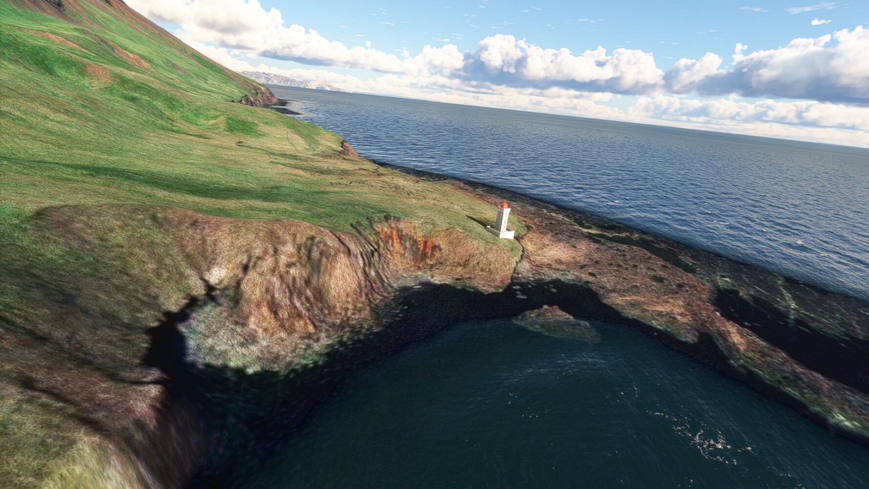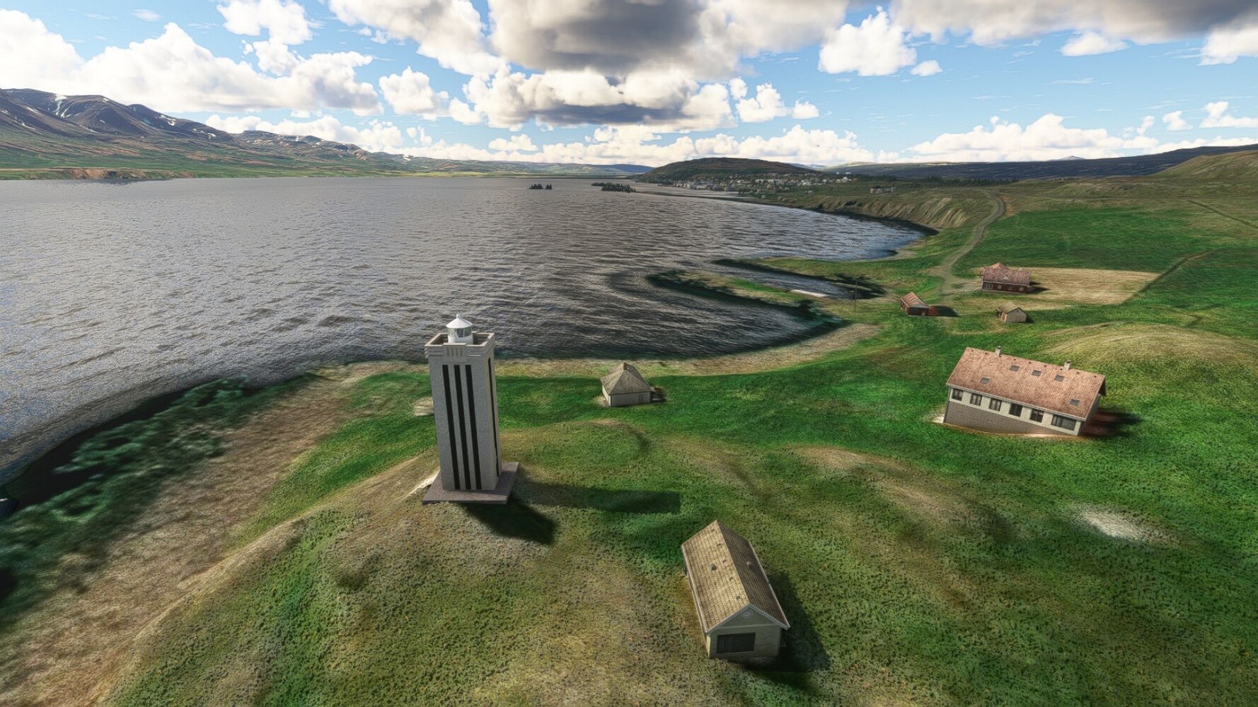 Start war in Borgarfjödur Eystri, BIBF Gleich gehts wieder an Steilhängen entlang. Kleine Buchten öffnen sich hier. Die Landschaft bleibt aber wild und die Berge steil. Der erste Leuchtturm dieser Etappe voraus, 32. der Umrundung. Es ist der von Kögur. Mit Schutzmauer und ohne leuchtenden Anstrich. Und sehr abgelegen. Dann kommt die weite Bucht von Heradsfloi. Mal wieder ein weiter, schwarzer Strand. Mal im Sommerlicht, ein anderes Wettertheam, passt nicht finde ich... so ist es besser. Die Nummer 33 findet sich auf einer kleinen Insel, die dem Kap vorgelagert ist. Es ist der Leuchtturm Bjarnarey. Eine kleine Festung, die Laterne eingekeilt zwischen den starken Eckpfeilern. Langsam werden die Berge flacher... und das Land weiter. Der kleine Flugplatz von Vöpnafjördur (BIVO) Der zugehörige Ort liegt auf der Halbinsel. Nördlich außerhalb des Ortes liegt der nächste Leuchtturm, die 34 in der bisherigen Zählung. Er nennt sich Kolbeinstangi Mal wieder ein klassisches isländisches Modell. Blick auf Vopnafjördur. Und weiter gehts Merkwürdige Begegnung, AI-Traffic auf Meereshöhe... Hier wirds nun ganz flach, mit einer Steilküste. Die steigt langsam an... Die Nummer 35 kommt in Sichtweite. Das Leuchtfeuer Digranes. Wieder ein klassisches Islandmodell. Die Küste steigt weiter an. Trogtäler zeugen von der vergangenen Vergletscherung. Hier ragt eine flache Halbinsel weit ins Meer. Und an ihrer Spitze einsam ein Leuchtfeuer. Sein Name ist Langanessviti, die Nummer 36. Drei Dutzend sind schon voll. Eine ganz andere Landschaft hier. Schneereste. Die 37 markierte die Bucht von Lonafjördur Auf meiner Karte ist er namenlos... Google sagt es ist der Turm von Grenjanes Es handelt sich wieder um ein Standardmodell Schon ist der nächste Landplatz in Sicht... Thorshofn BITN Teil 07Teil 09