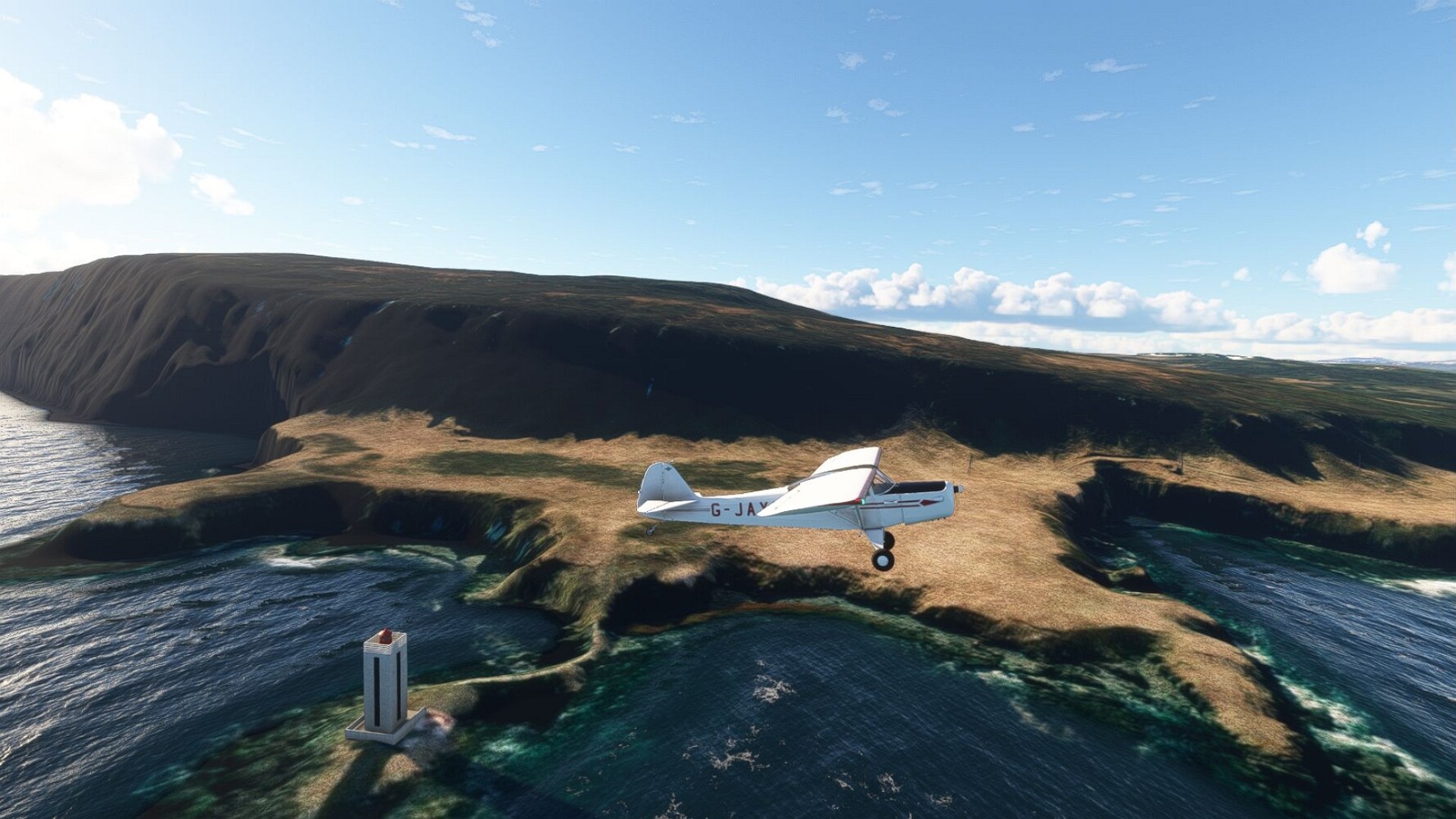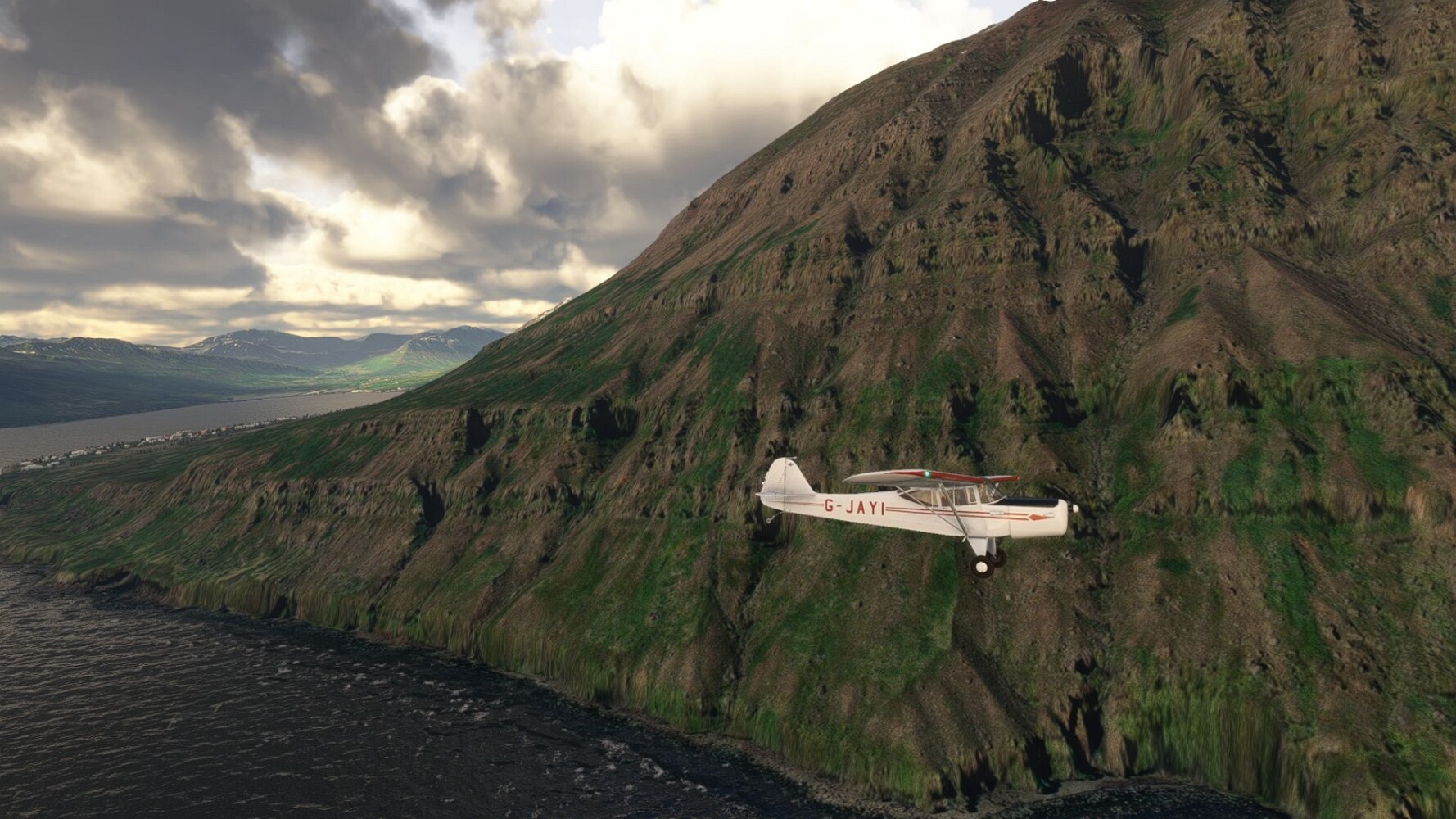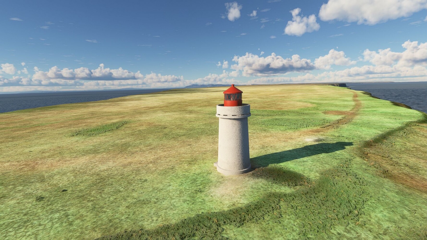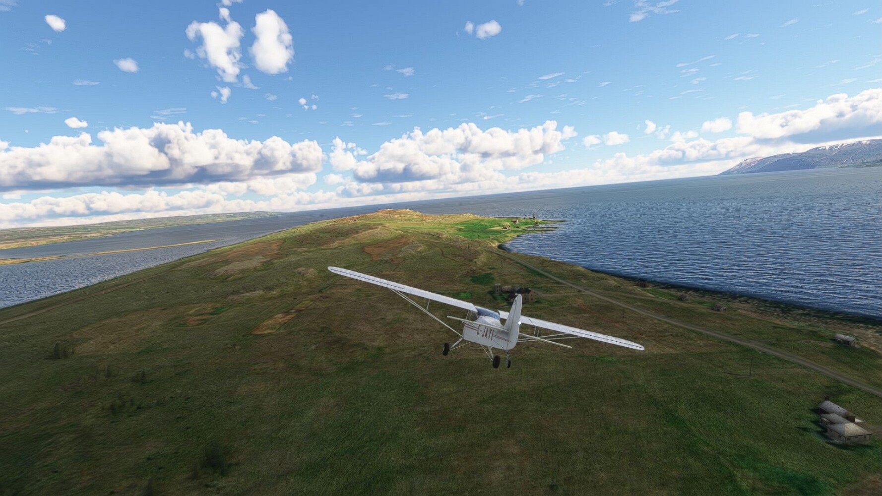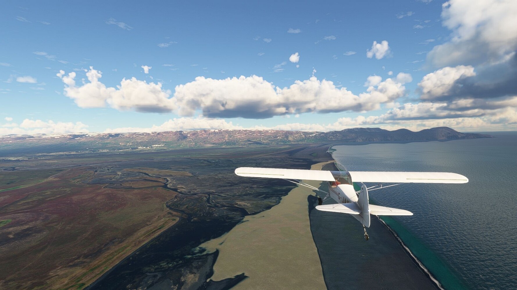 Start war in Borgarfjödur Eystri, BIBF Gleich gehts wieder an Steilhängen entlang. Kleine Buchten öffnen sich hier. Die Landschaft bleibt aber wild und die Berge steil. Der erste Leuchtturm dieser Etappe voraus, 32. der Umrundung. Es ist der von Kögur. Mit Schutzmauer und ohne leuchtenden Anstrich. Und sehr abgelegen. Dann kommt die weite Bucht von Heradsfloi. Mal wieder ein weiter, schwarzer Strand. Mal im Sommerlicht, ein anderes Wettertheam, passt nicht finde ich... so ist es besser. Die Nummer 33 findet sich auf einer kleinen Insel, die dem Kap vorgelagert ist. Es ist der Leuchtturm Bjarnarey. Eine kleine Festung, die Laterne eingekeilt zwischen den starken Eckpfeilern. Langsam werden die Berge flacher... und das Land weiter. Der kleine Flugplatz von Vöpnafjördur (BIVO) Der zugehörige Ort liegt auf der Halbinsel. Nördlich außerhalb des Ortes liegt der nächste Leuchtturm, die 34 in der bisherigen Zählung. Er nennt sich Kolbeinstangi Mal wieder ein klassisches isländisches Modell. Blick auf Vopnafjördur. Und weiter gehts Merkwürdige Begegnung, AI-Traffic auf Meereshöhe... Hier wirds nun ganz flach, mit einer Steilküste. Die steigt langsam an... Die Nummer 35 kommt in Sichtweite. Das Leuchtfeuer Digranes. Wieder ein klassisches Islandmodell. Die Küste steigt weiter an. Trogtäler zeugen von der vergangenen Vergletscherung. Hier ragt eine flache Halbinsel weit ins Meer. Und an ihrer Spitze einsam ein Leuchtfeuer. Sein Name ist Langanessviti, die Nummer 36. Drei Dutzend sind schon voll. Eine ganz andere Landschaft hier. Schneereste. Die 37 markierte die Bucht von Lonafjördur Auf meiner Karte ist er namenlos... Google sagt es ist der Turm von Grenjanes Es handelt sich wieder um ein Standardmodell Schon ist der nächste Landplatz in Sicht... Thorshofn BITN Teil 07Teil 09