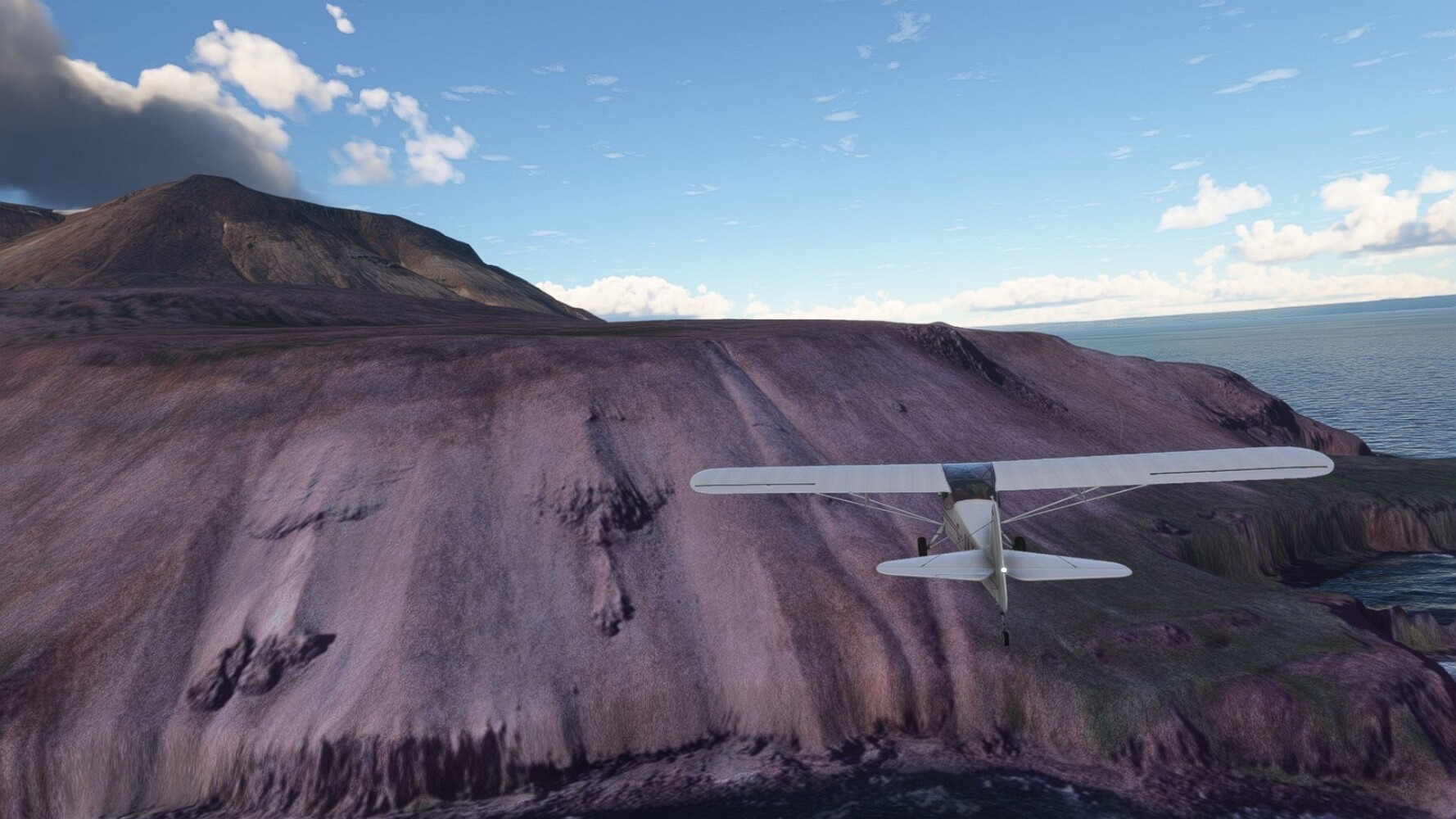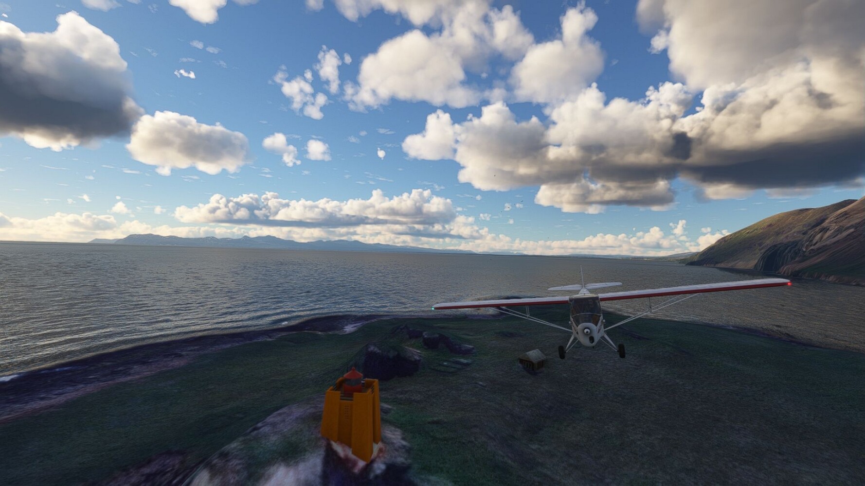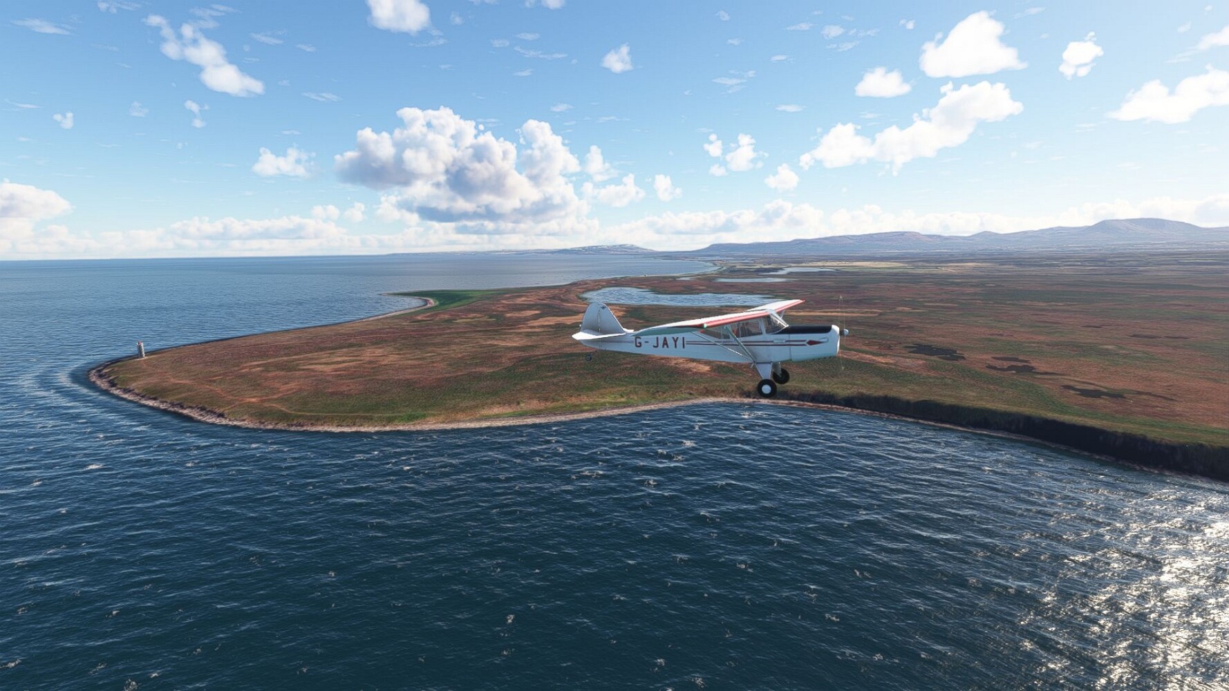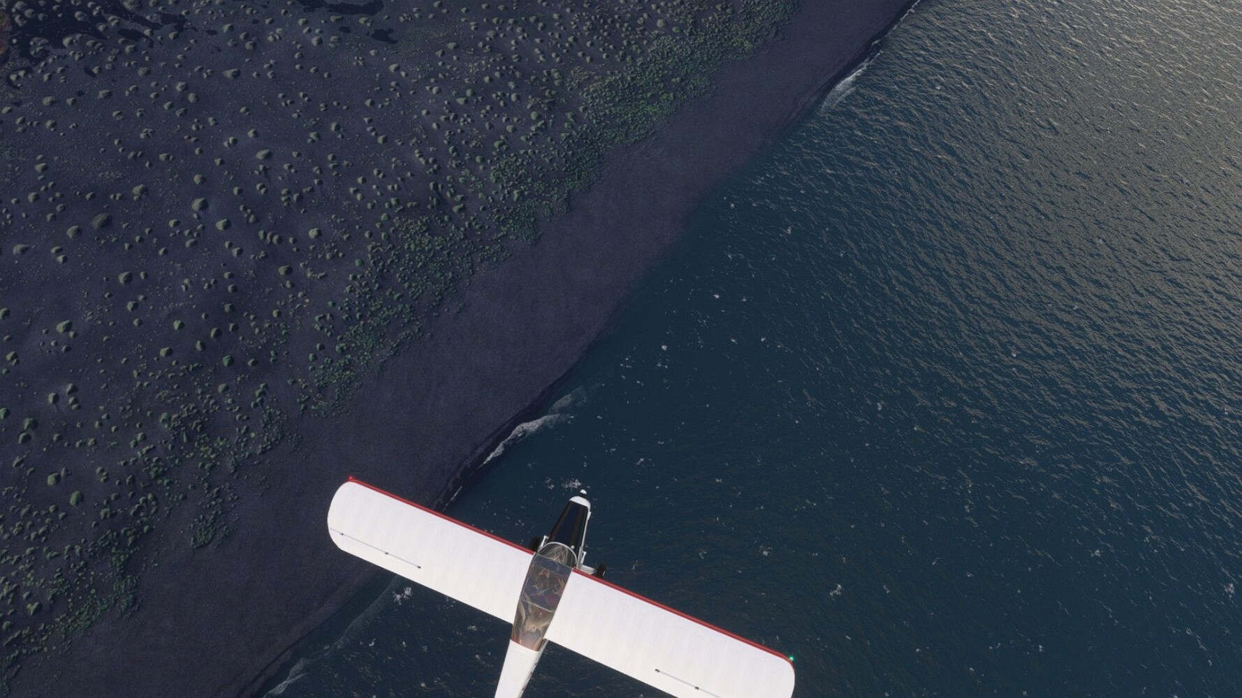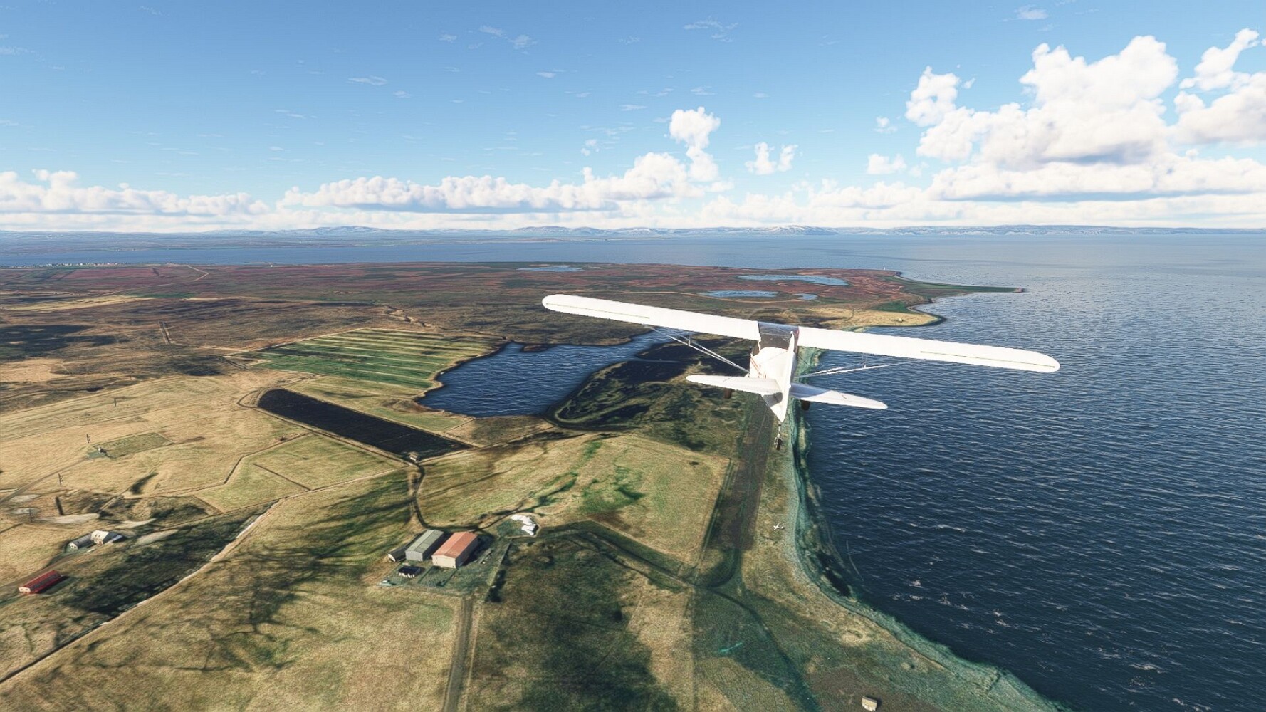 Start war in Borgarfjödur Eystri, BIBF Gleich gehts wieder an Steilhängen entlang. Kleine Buchten öffnen sich hier. Die Landschaft bleibt aber wild und die Berge steil. Der erste Leuchtturm dieser Etappe voraus, 32. der Umrundung. Es ist der von Kögur. Mit Schutzmauer und ohne leuchtenden Anstrich. Und sehr abgelegen. Dann kommt die weite Bucht von Heradsfloi. Mal wieder ein weiter, schwarzer Strand. Mal im Sommerlicht, ein anderes Wettertheam, passt nicht finde ich... so ist es besser. Die Nummer 33 findet sich auf einer kleinen Insel, die dem Kap vorgelagert ist. Es ist der Leuchtturm Bjarnarey. Eine kleine Festung, die Laterne eingekeilt zwischen den starken Eckpfeilern. Langsam werden die Berge flacher... und das Land weiter. Der kleine Flugplatz von Vöpnafjördur (BIVO) Der zugehörige Ort liegt auf der Halbinsel. Nördlich außerhalb des Ortes liegt der nächste Leuchtturm, die 34 in der bisherigen Zählung. Er nennt sich Kolbeinstangi Mal wieder ein klassisches isländisches Modell. Blick auf Vopnafjördur. Und weiter gehts Merkwürdige Begegnung, AI-Traffic auf Meereshöhe... Hier wirds nun ganz flach, mit einer Steilküste. Die steigt langsam an... Die Nummer 35 kommt in Sichtweite. Das Leuchtfeuer Digranes. Wieder ein klassisches Islandmodell. Die Küste steigt weiter an. Trogtäler zeugen von der vergangenen Vergletscherung. Hier ragt eine flache Halbinsel weit ins Meer. Und an ihrer Spitze einsam ein Leuchtfeuer. Sein Name ist Langanessviti, die Nummer 36. Drei Dutzend sind schon voll. Eine ganz andere Landschaft hier. Schneereste. Die 37 markierte die Bucht von Lonafjördur Auf meiner Karte ist er namenlos... Google sagt es ist der Turm von Grenjanes Es handelt sich wieder um ein Standardmodell Schon ist der nächste Landplatz in Sicht... Thorshofn BITN Teil 07Teil 09