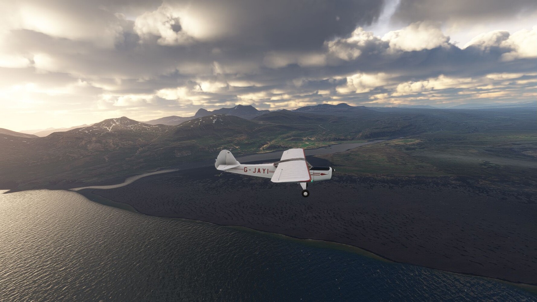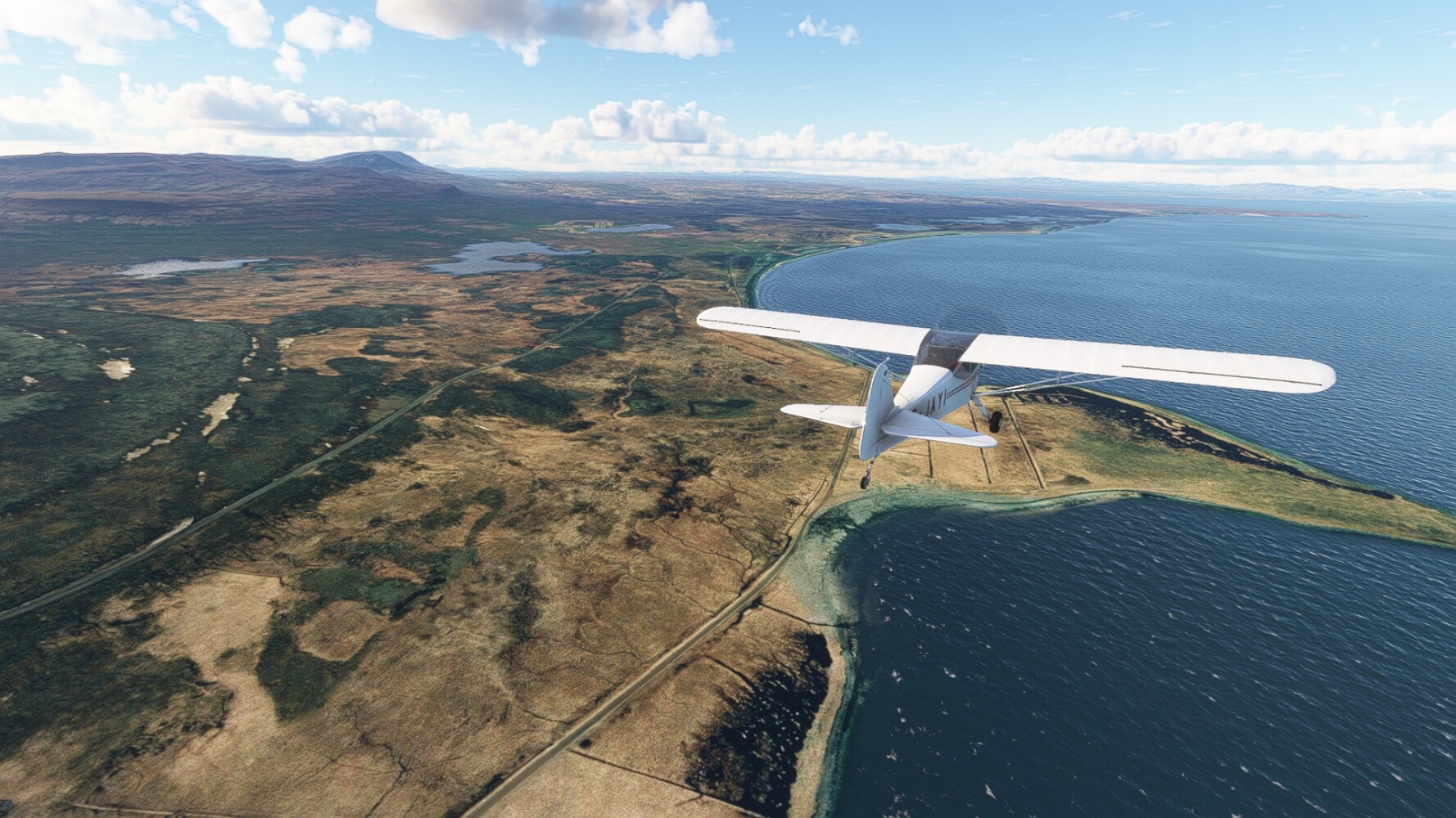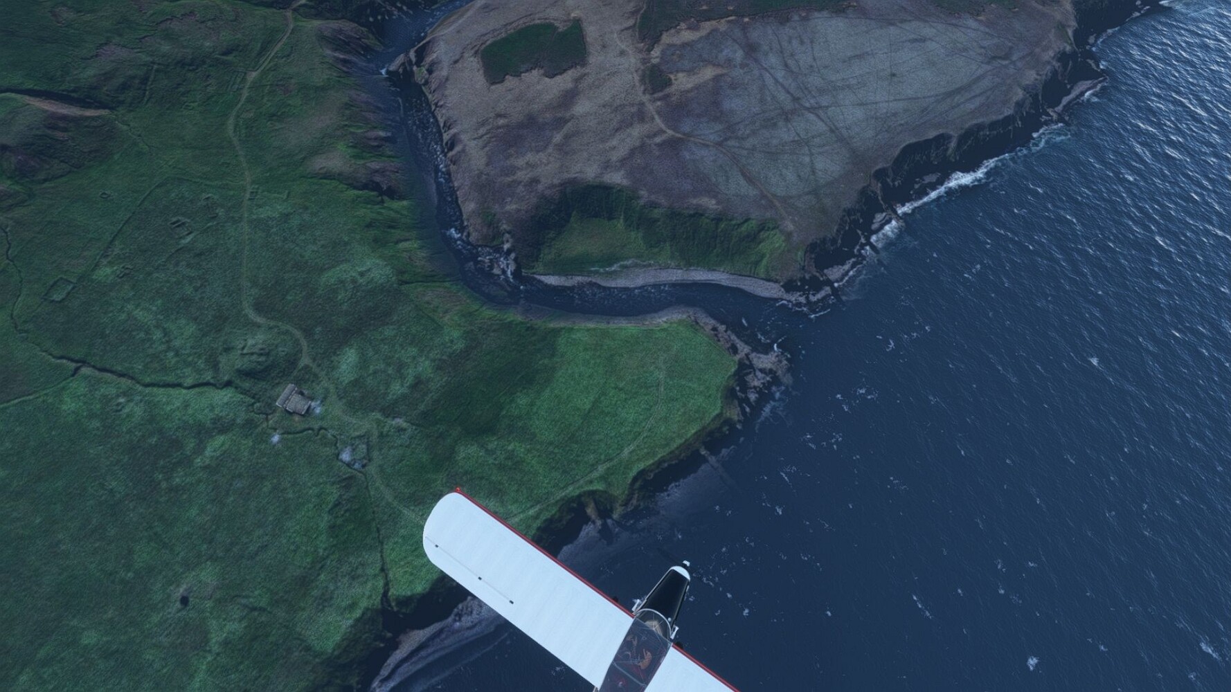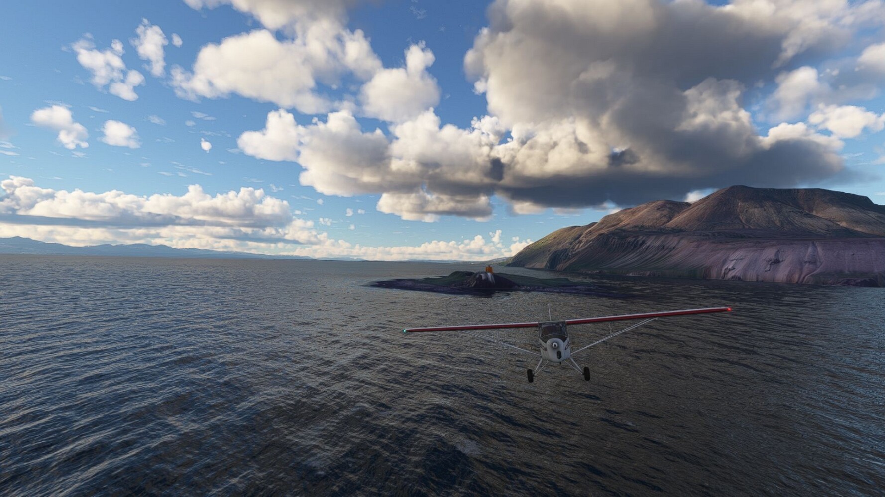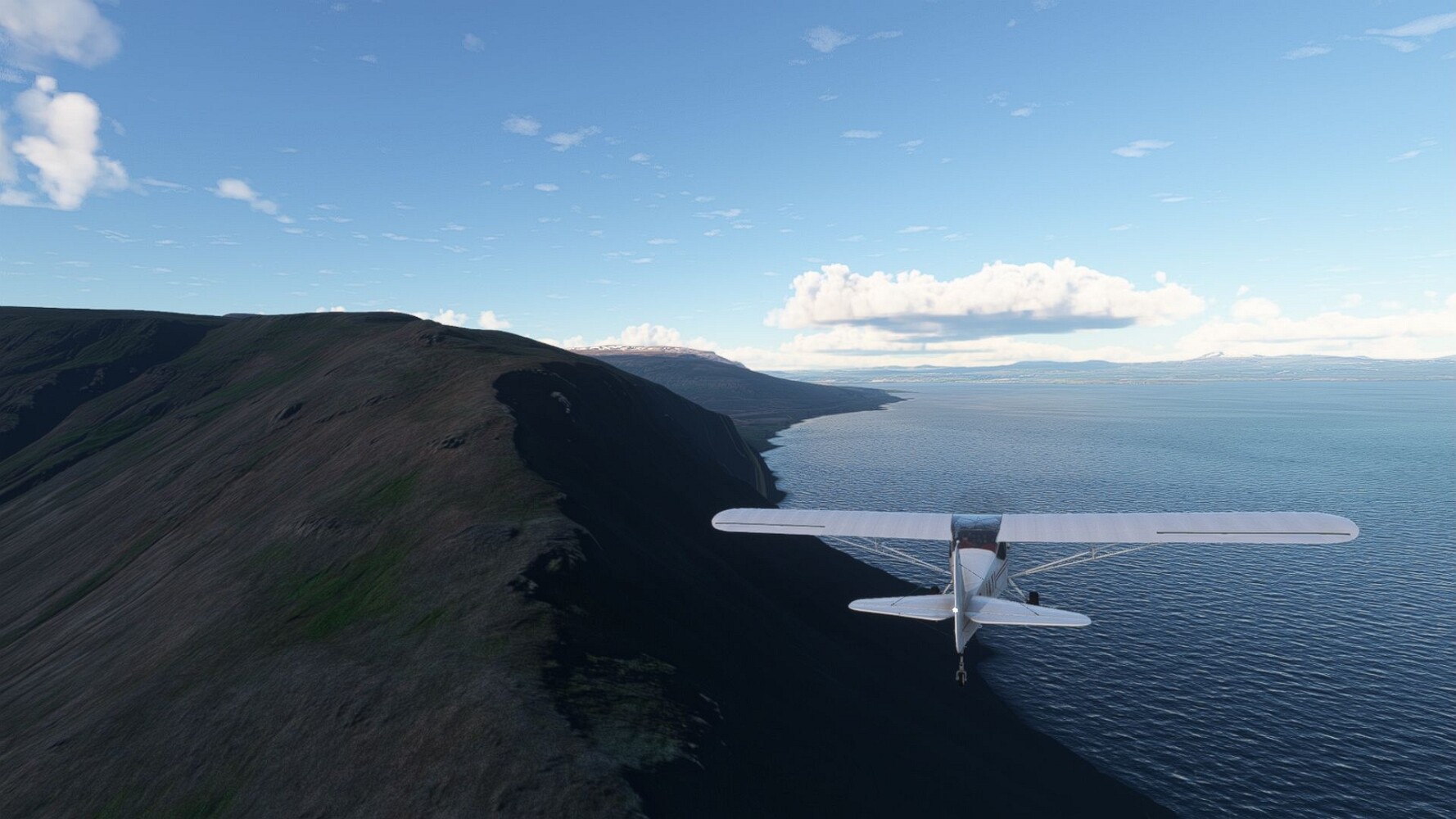Start war in Borgarfjödur Eystri, BIBF Gleich gehts wieder an Steilhängen entlang. Kleine Buchten öffnen sich hier. Die Landschaft bleibt aber wild und die Berge steil. Der erste Leuchtturm dieser Etappe voraus, 32. der Umrundung. Es ist der von Kögur. Mit Schutzmauer und ohne leuchtenden Anstrich. Und sehr abgelegen. Dann kommt die weite Bucht von Heradsfloi. Mal wieder ein weiter, schwarzer Strand. Mal im Sommerlicht, ein anderes Wettertheam, passt nicht finde ich... so ist es besser. Die Nummer 33 findet sich auf einer kleinen Insel, die dem Kap vorgelagert ist. Es ist der Leuchtturm Bjarnarey. Eine kleine Festung, die Laterne eingekeilt zwischen den starken Eckpfeilern. Langsam werden die Berge flacher... und das Land weiter. Der kleine Flugplatz von Vöpnafjördur (BIVO) Der zugehörige Ort liegt auf der Halbinsel. Nördlich außerhalb des Ortes liegt der nächste Leuchtturm, die 34 in der bisherigen Zählung. Er nennt sich Kolbeinstangi Mal wieder ein klassisches isländisches Modell. Blick auf Vopnafjördur. Und weiter gehts Merkwürdige Begegnung, AI-Traffic auf Meereshöhe... Hier wirds nun ganz flach, mit einer Steilküste. Die steigt langsam an... Die Nummer 35 kommt in Sichtweite. Das Leuchtfeuer Digranes. Wieder ein klassisches Islandmodell. Die Küste steigt weiter an. Trogtäler zeugen von der vergangenen Vergletscherung. Hier ragt eine flache Halbinsel weit ins Meer. Und an ihrer Spitze einsam ein Leuchtfeuer. Sein Name ist Langanessviti, die Nummer 36. Drei Dutzend sind schon voll. Eine ganz andere Landschaft hier. Schneereste. Die 37 markierte die Bucht von Lonafjördur Auf meiner Karte ist er namenlos... Google sagt es ist der Turm von Grenjanes Es handelt sich wieder um ein Standardmodell Schon ist der nächste Landplatz in Sicht... Thorshofn BITN Teil 07Teil 09