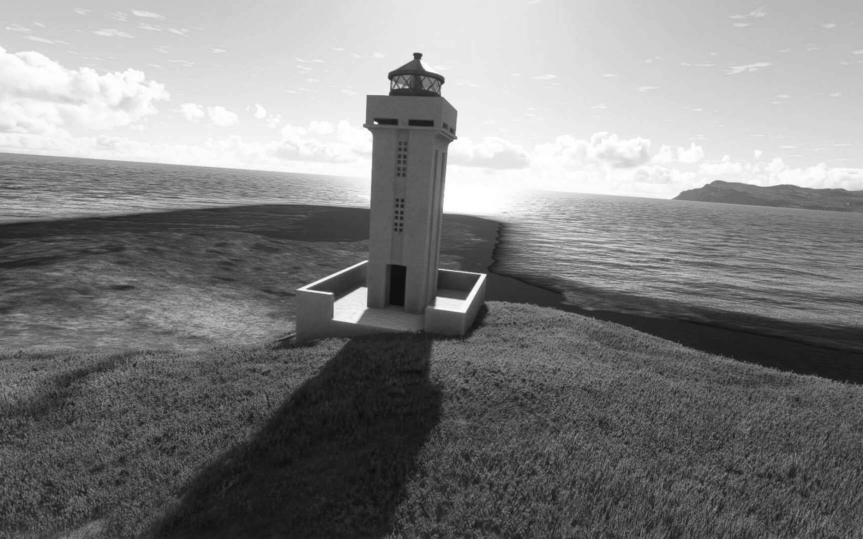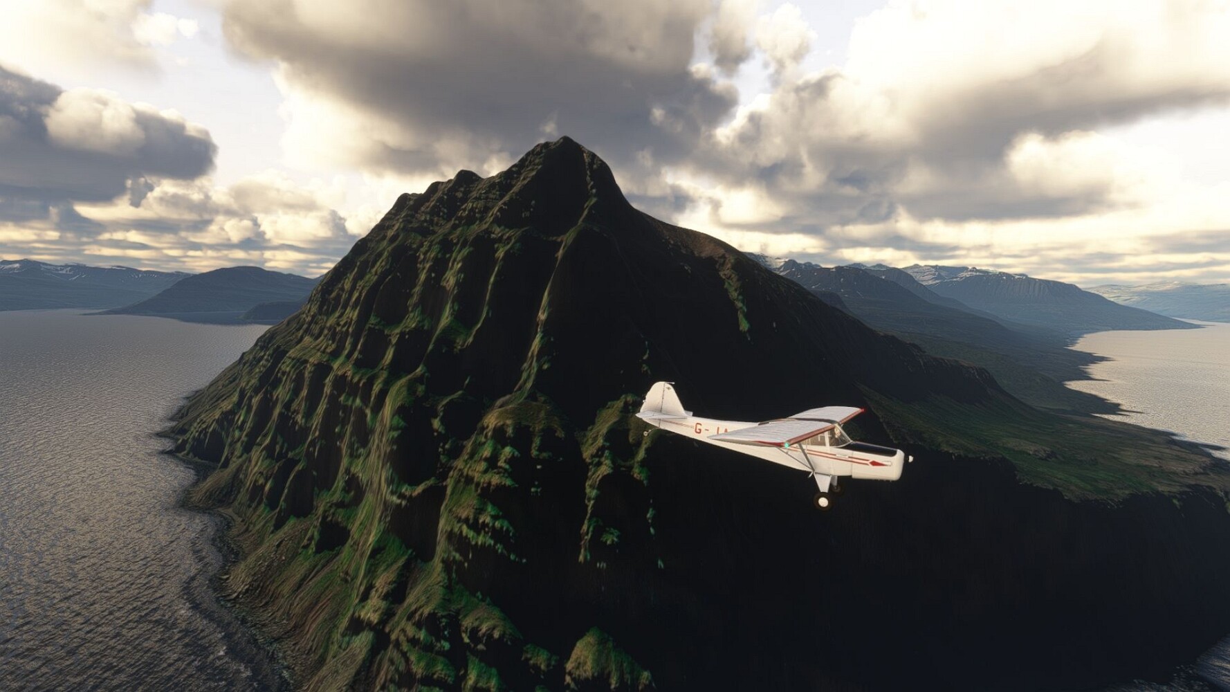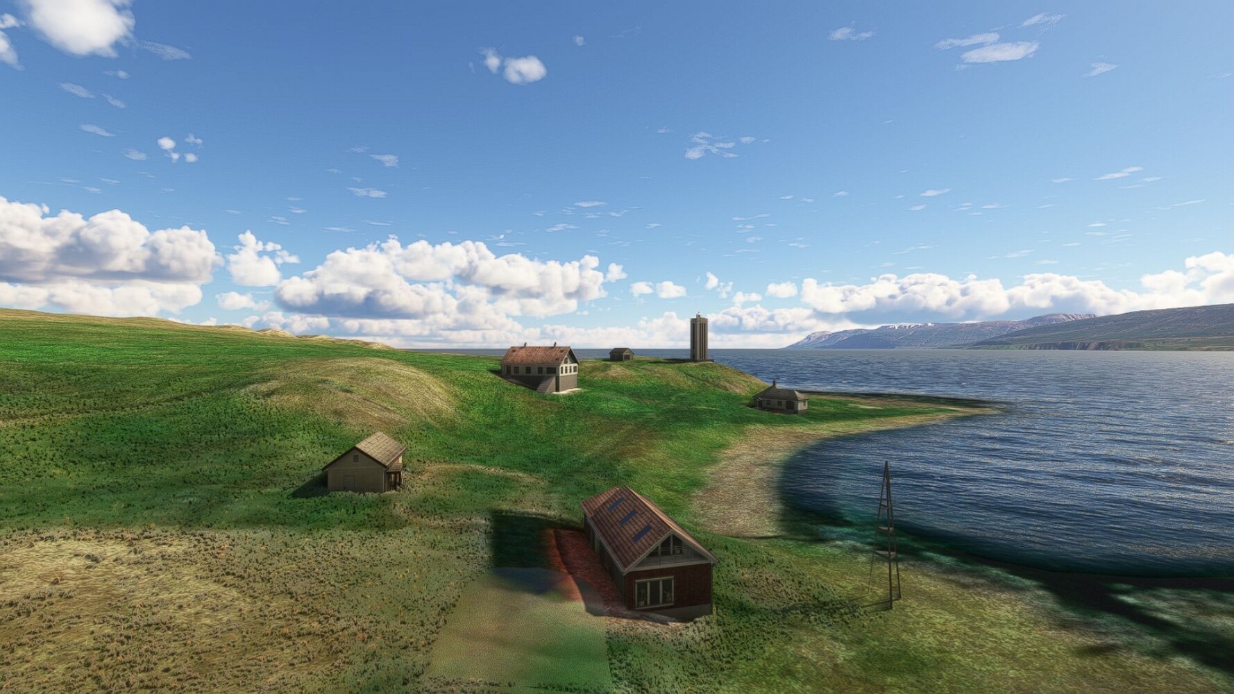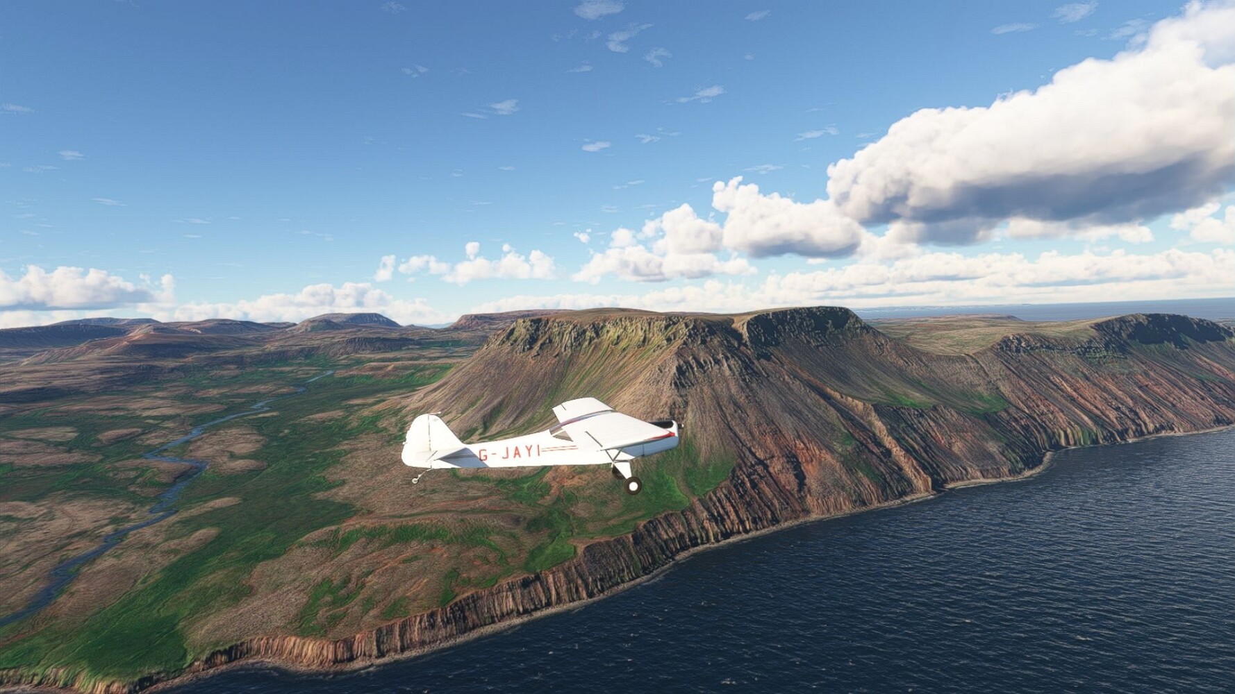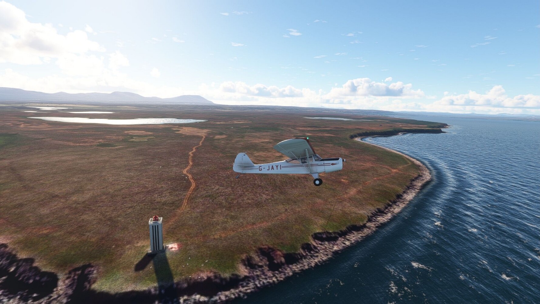 Start war in Borgarfjödur Eystri, BIBF Gleich gehts wieder an Steilhängen entlang. Kleine Buchten öffnen sich hier. Die Landschaft bleibt aber wild und die Berge steil. Der erste Leuchtturm dieser Etappe voraus, 32. der Umrundung. Es ist der von Kögur. Mit Schutzmauer und ohne leuchtenden Anstrich. Und sehr abgelegen. Dann kommt die weite Bucht von Heradsfloi. Mal wieder ein weiter, schwarzer Strand. Mal im Sommerlicht, ein anderes Wettertheam, passt nicht finde ich... so ist es besser. Die Nummer 33 findet sich auf einer kleinen Insel, die dem Kap vorgelagert ist. Es ist der Leuchtturm Bjarnarey. Eine kleine Festung, die Laterne eingekeilt zwischen den starken Eckpfeilern. Langsam werden die Berge flacher... und das Land weiter. Der kleine Flugplatz von Vöpnafjördur (BIVO) Der zugehörige Ort liegt auf der Halbinsel. Nördlich außerhalb des Ortes liegt der nächste Leuchtturm, die 34 in der bisherigen Zählung. Er nennt sich Kolbeinstangi Mal wieder ein klassisches isländisches Modell. Blick auf Vopnafjördur. Und weiter gehts Merkwürdige Begegnung, AI-Traffic auf Meereshöhe... Hier wirds nun ganz flach, mit einer Steilküste. Die steigt langsam an... Die Nummer 35 kommt in Sichtweite. Das Leuchtfeuer Digranes. Wieder ein klassisches Islandmodell. Die Küste steigt weiter an. Trogtäler zeugen von der vergangenen Vergletscherung. Hier ragt eine flache Halbinsel weit ins Meer. Und an ihrer Spitze einsam ein Leuchtfeuer. Sein Name ist Langanessviti, die Nummer 36. Drei Dutzend sind schon voll. Eine ganz andere Landschaft hier. Schneereste. Die 37 markierte die Bucht von Lonafjördur Auf meiner Karte ist er namenlos... Google sagt es ist der Turm von Grenjanes Es handelt sich wieder um ein Standardmodell Schon ist der nächste Landplatz in Sicht... Thorshofn BITN Teil 07Teil 09