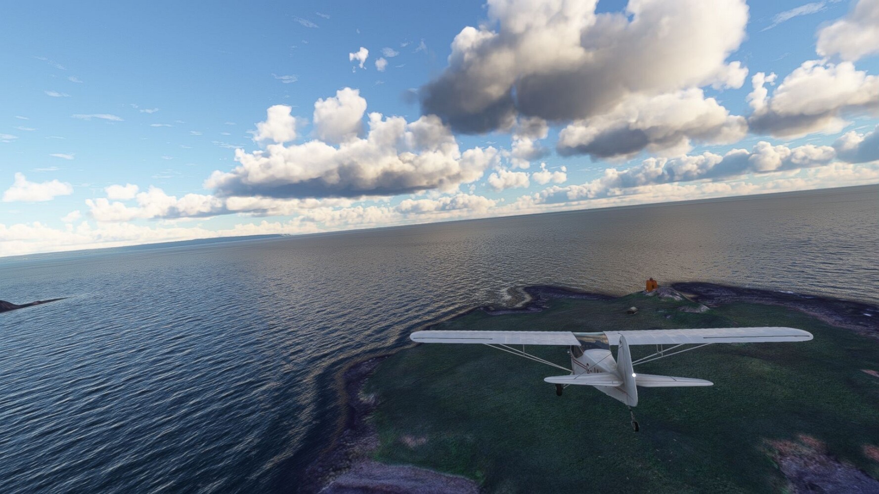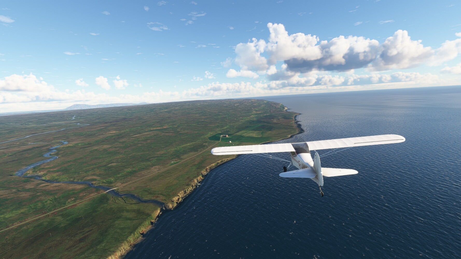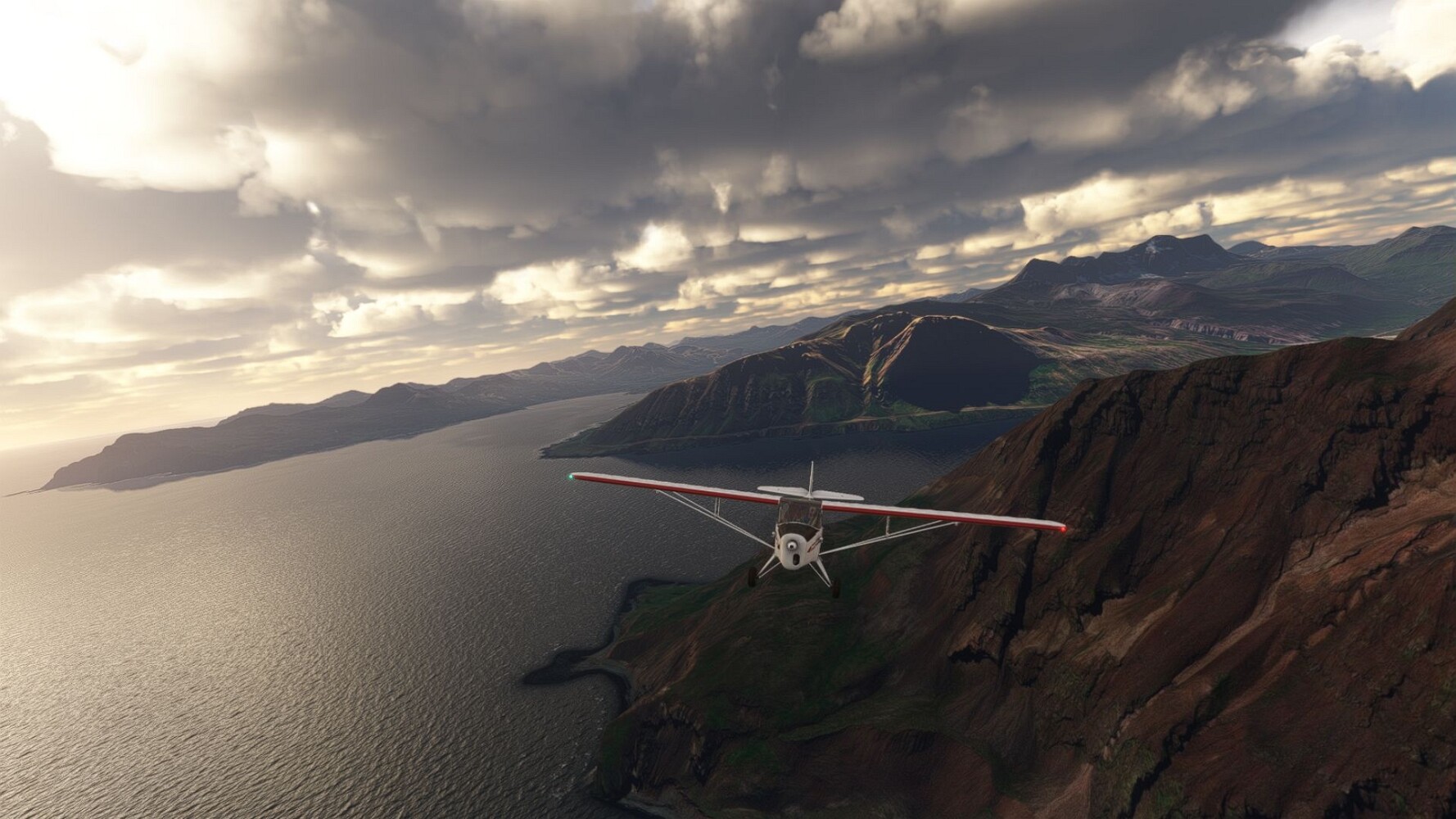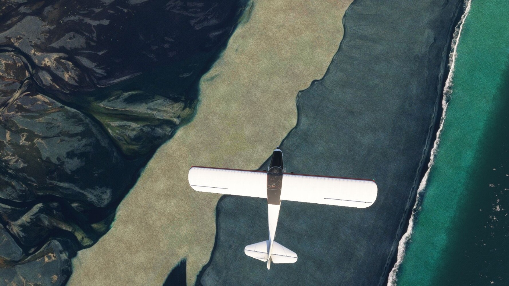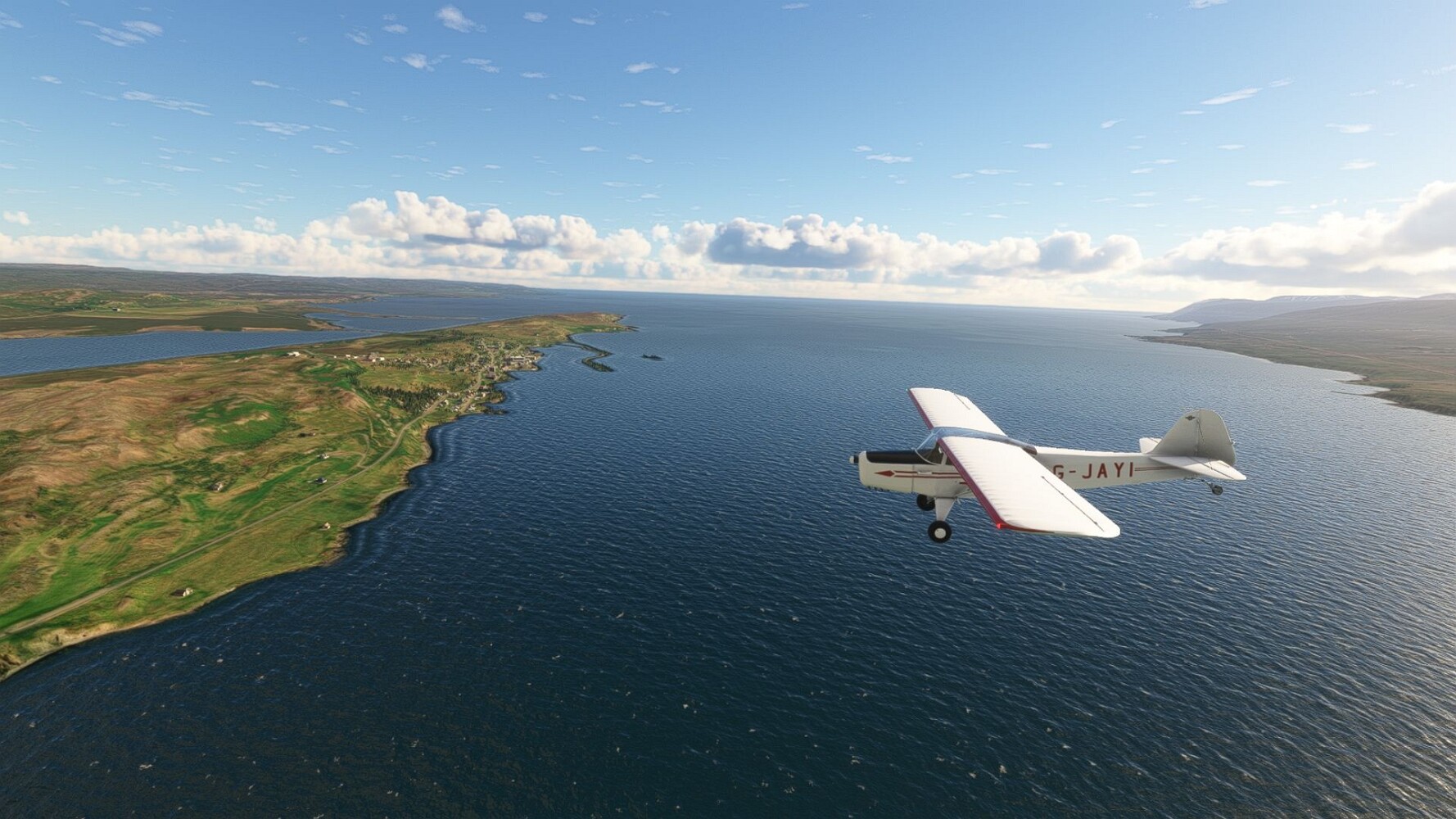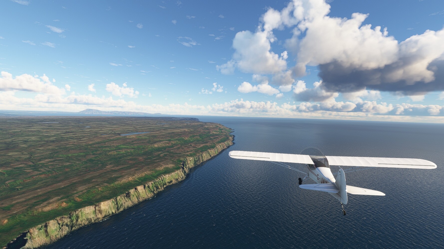 Start war in Borgarfjödur Eystri, BIBF Gleich gehts wieder an Steilhängen entlang. Kleine Buchten öffnen sich hier. Die Landschaft bleibt aber wild und die Berge steil. Der erste Leuchtturm dieser Etappe voraus, 32. der Umrundung. Es ist der von Kögur. Mit Schutzmauer und ohne leuchtenden Anstrich. Und sehr abgelegen. Dann kommt die weite Bucht von Heradsfloi. Mal wieder ein weiter, schwarzer Strand. Mal im Sommerlicht, ein anderes Wettertheam, passt nicht finde ich... so ist es besser. Die Nummer 33 findet sich auf einer kleinen Insel, die dem Kap vorgelagert ist. Es ist der Leuchtturm Bjarnarey. Eine kleine Festung, die Laterne eingekeilt zwischen den starken Eckpfeilern. Langsam werden die Berge flacher... und das Land weiter. Der kleine Flugplatz von Vöpnafjördur (BIVO) Der zugehörige Ort liegt auf der Halbinsel. Nördlich außerhalb des Ortes liegt der nächste Leuchtturm, die 34 in der bisherigen Zählung. Er nennt sich Kolbeinstangi Mal wieder ein klassisches isländisches Modell. Blick auf Vopnafjördur. Und weiter gehts Merkwürdige Begegnung, AI-Traffic auf Meereshöhe... Hier wirds nun ganz flach, mit einer Steilküste. Die steigt langsam an... Die Nummer 35 kommt in Sichtweite. Das Leuchtfeuer Digranes. Wieder ein klassisches Islandmodell. Die Küste steigt weiter an. Trogtäler zeugen von der vergangenen Vergletscherung. Hier ragt eine flache Halbinsel weit ins Meer. Und an ihrer Spitze einsam ein Leuchtfeuer. Sein Name ist Langanessviti, die Nummer 36. Drei Dutzend sind schon voll. Eine ganz andere Landschaft hier. Schneereste. Die 37 markierte die Bucht von Lonafjördur Auf meiner Karte ist er namenlos... Google sagt es ist der Turm von Grenjanes Es handelt sich wieder um ein Standardmodell Schon ist der nächste Landplatz in Sicht... Thorshofn BITN Teil 07Teil 09