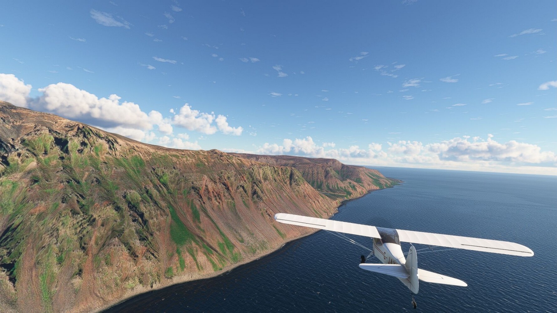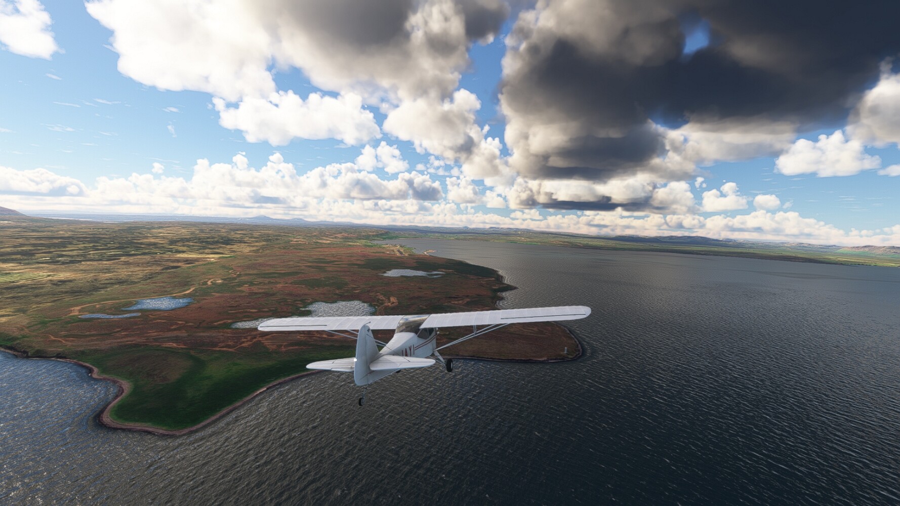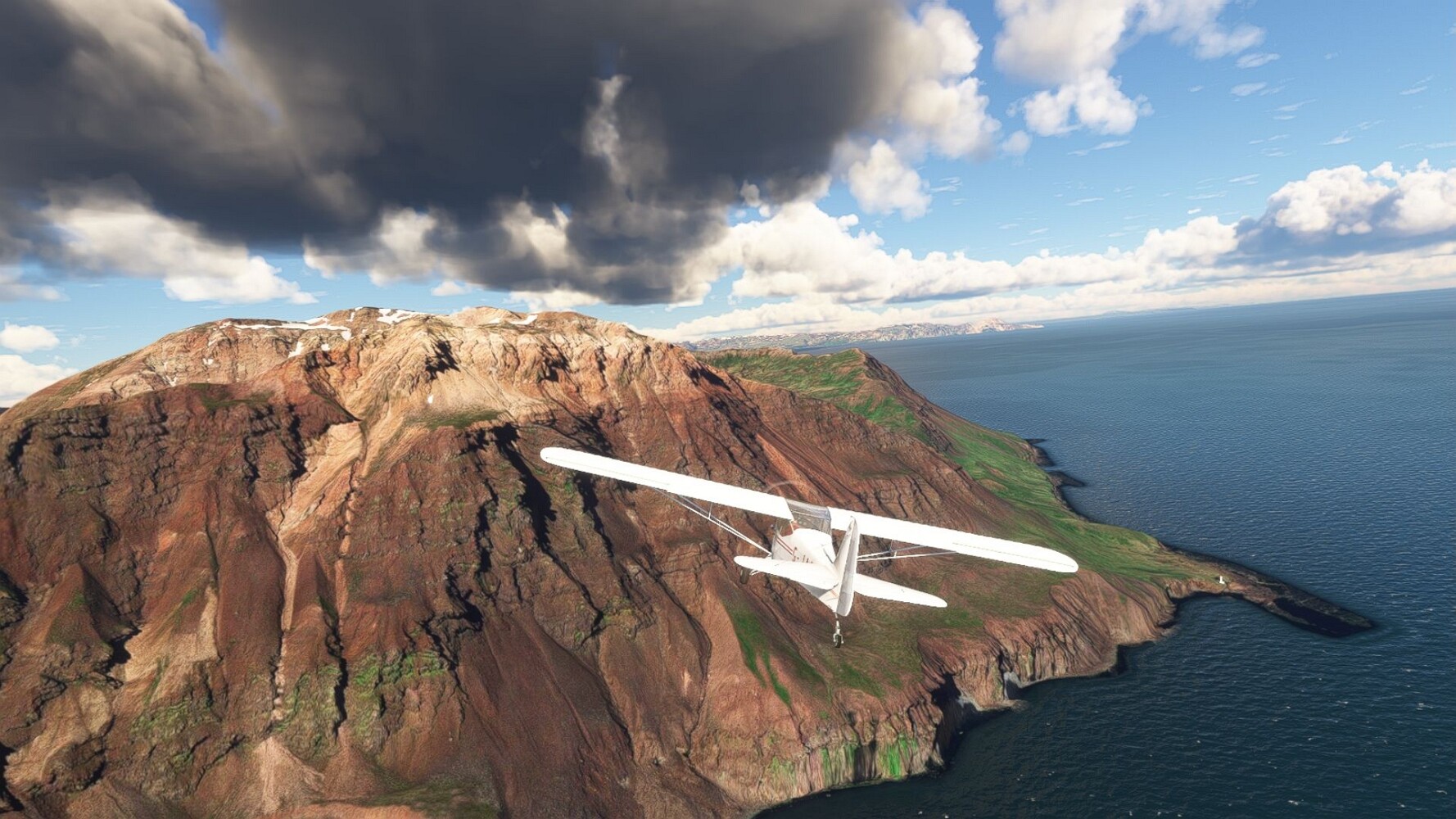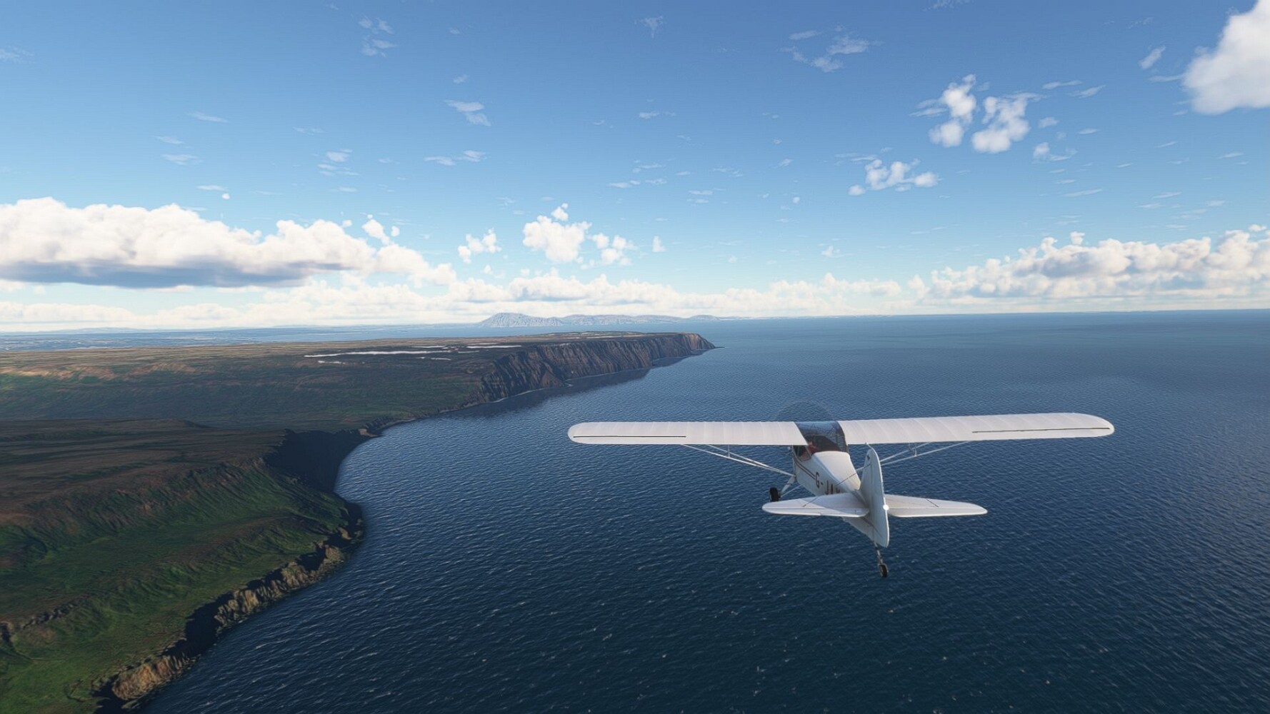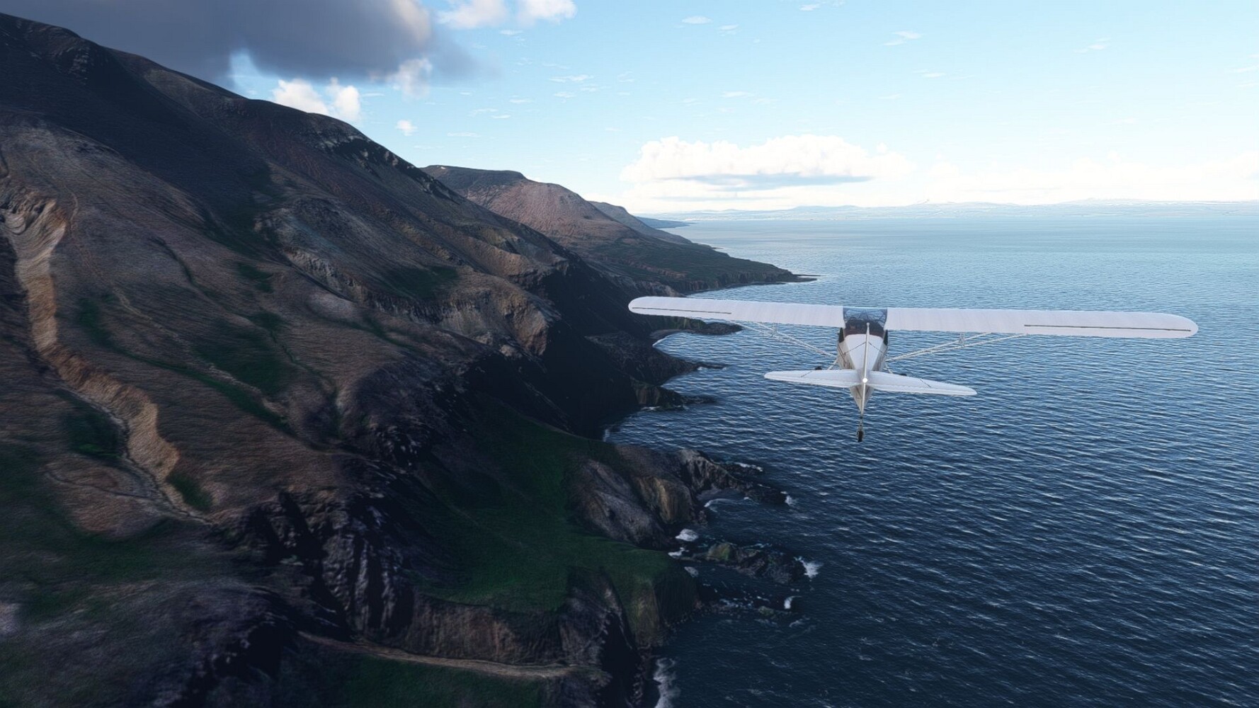 Start war in Borgarfjödur Eystri, BIBF Gleich gehts wieder an Steilhängen entlang. Kleine Buchten öffnen sich hier. Die Landschaft bleibt aber wild und die Berge steil. Der erste Leuchtturm dieser Etappe voraus, 32. der Umrundung. Es ist der von Kögur. Mit Schutzmauer und ohne leuchtenden Anstrich. Und sehr abgelegen. Dann kommt die weite Bucht von Heradsfloi. Mal wieder ein weiter, schwarzer Strand. Mal im Sommerlicht, ein anderes Wettertheam, passt nicht finde ich... so ist es besser. Die Nummer 33 findet sich auf einer kleinen Insel, die dem Kap vorgelagert ist. Es ist der Leuchtturm Bjarnarey. Eine kleine Festung, die Laterne eingekeilt zwischen den starken Eckpfeilern. Langsam werden die Berge flacher... und das Land weiter. Der kleine Flugplatz von Vöpnafjördur (BIVO) Der zugehörige Ort liegt auf der Halbinsel. Nördlich außerhalb des Ortes liegt der nächste Leuchtturm, die 34 in der bisherigen Zählung. Er nennt sich Kolbeinstangi Mal wieder ein klassisches isländisches Modell. Blick auf Vopnafjördur. Und weiter gehts Merkwürdige Begegnung, AI-Traffic auf Meereshöhe... Hier wirds nun ganz flach, mit einer Steilküste. Die steigt langsam an... Die Nummer 35 kommt in Sichtweite. Das Leuchtfeuer Digranes. Wieder ein klassisches Islandmodell. Die Küste steigt weiter an. Trogtäler zeugen von der vergangenen Vergletscherung. Hier ragt eine flache Halbinsel weit ins Meer. Und an ihrer Spitze einsam ein Leuchtfeuer. Sein Name ist Langanessviti, die Nummer 36. Drei Dutzend sind schon voll. Eine ganz andere Landschaft hier. Schneereste. Die 37 markierte die Bucht von Lonafjördur Auf meiner Karte ist er namenlos... Google sagt es ist der Turm von Grenjanes Es handelt sich wieder um ein Standardmodell Schon ist der nächste Landplatz in Sicht... Thorshofn BITN Teil 07Teil 09