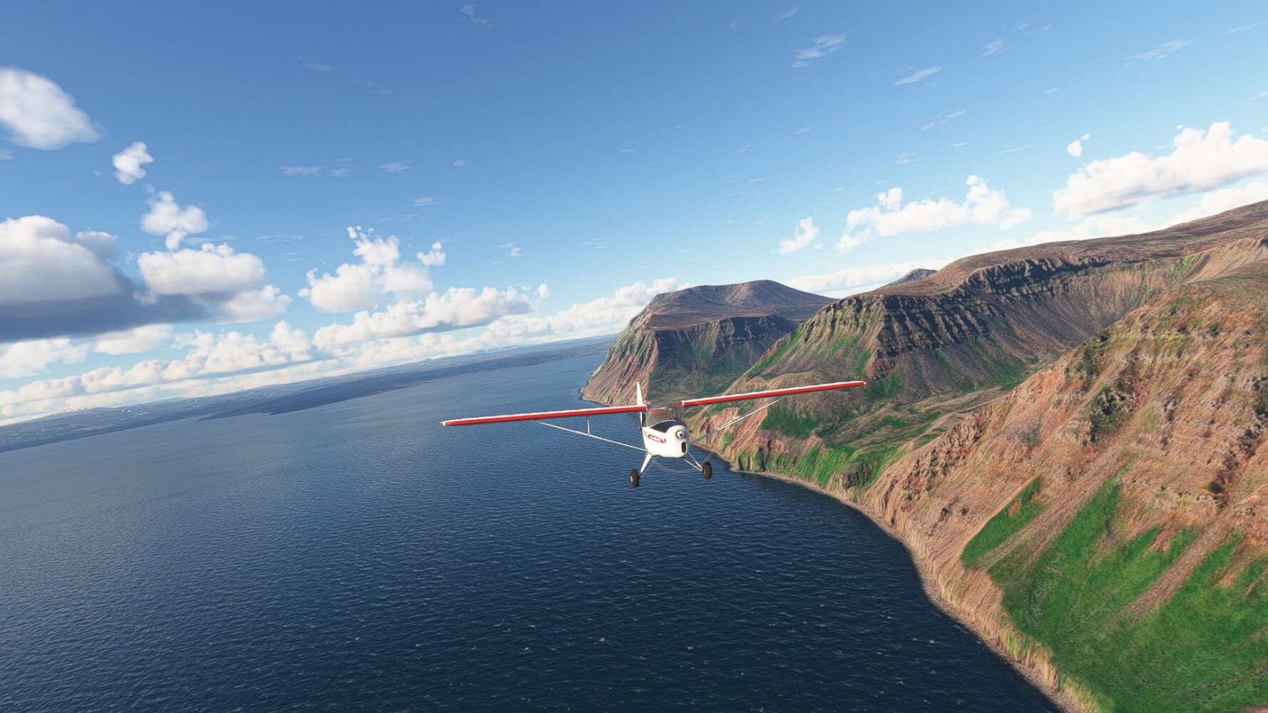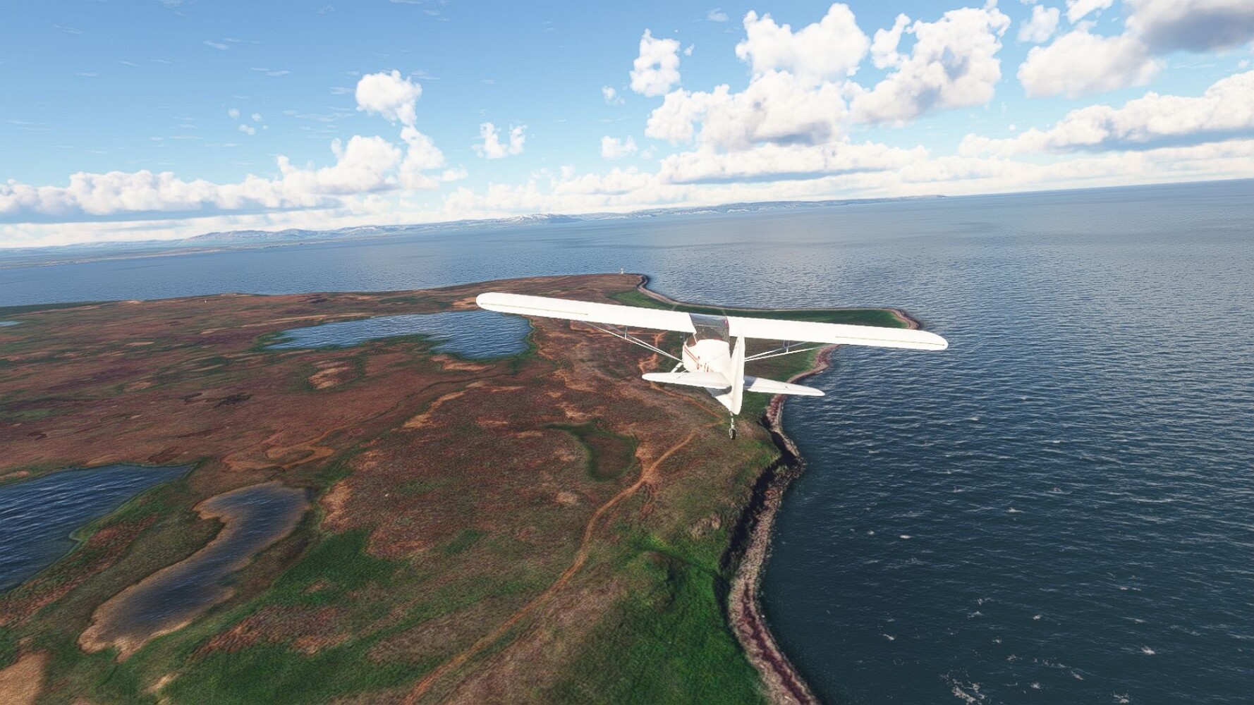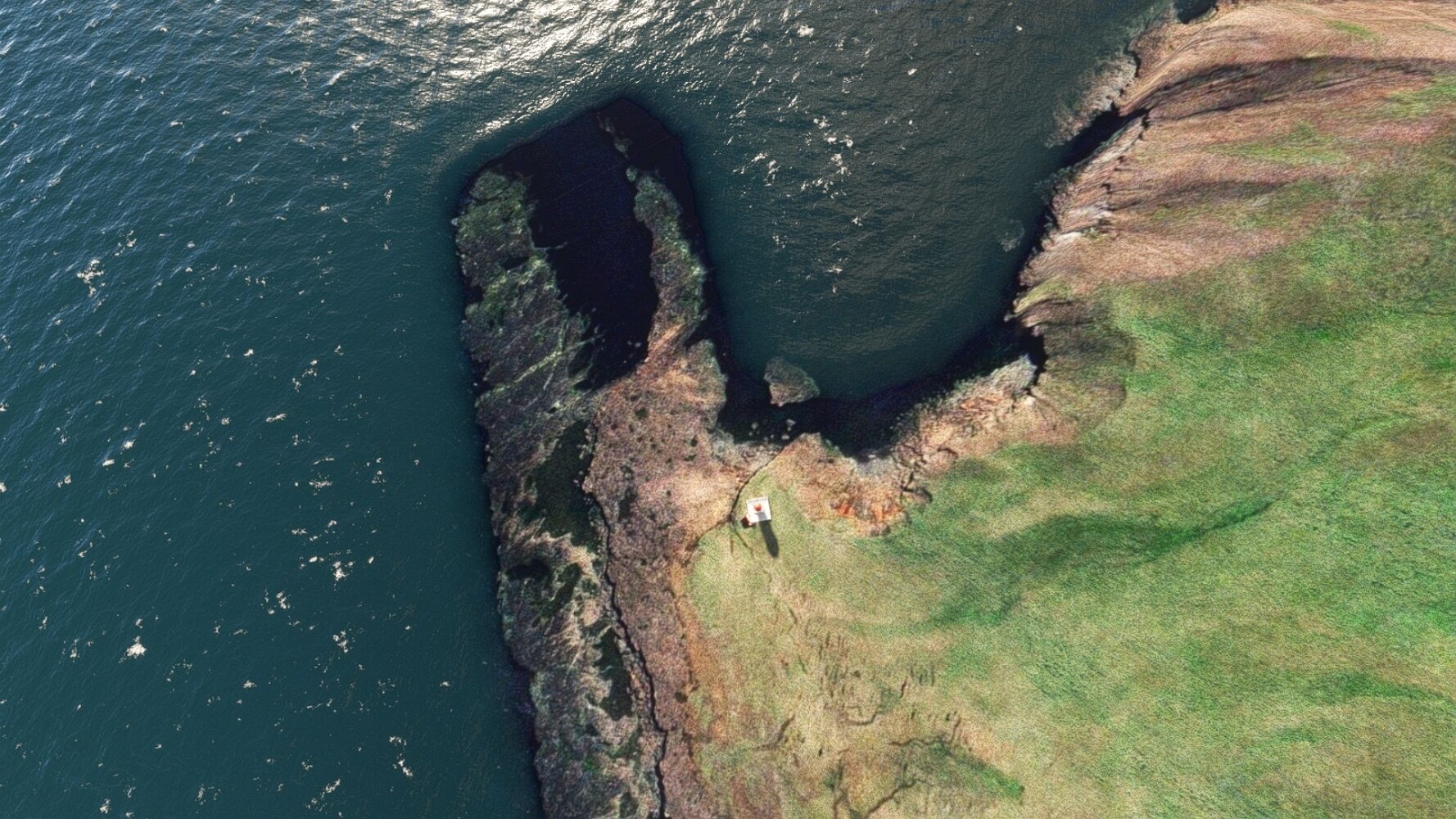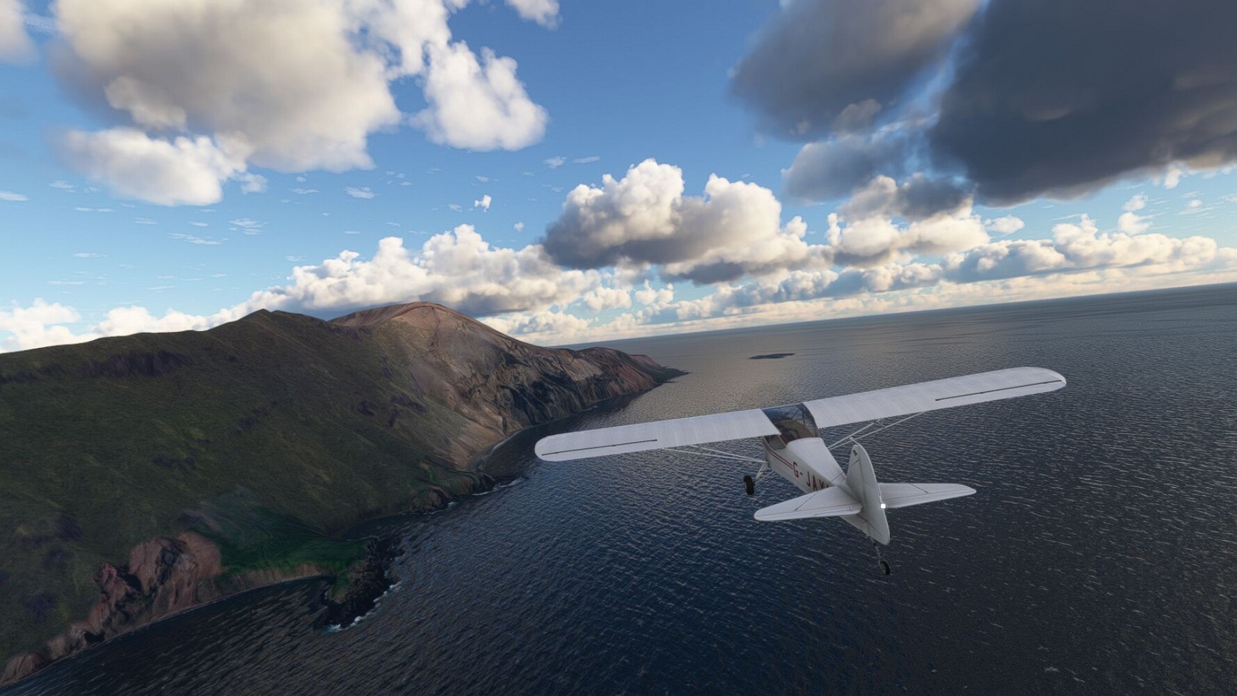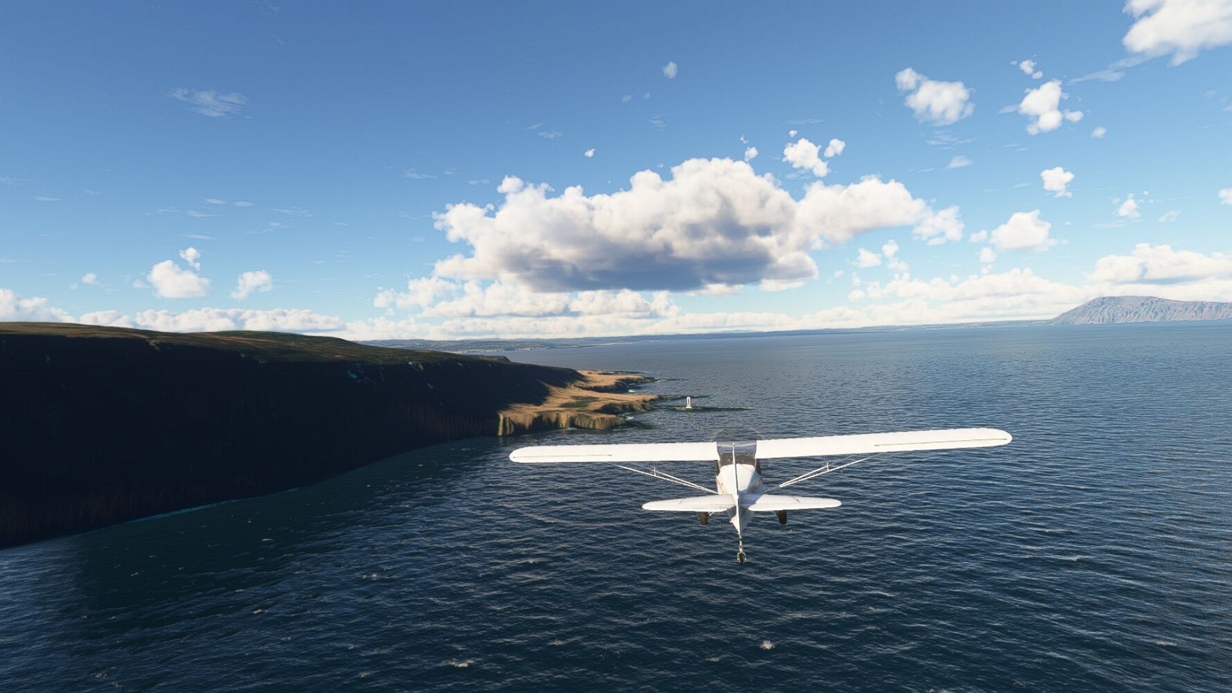 Start war in Borgarfjödur Eystri, BIBF Gleich gehts wieder an Steilhängen entlang. Kleine Buchten öffnen sich hier. Die Landschaft bleibt aber wild und die Berge steil. Der erste Leuchtturm dieser Etappe voraus, 32. der Umrundung. Es ist der von Kögur. Mit Schutzmauer und ohne leuchtenden Anstrich. Und sehr abgelegen. Dann kommt die weite Bucht von Heradsfloi. Mal wieder ein weiter, schwarzer Strand. Mal im Sommerlicht, ein anderes Wettertheam, passt nicht finde ich... so ist es besser. Die Nummer 33 findet sich auf einer kleinen Insel, die dem Kap vorgelagert ist. Es ist der Leuchtturm Bjarnarey. Eine kleine Festung, die Laterne eingekeilt zwischen den starken Eckpfeilern. Langsam werden die Berge flacher... und das Land weiter. Der kleine Flugplatz von Vöpnafjördur (BIVO) Der zugehörige Ort liegt auf der Halbinsel. Nördlich außerhalb des Ortes liegt der nächste Leuchtturm, die 34 in der bisherigen Zählung. Er nennt sich Kolbeinstangi Mal wieder ein klassisches isländisches Modell. Blick auf Vopnafjördur. Und weiter gehts Merkwürdige Begegnung, AI-Traffic auf Meereshöhe... Hier wirds nun ganz flach, mit einer Steilküste. Die steigt langsam an... Die Nummer 35 kommt in Sichtweite. Das Leuchtfeuer Digranes. Wieder ein klassisches Islandmodell. Die Küste steigt weiter an. Trogtäler zeugen von der vergangenen Vergletscherung. Hier ragt eine flache Halbinsel weit ins Meer. Und an ihrer Spitze einsam ein Leuchtfeuer. Sein Name ist Langanessviti, die Nummer 36. Drei Dutzend sind schon voll. Eine ganz andere Landschaft hier. Schneereste. Die 37 markierte die Bucht von Lonafjördur Auf meiner Karte ist er namenlos... Google sagt es ist der Turm von Grenjanes Es handelt sich wieder um ein Standardmodell Schon ist der nächste Landplatz in Sicht... Thorshofn BITN Teil 07Teil 09