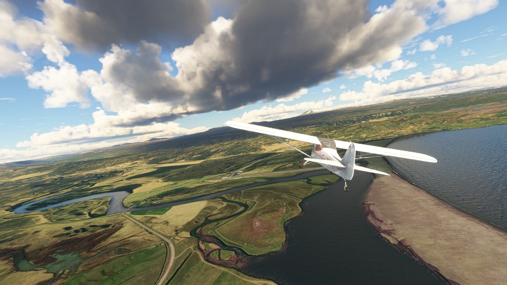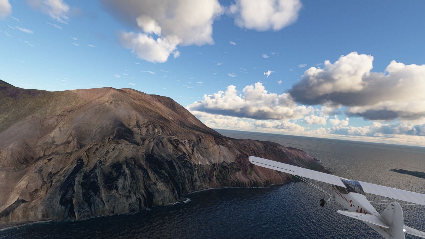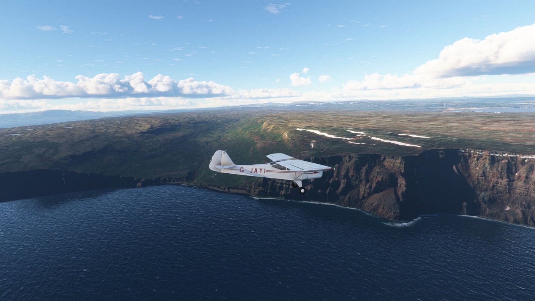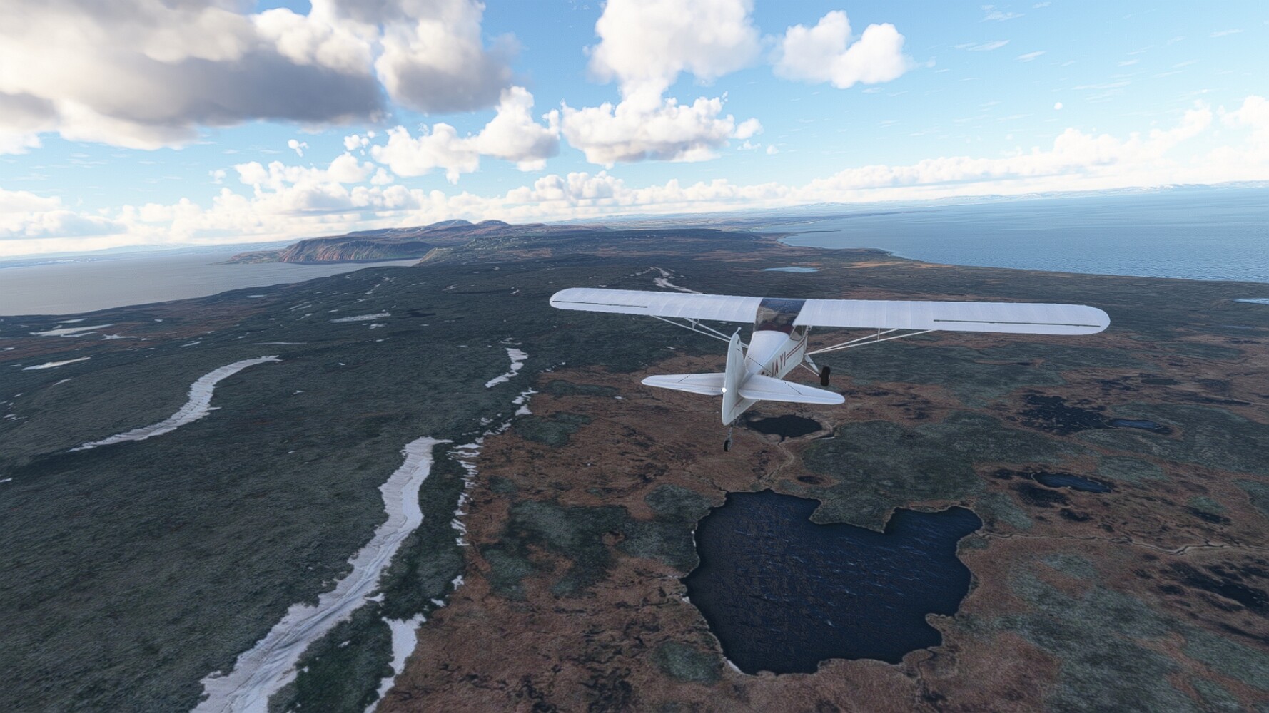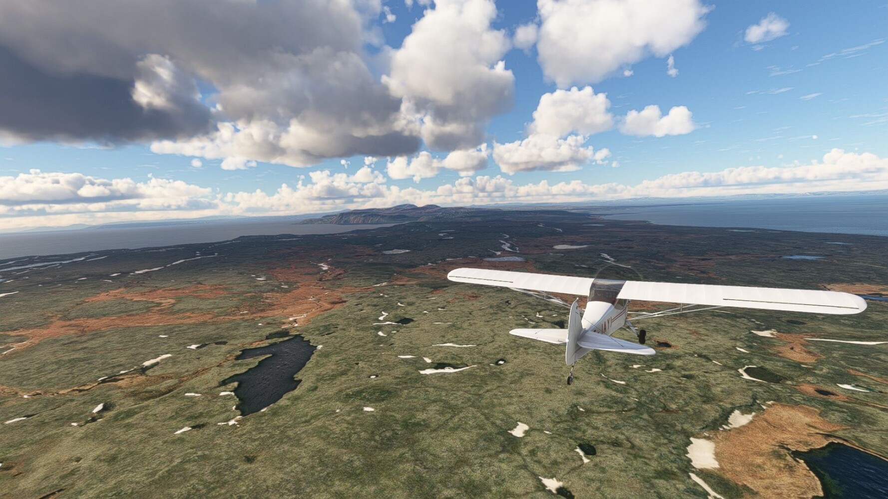 Start war in Borgarfjödur Eystri, BIBF Gleich gehts wieder an Steilhängen entlang. Kleine Buchten öffnen sich hier. Die Landschaft bleibt aber wild und die Berge steil. Der erste Leuchtturm dieser Etappe voraus, 32. der Umrundung. Es ist der von Kögur. Mit Schutzmauer und ohne leuchtenden Anstrich. Und sehr abgelegen. Dann kommt die weite Bucht von Heradsfloi. Mal wieder ein weiter, schwarzer Strand. Mal im Sommerlicht, ein anderes Wettertheam, passt nicht finde ich... so ist es besser. Die Nummer 33 findet sich auf einer kleinen Insel, die dem Kap vorgelagert ist. Es ist der Leuchtturm Bjarnarey. Eine kleine Festung, die Laterne eingekeilt zwischen den starken Eckpfeilern. Langsam werden die Berge flacher... und das Land weiter. Der kleine Flugplatz von Vöpnafjördur (BIVO) Der zugehörige Ort liegt auf der Halbinsel. Nördlich außerhalb des Ortes liegt der nächste Leuchtturm, die 34 in der bisherigen Zählung. Er nennt sich Kolbeinstangi Mal wieder ein klassisches isländisches Modell. Blick auf Vopnafjördur. Und weiter gehts Merkwürdige Begegnung, AI-Traffic auf Meereshöhe... Hier wirds nun ganz flach, mit einer Steilküste. Die steigt langsam an... Die Nummer 35 kommt in Sichtweite. Das Leuchtfeuer Digranes. Wieder ein klassisches Islandmodell. Die Küste steigt weiter an. Trogtäler zeugen von der vergangenen Vergletscherung. Hier ragt eine flache Halbinsel weit ins Meer. Und an ihrer Spitze einsam ein Leuchtfeuer. Sein Name ist Langanessviti, die Nummer 36. Drei Dutzend sind schon voll. Eine ganz andere Landschaft hier. Schneereste. Die 37 markierte die Bucht von Lonafjördur Auf meiner Karte ist er namenlos... Google sagt es ist der Turm von Grenjanes Es handelt sich wieder um ein Standardmodell Schon ist der nächste Landplatz in Sicht... Thorshofn BITN Teil 07Teil 09