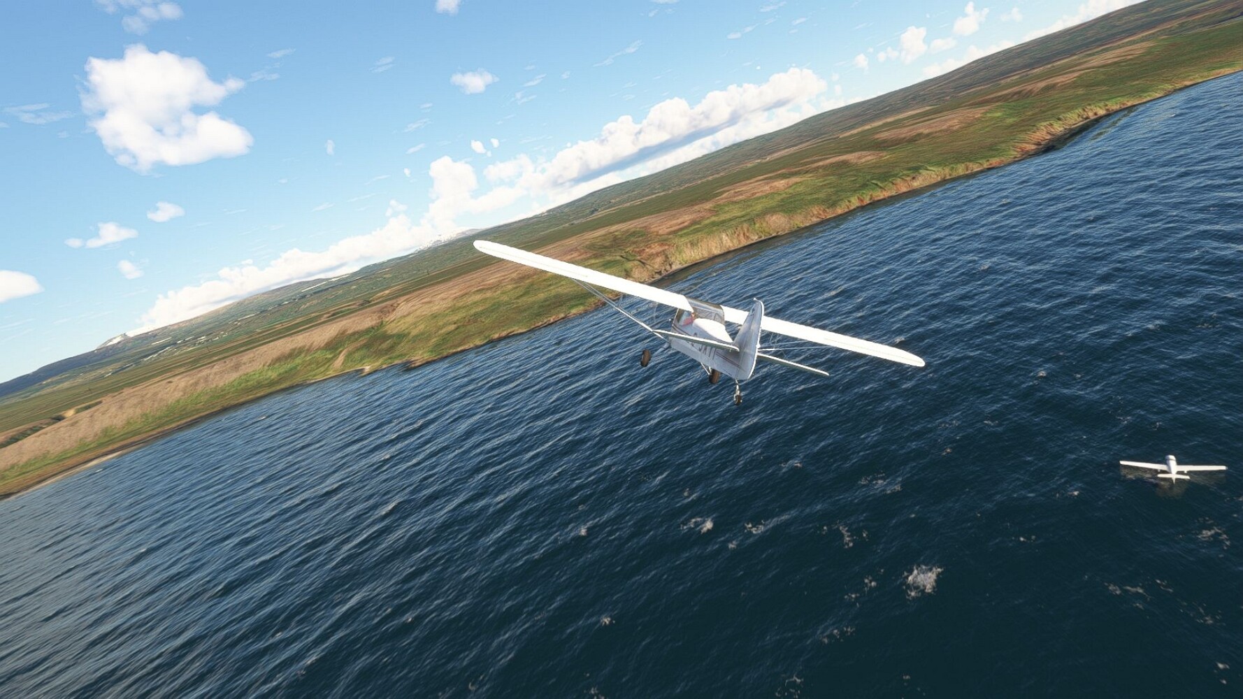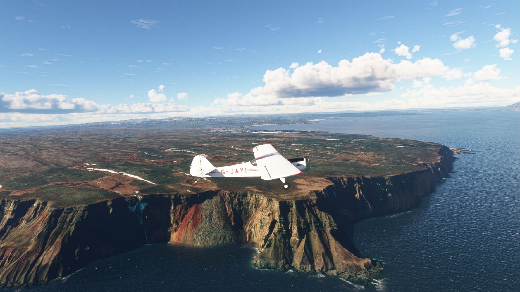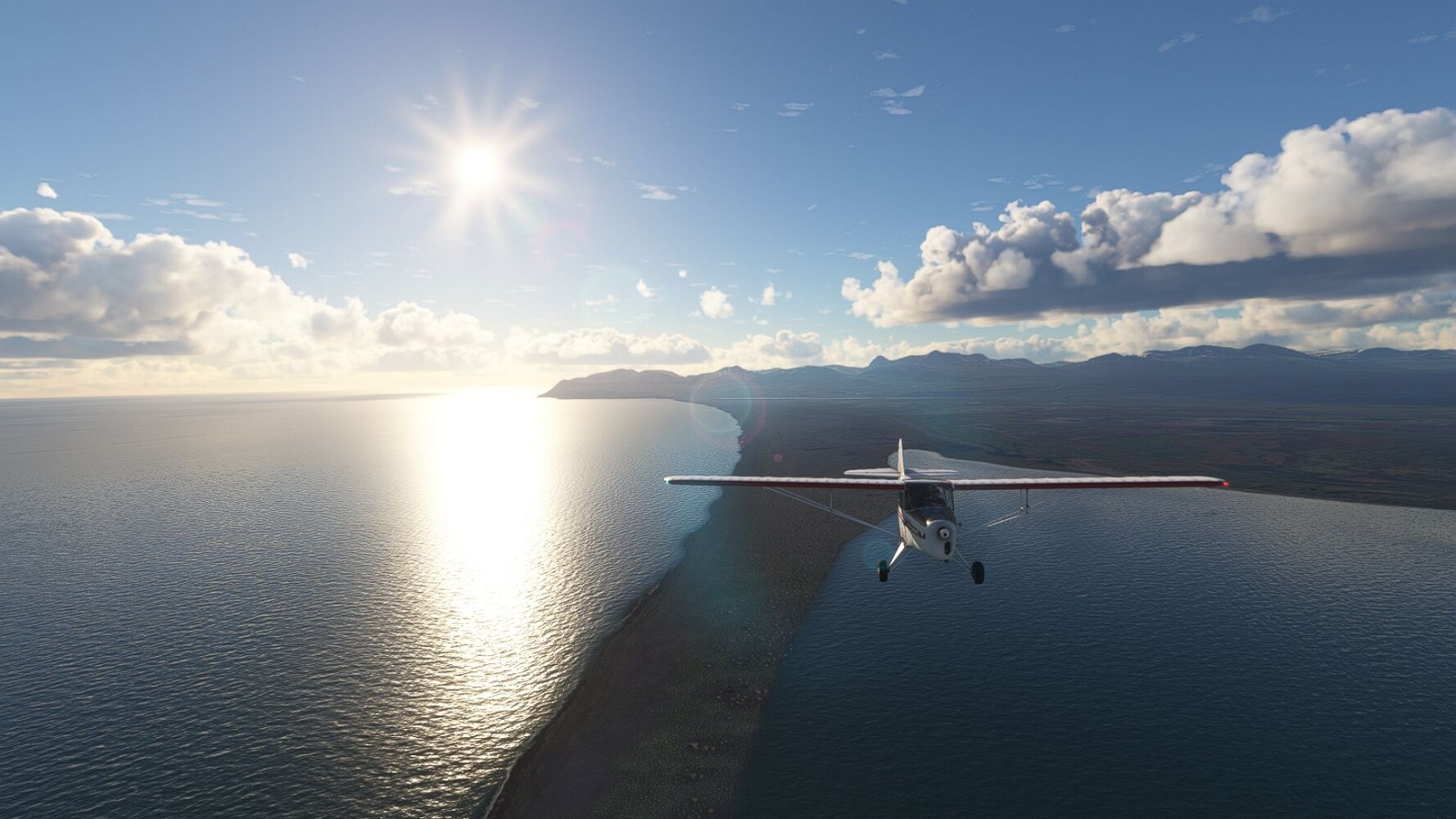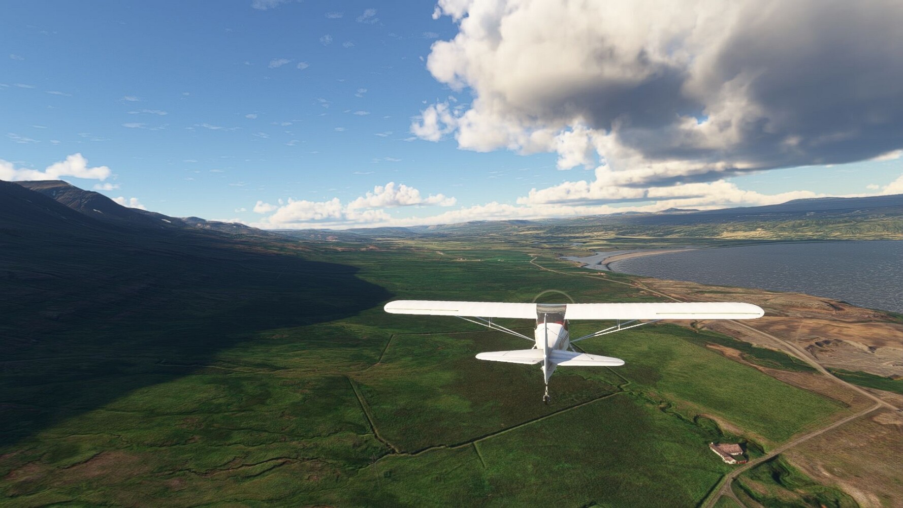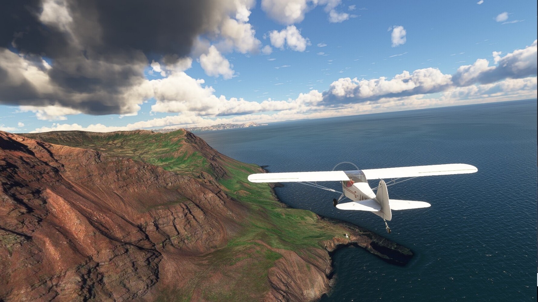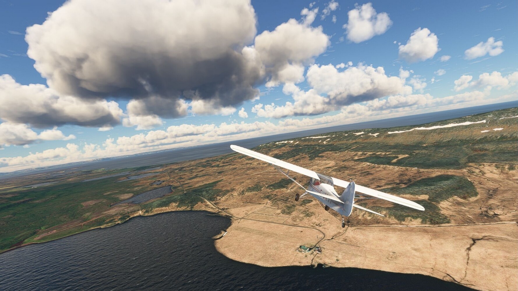 Start war in Borgarfjödur Eystri, BIBF Gleich gehts wieder an Steilhängen entlang. Kleine Buchten öffnen sich hier. Die Landschaft bleibt aber wild und die Berge steil. Der erste Leuchtturm dieser Etappe voraus, 32. der Umrundung. Es ist der von Kögur. Mit Schutzmauer und ohne leuchtenden Anstrich. Und sehr abgelegen. Dann kommt die weite Bucht von Heradsfloi. Mal wieder ein weiter, schwarzer Strand. Mal im Sommerlicht, ein anderes Wettertheam, passt nicht finde ich... so ist es besser. Die Nummer 33 findet sich auf einer kleinen Insel, die dem Kap vorgelagert ist. Es ist der Leuchtturm Bjarnarey. Eine kleine Festung, die Laterne eingekeilt zwischen den starken Eckpfeilern. Langsam werden die Berge flacher... und das Land weiter. Der kleine Flugplatz von Vöpnafjördur (BIVO) Der zugehörige Ort liegt auf der Halbinsel. Nördlich außerhalb des Ortes liegt der nächste Leuchtturm, die 34 in der bisherigen Zählung. Er nennt sich Kolbeinstangi Mal wieder ein klassisches isländisches Modell. Blick auf Vopnafjördur. Und weiter gehts Merkwürdige Begegnung, AI-Traffic auf Meereshöhe... Hier wirds nun ganz flach, mit einer Steilküste. Die steigt langsam an... Die Nummer 35 kommt in Sichtweite. Das Leuchtfeuer Digranes. Wieder ein klassisches Islandmodell. Die Küste steigt weiter an. Trogtäler zeugen von der vergangenen Vergletscherung. Hier ragt eine flache Halbinsel weit ins Meer. Und an ihrer Spitze einsam ein Leuchtfeuer. Sein Name ist Langanessviti, die Nummer 36. Drei Dutzend sind schon voll. Eine ganz andere Landschaft hier. Schneereste. Die 37 markierte die Bucht von Lonafjördur Auf meiner Karte ist er namenlos... Google sagt es ist der Turm von Grenjanes Es handelt sich wieder um ein Standardmodell Schon ist der nächste Landplatz in Sicht... Thorshofn BITN Teil 07Teil 09