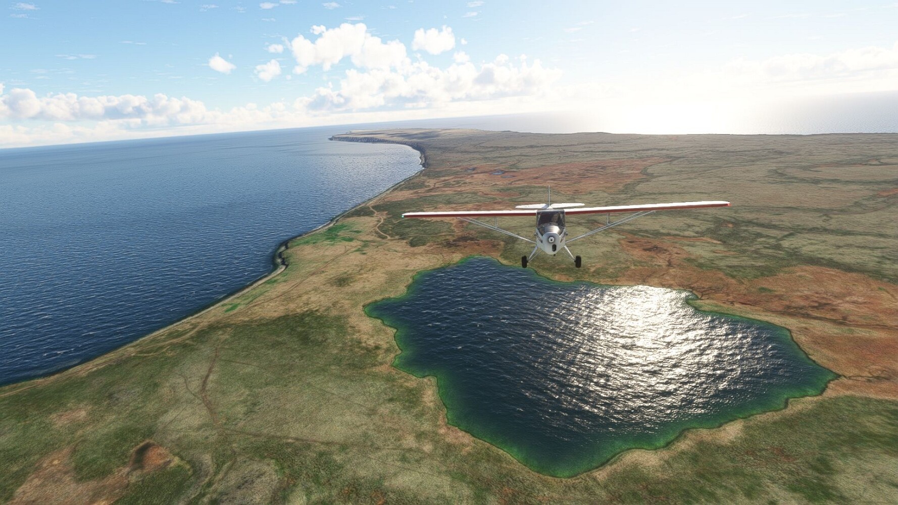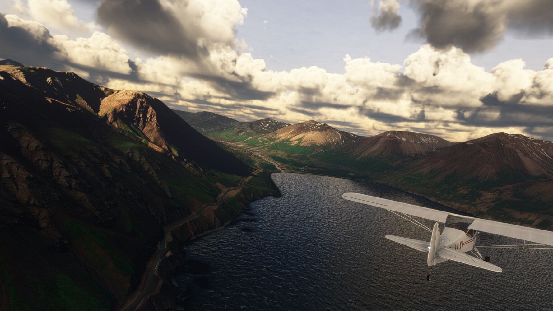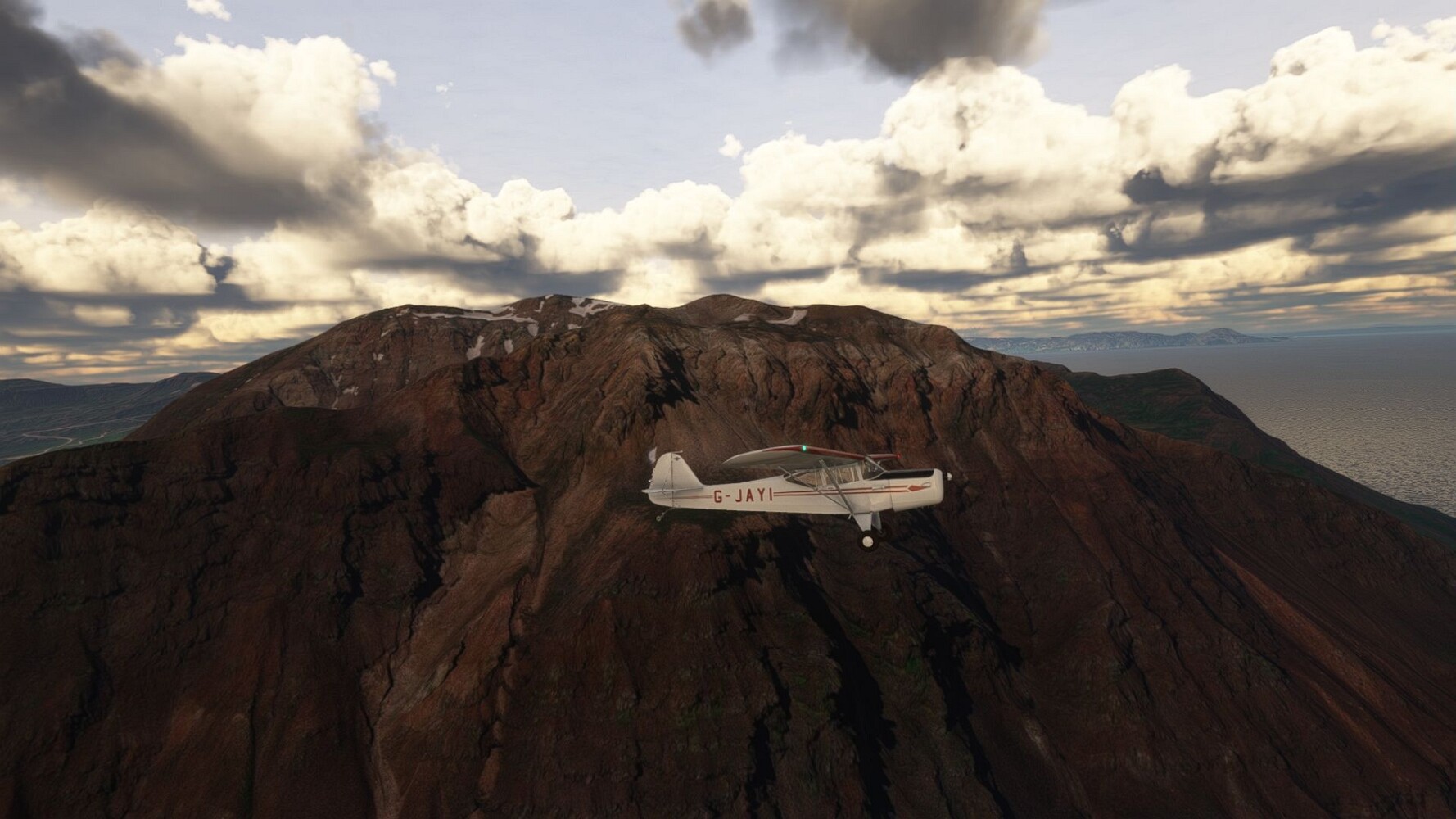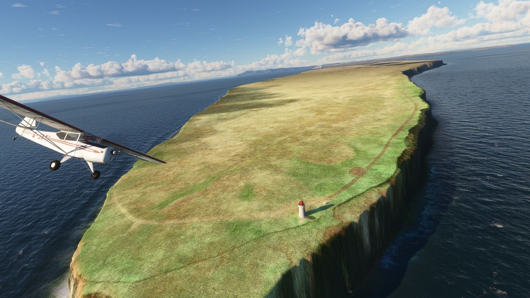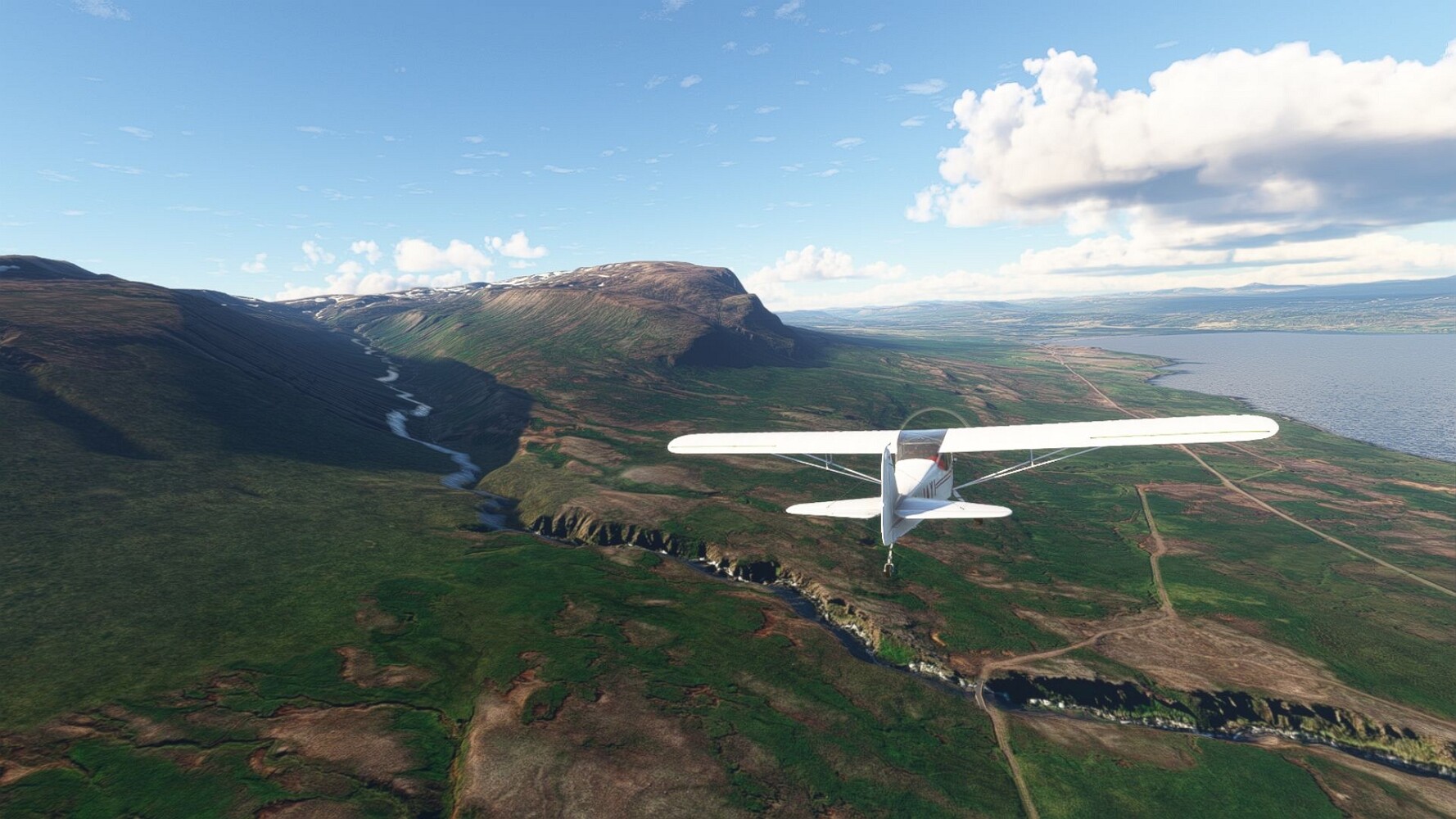 Start war in Borgarfjödur Eystri, BIBF Gleich gehts wieder an Steilhängen entlang. Kleine Buchten öffnen sich hier. Die Landschaft bleibt aber wild und die Berge steil. Der erste Leuchtturm dieser Etappe voraus, 32. der Umrundung. Es ist der von Kögur. Mit Schutzmauer und ohne leuchtenden Anstrich. Und sehr abgelegen. Dann kommt die weite Bucht von Heradsfloi. Mal wieder ein weiter, schwarzer Strand. Mal im Sommerlicht, ein anderes Wettertheam, passt nicht finde ich... so ist es besser. Die Nummer 33 findet sich auf einer kleinen Insel, die dem Kap vorgelagert ist. Es ist der Leuchtturm Bjarnarey. Eine kleine Festung, die Laterne eingekeilt zwischen den starken Eckpfeilern. Langsam werden die Berge flacher... und das Land weiter. Der kleine Flugplatz von Vöpnafjördur (BIVO) Der zugehörige Ort liegt auf der Halbinsel. Nördlich außerhalb des Ortes liegt der nächste Leuchtturm, die 34 in der bisherigen Zählung. Er nennt sich Kolbeinstangi Mal wieder ein klassisches isländisches Modell. Blick auf Vopnafjördur. Und weiter gehts Merkwürdige Begegnung, AI-Traffic auf Meereshöhe... Hier wirds nun ganz flach, mit einer Steilküste. Die steigt langsam an... Die Nummer 35 kommt in Sichtweite. Das Leuchtfeuer Digranes. Wieder ein klassisches Islandmodell. Die Küste steigt weiter an. Trogtäler zeugen von der vergangenen Vergletscherung. Hier ragt eine flache Halbinsel weit ins Meer. Und an ihrer Spitze einsam ein Leuchtfeuer. Sein Name ist Langanessviti, die Nummer 36. Drei Dutzend sind schon voll. Eine ganz andere Landschaft hier. Schneereste. Die 37 markierte die Bucht von Lonafjördur Auf meiner Karte ist er namenlos... Google sagt es ist der Turm von Grenjanes Es handelt sich wieder um ein Standardmodell Schon ist der nächste Landplatz in Sicht... Thorshofn BITN Teil 07Teil 09