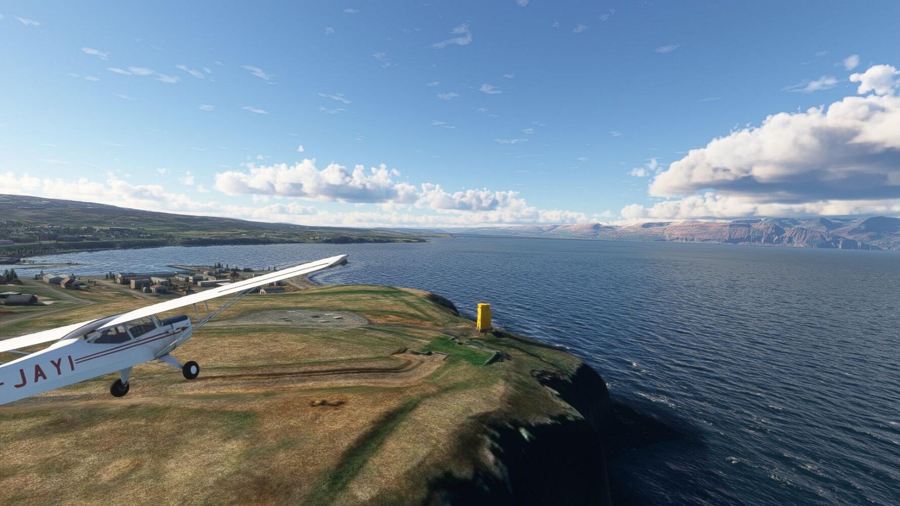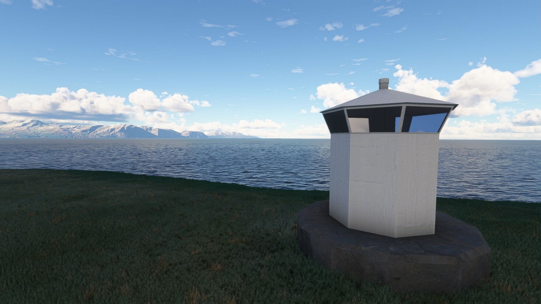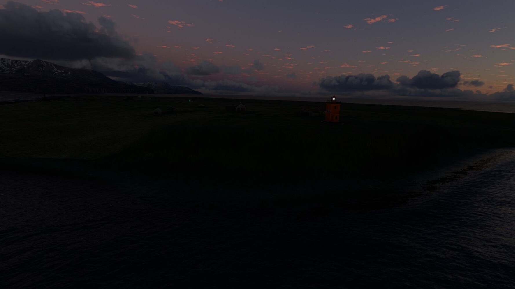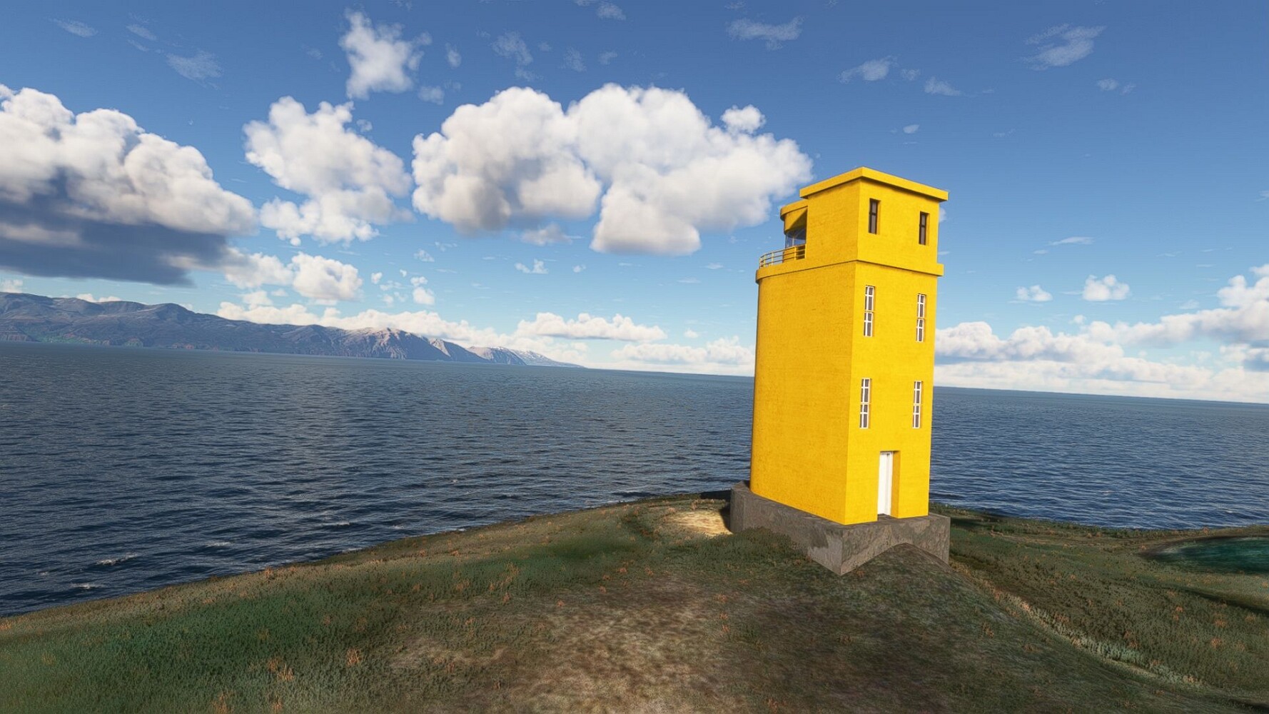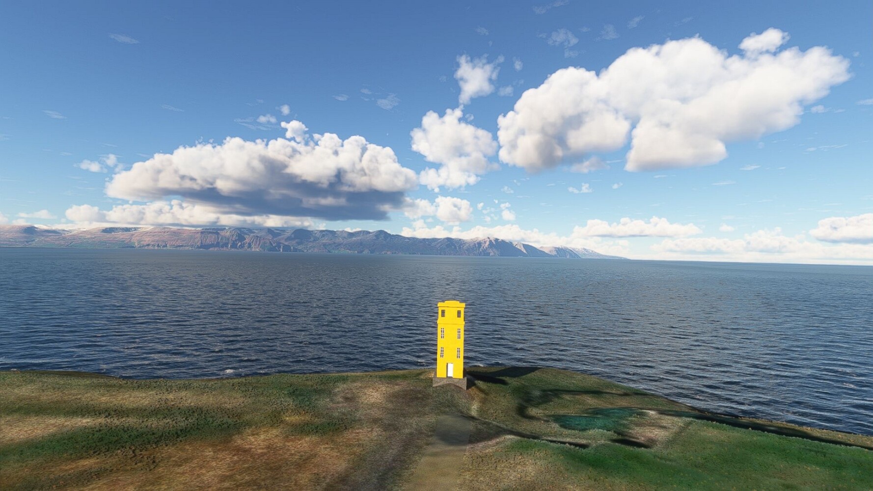 Noch ein Schlenker über den Flugplatzleuchtturm und weiter gings gen Westen. Hier wird wieder frisches Grün gepflanzt Sandformationen Es ist die Bucht Öxarfjördur. Es folgt ein längeres Stück flacher Steilküste. Und da findet sich schon das nächste Leuchtfeuer. Tjörnes, die Nummer 44. Wir erkennen es nun schon sofort: ein Standardmodell mittlerer Höhe. Aber es gibt eine herrliche Aussicht von hier oben. Die Insel Lundey ist auch leuchtbefeuert. Kaum zu erkennen. Putzig, die fünfunfvierzig... Und am nördlichen Ortsbeginn von Husavik steht der nächste, der ist aber nun wirklich ein besonderes Stück. Zitronengelb, halbrund und... schick gestaltet: Húsavikurviti Hätte ihn in die 1930er Jahre datiert... Nummer 46! Er thront in der Tat über dem Hafen des Ortes. Nun kommen deutlich höhere Berge in Sicht. Da rauscht ein Wasserfall ins Meer. Hier gibt nun wirklich einsame Buchten. Und vor der Küste Flatey, das auch von einem Leuchtfeuer gekennzeichnet ist. Und es gibt eine Kirche, die sieht aber nicht so aus wie in der virtuellen Welt, das scheint ein Stellvertretermodell aus einem Addon zu sein. Aber nett anzusehen ist sie trotzdem. Der Turm ist allerdings natürlich naturgetreu umgesetzt, die 47. Solartechnik ist auch zu finden. Und hier der Beweis: er erfüllt seine Funktion! Am Morgen nach dieser ungeplanen Unterbrechung gings weiter gen Westen. Hier liegt überall noch Schnee. In dieser Einsamkeit findet sich aber dann doch noch ein Leuchtturm. Fast nicht zu erkennen: die 48. Das Leuchtfeuer von Gjörgurtá Wie die Region sehr abgelegen. Hier geht es jetzt in den Eyjafjö... Überall stürzen Bäche dem Meer entgegen. Die Insel Hrisey Dalvík Am Ostufer der Bucht liegt der Ort Svalbardseyri, Dessen Landzunge wird von einem kleinen Standardmodell gekennzeichnet. Die Nummer 49. Das Ziel der Etappe kommt in Sicht, Akureyri, die größte Siedlung der Region mit dem größten Flugplatz. Der macht schon was her. Die Umsetzung stammt von Asobo und war Teil des World Updates XV. Teil 09Teil 11