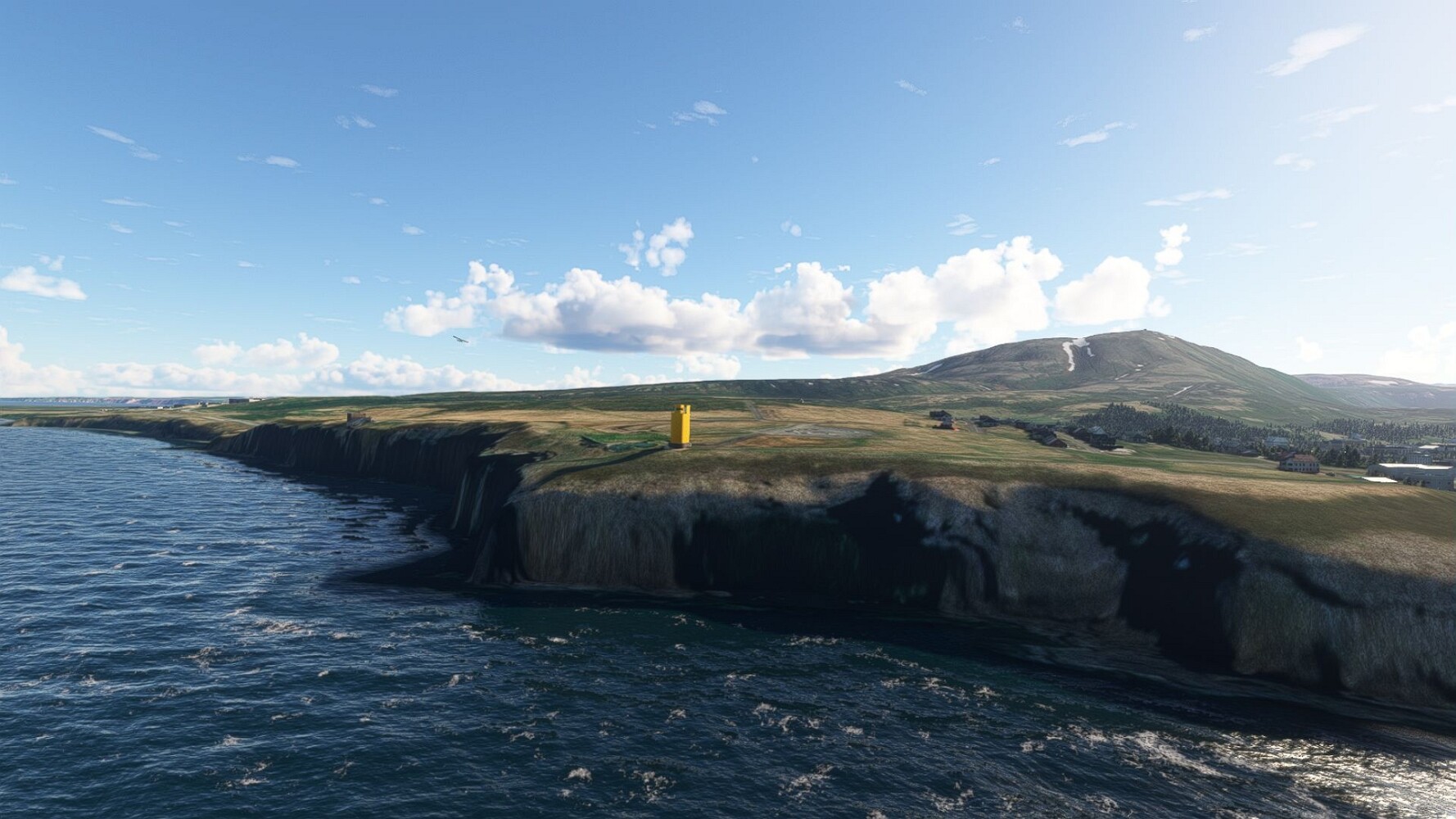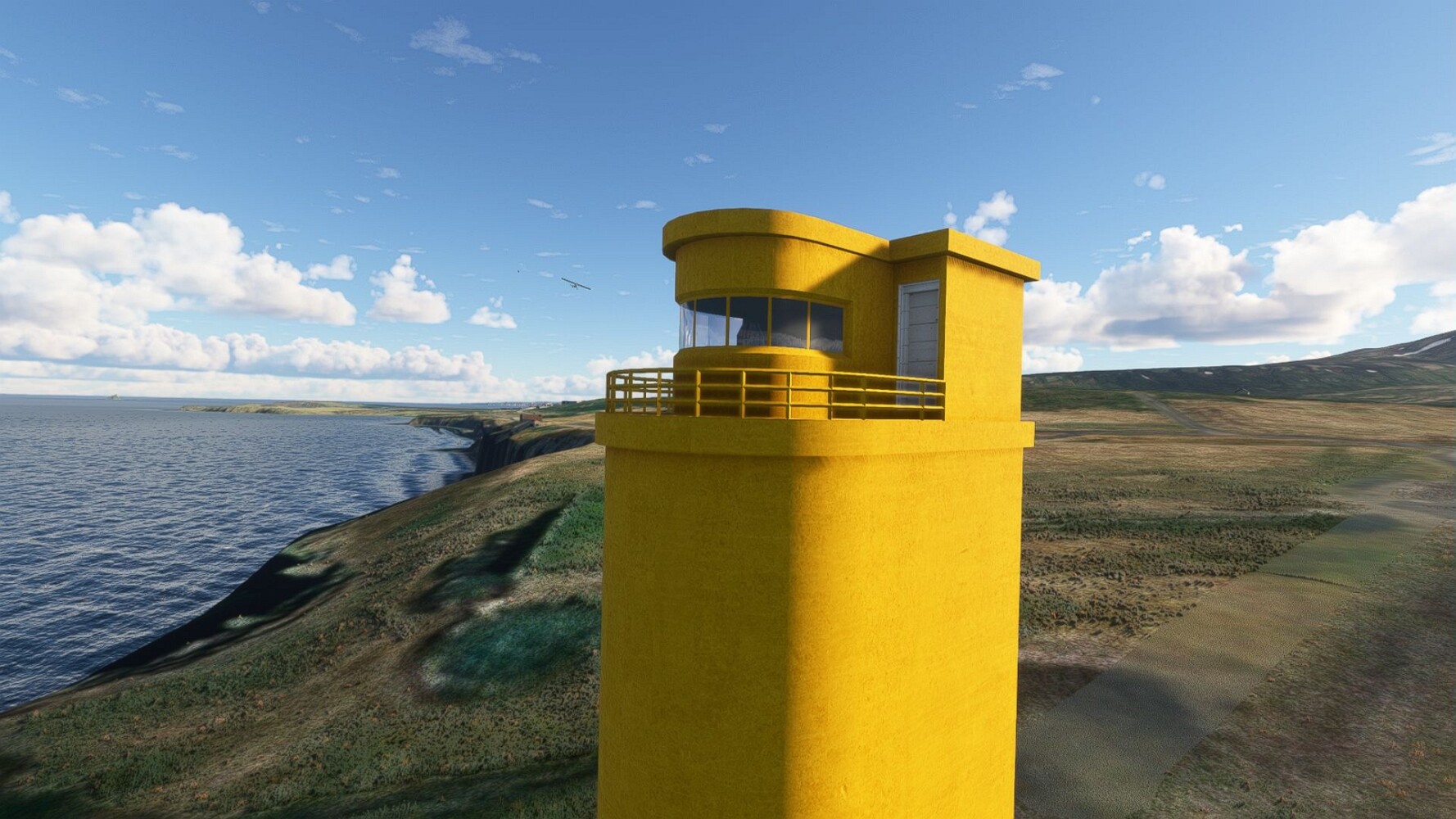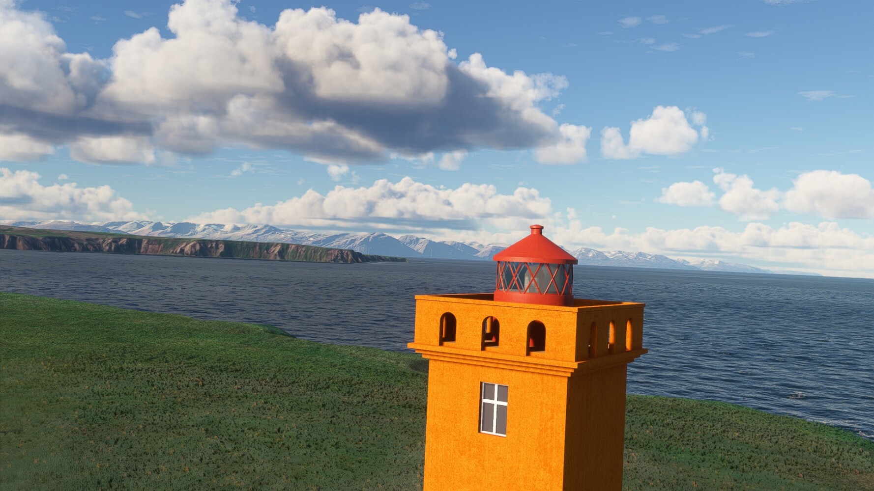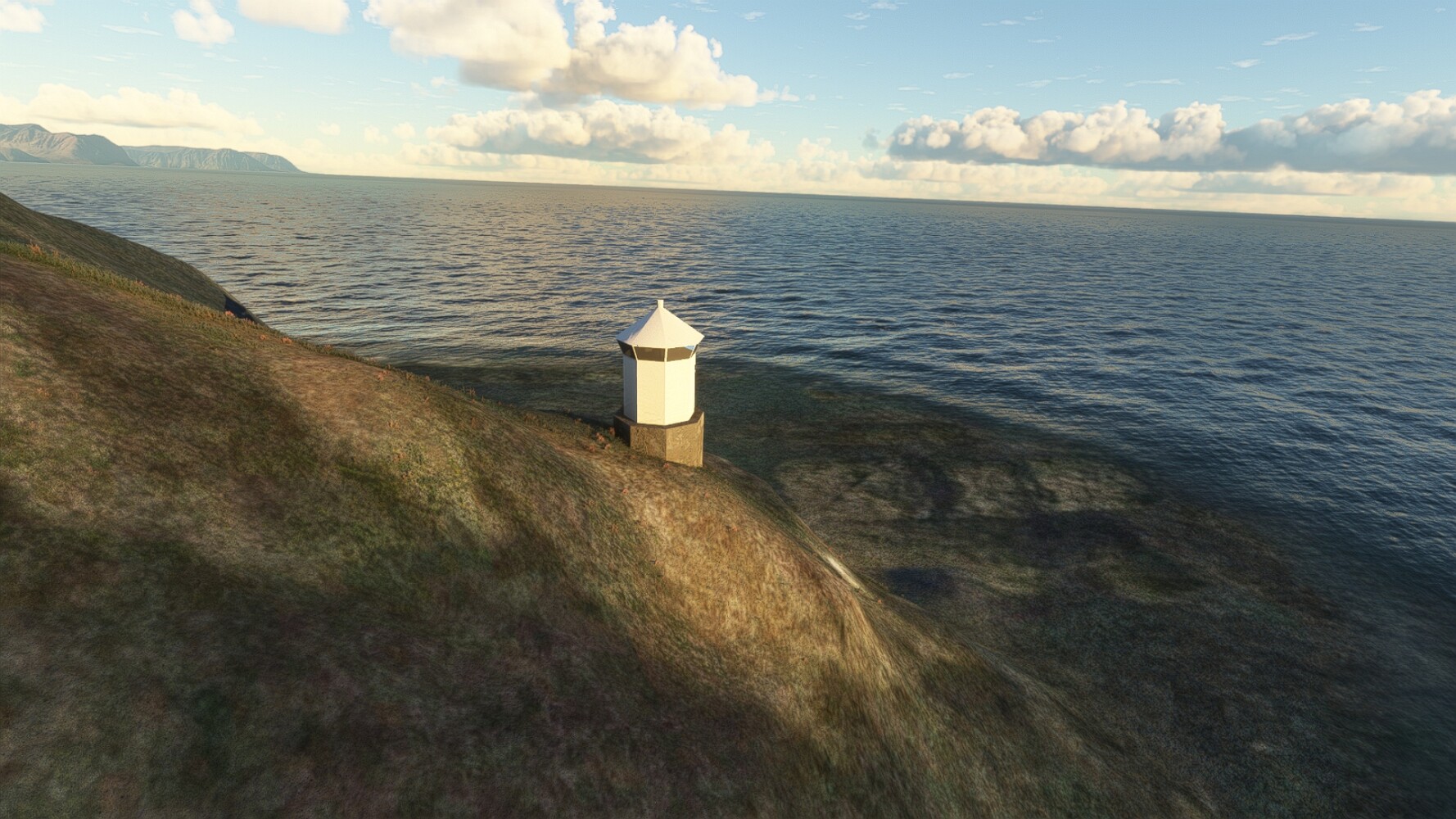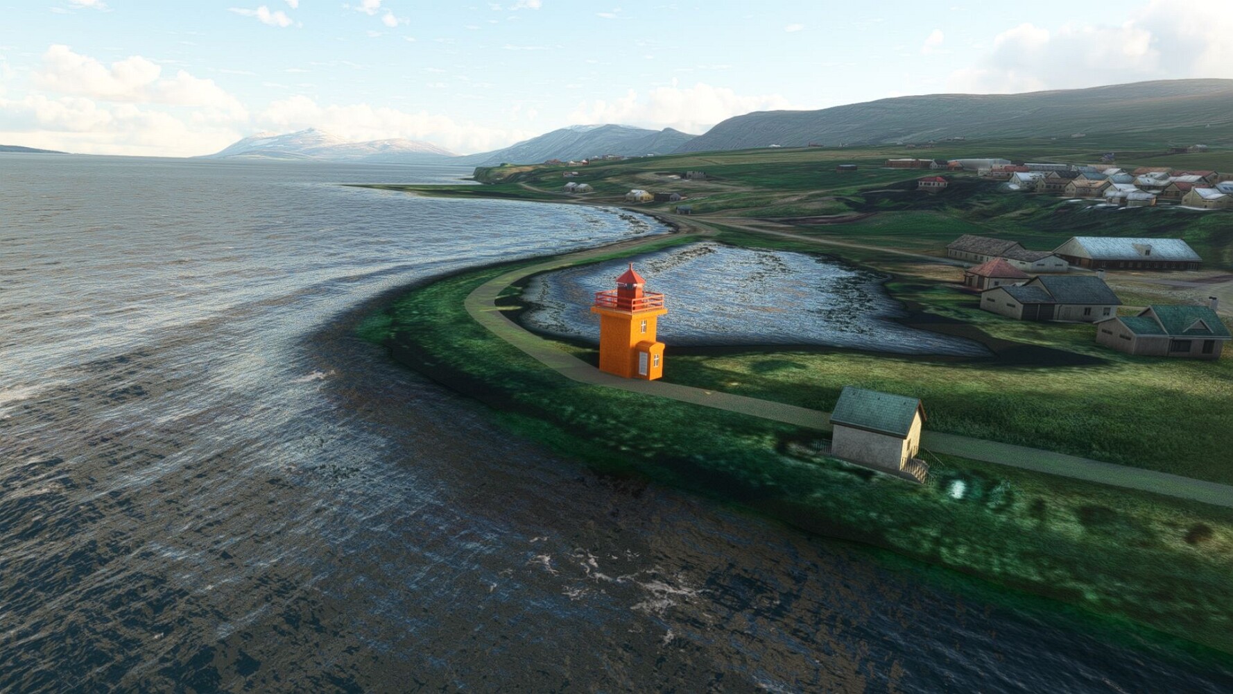 Noch ein Schlenker über den Flugplatzleuchtturm und weiter gings gen Westen. Hier wird wieder frisches Grün gepflanzt Sandformationen Es ist die Bucht Öxarfjördur. Es folgt ein längeres Stück flacher Steilküste. Und da findet sich schon das nächste Leuchtfeuer. Tjörnes, die Nummer 44. Wir erkennen es nun schon sofort: ein Standardmodell mittlerer Höhe. Aber es gibt eine herrliche Aussicht von hier oben. Die Insel Lundey ist auch leuchtbefeuert. Kaum zu erkennen. Putzig, die fünfunfvierzig... Und am nördlichen Ortsbeginn von Husavik steht der nächste, der ist aber nun wirklich ein besonderes Stück. Zitronengelb, halbrund und... schick gestaltet: Húsavikurviti Hätte ihn in die 1930er Jahre datiert... Nummer 46! Er thront in der Tat über dem Hafen des Ortes. Nun kommen deutlich höhere Berge in Sicht. Da rauscht ein Wasserfall ins Meer. Hier gibt nun wirklich einsame Buchten. Und vor der Küste Flatey, das auch von einem Leuchtfeuer gekennzeichnet ist. Und es gibt eine Kirche, die sieht aber nicht so aus wie in der virtuellen Welt, das scheint ein Stellvertretermodell aus einem Addon zu sein. Aber nett anzusehen ist sie trotzdem. Der Turm ist allerdings natürlich naturgetreu umgesetzt, die 47. Solartechnik ist auch zu finden. Und hier der Beweis: er erfüllt seine Funktion! Am Morgen nach dieser ungeplanen Unterbrechung gings weiter gen Westen. Hier liegt überall noch Schnee. In dieser Einsamkeit findet sich aber dann doch noch ein Leuchtturm. Fast nicht zu erkennen: die 48. Das Leuchtfeuer von Gjörgurtá Wie die Region sehr abgelegen. Hier geht es jetzt in den Eyjafjö... Überall stürzen Bäche dem Meer entgegen. Die Insel Hrisey Dalvík Am Ostufer der Bucht liegt der Ort Svalbardseyri, Dessen Landzunge wird von einem kleinen Standardmodell gekennzeichnet. Die Nummer 49. Das Ziel der Etappe kommt in Sicht, Akureyri, die größte Siedlung der Region mit dem größten Flugplatz. Der macht schon was her. Die Umsetzung stammt von Asobo und war Teil des World Updates XV. Teil 09Teil 11