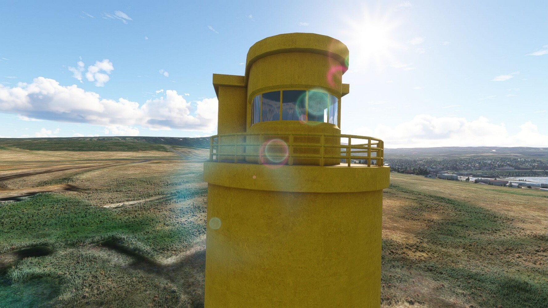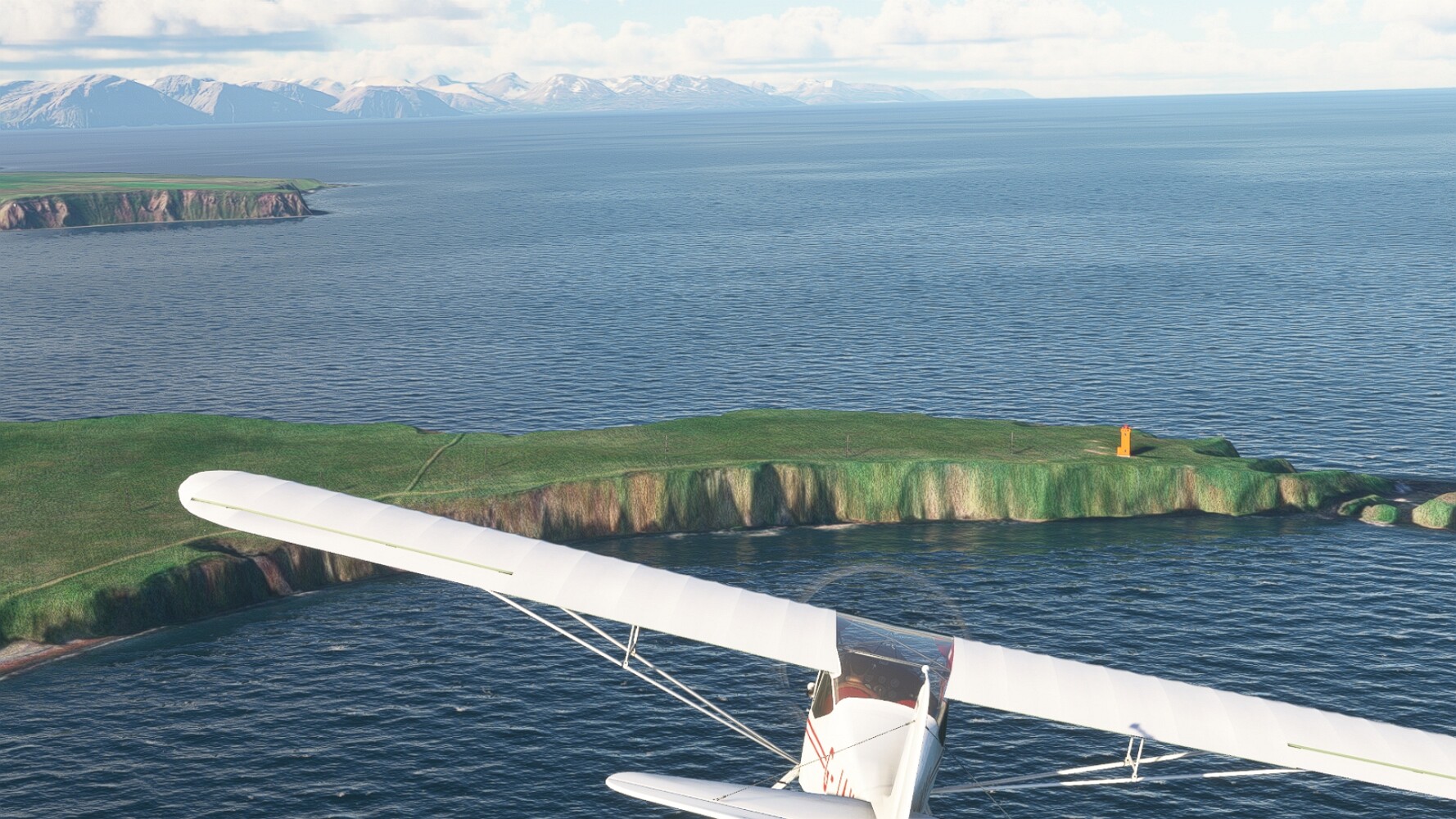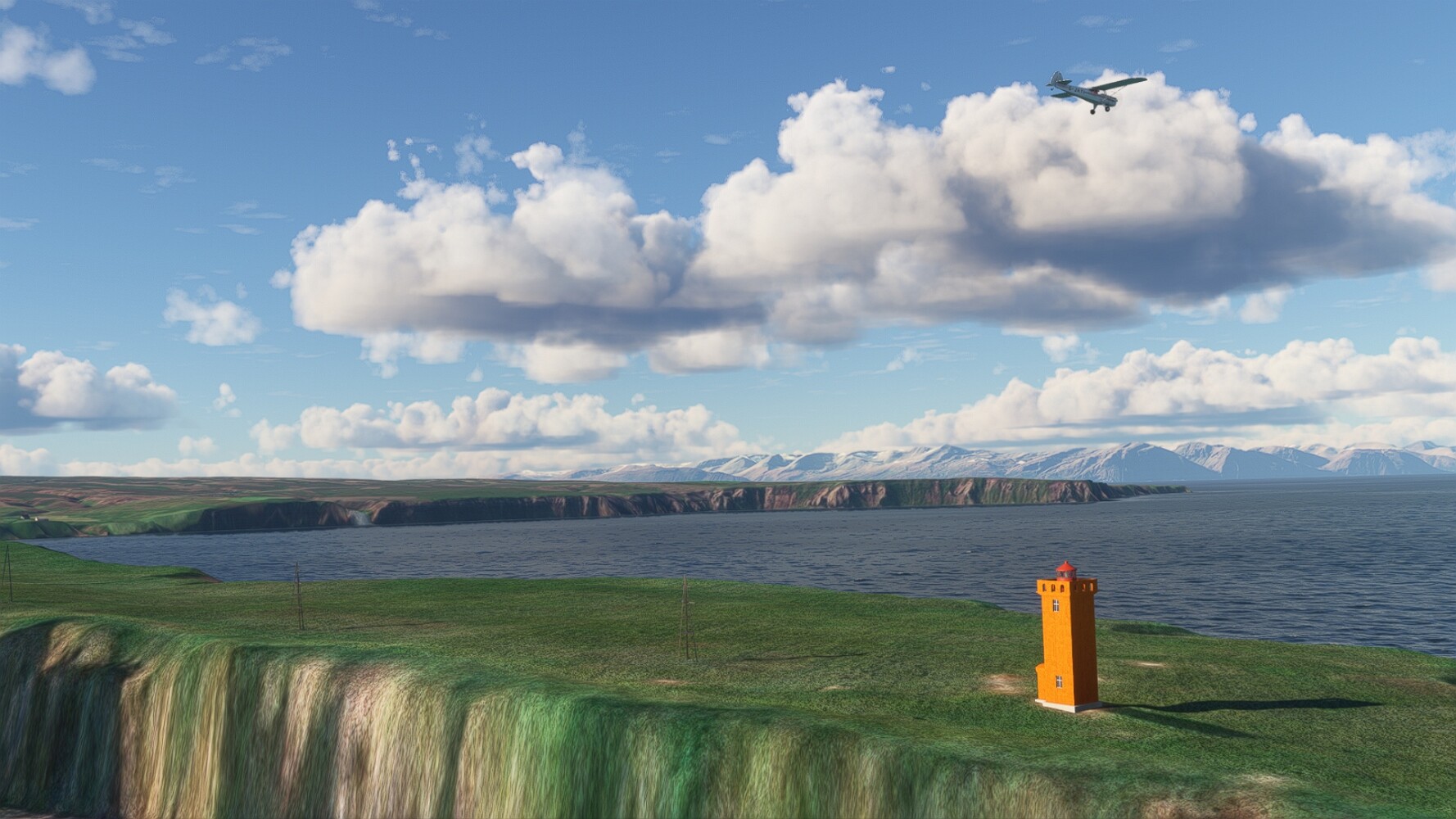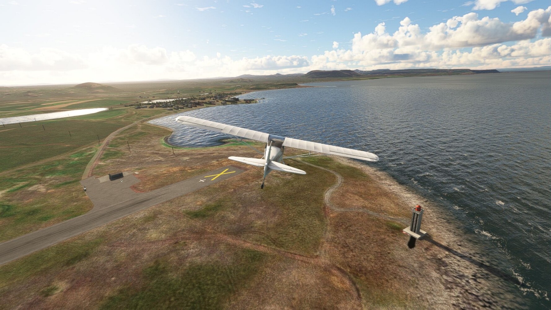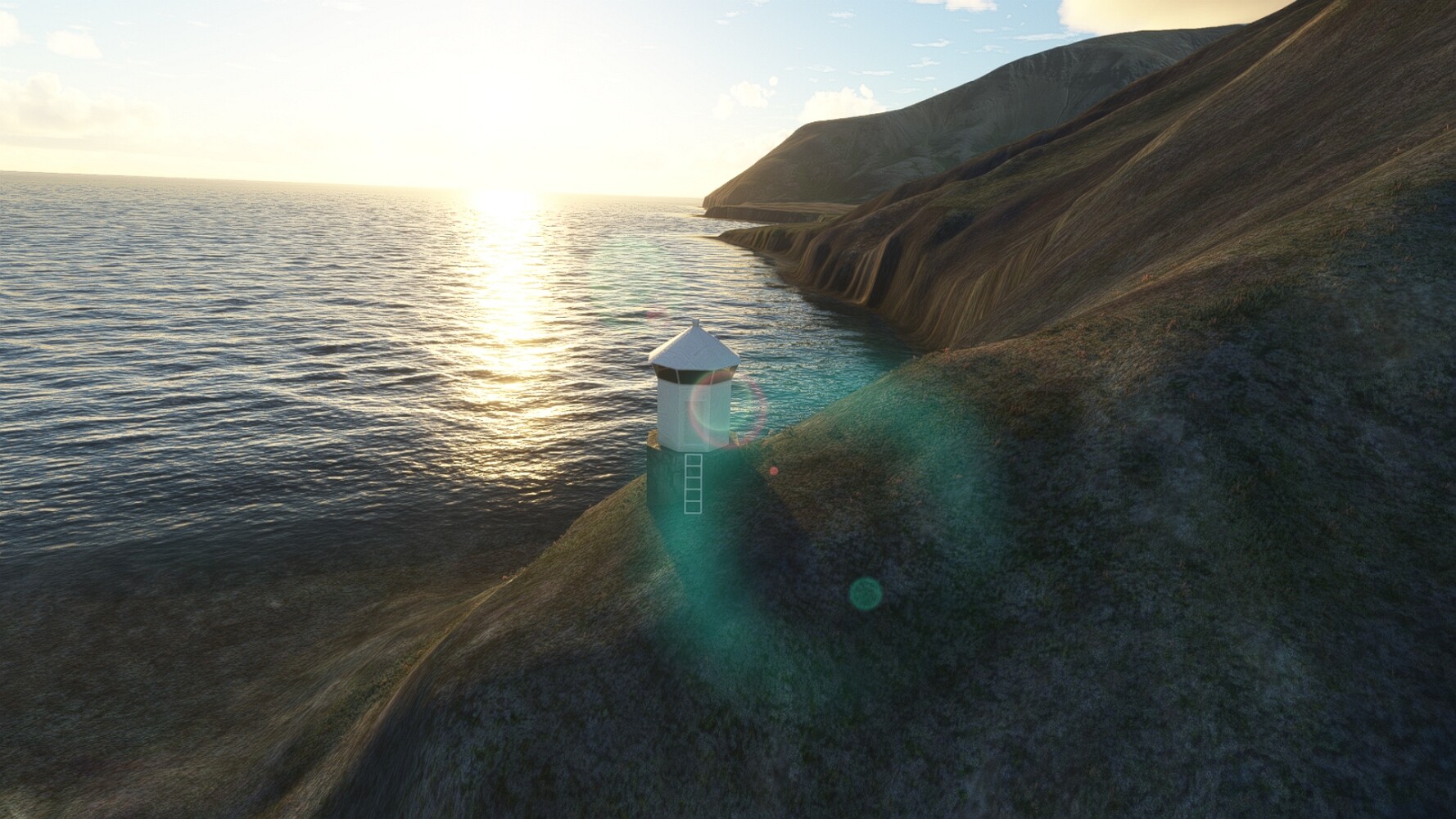 Noch ein Schlenker über den Flugplatzleuchtturm und weiter gings gen Westen. Hier wird wieder frisches Grün gepflanzt Sandformationen Es ist die Bucht Öxarfjördur. Es folgt ein längeres Stück flacher Steilküste. Und da findet sich schon das nächste Leuchtfeuer. Tjörnes, die Nummer 44. Wir erkennen es nun schon sofort: ein Standardmodell mittlerer Höhe. Aber es gibt eine herrliche Aussicht von hier oben. Die Insel Lundey ist auch leuchtbefeuert. Kaum zu erkennen. Putzig, die fünfunfvierzig... Und am nördlichen Ortsbeginn von Husavik steht der nächste, der ist aber nun wirklich ein besonderes Stück. Zitronengelb, halbrund und... schick gestaltet: Húsavikurviti Hätte ihn in die 1930er Jahre datiert... Nummer 46! Er thront in der Tat über dem Hafen des Ortes. Nun kommen deutlich höhere Berge in Sicht. Da rauscht ein Wasserfall ins Meer. Hier gibt nun wirklich einsame Buchten. Und vor der Küste Flatey, das auch von einem Leuchtfeuer gekennzeichnet ist. Und es gibt eine Kirche, die sieht aber nicht so aus wie in der virtuellen Welt, das scheint ein Stellvertretermodell aus einem Addon zu sein. Aber nett anzusehen ist sie trotzdem. Der Turm ist allerdings natürlich naturgetreu umgesetzt, die 47. Solartechnik ist auch zu finden. Und hier der Beweis: er erfüllt seine Funktion! Am Morgen nach dieser ungeplanen Unterbrechung gings weiter gen Westen. Hier liegt überall noch Schnee. In dieser Einsamkeit findet sich aber dann doch noch ein Leuchtturm. Fast nicht zu erkennen: die 48. Das Leuchtfeuer von Gjörgurtá Wie die Region sehr abgelegen. Hier geht es jetzt in den Eyjafjö... Überall stürzen Bäche dem Meer entgegen. Die Insel Hrisey Dalvík Am Ostufer der Bucht liegt der Ort Svalbardseyri, Dessen Landzunge wird von einem kleinen Standardmodell gekennzeichnet. Die Nummer 49. Das Ziel der Etappe kommt in Sicht, Akureyri, die größte Siedlung der Region mit dem größten Flugplatz. Der macht schon was her. Die Umsetzung stammt von Asobo und war Teil des World Updates XV. Teil 09Teil 11