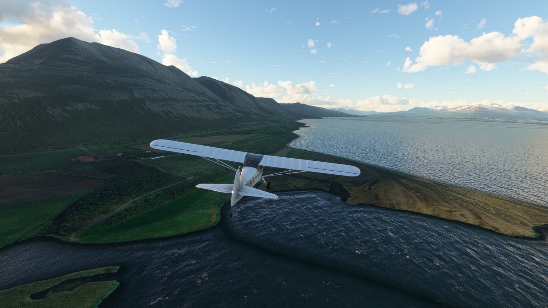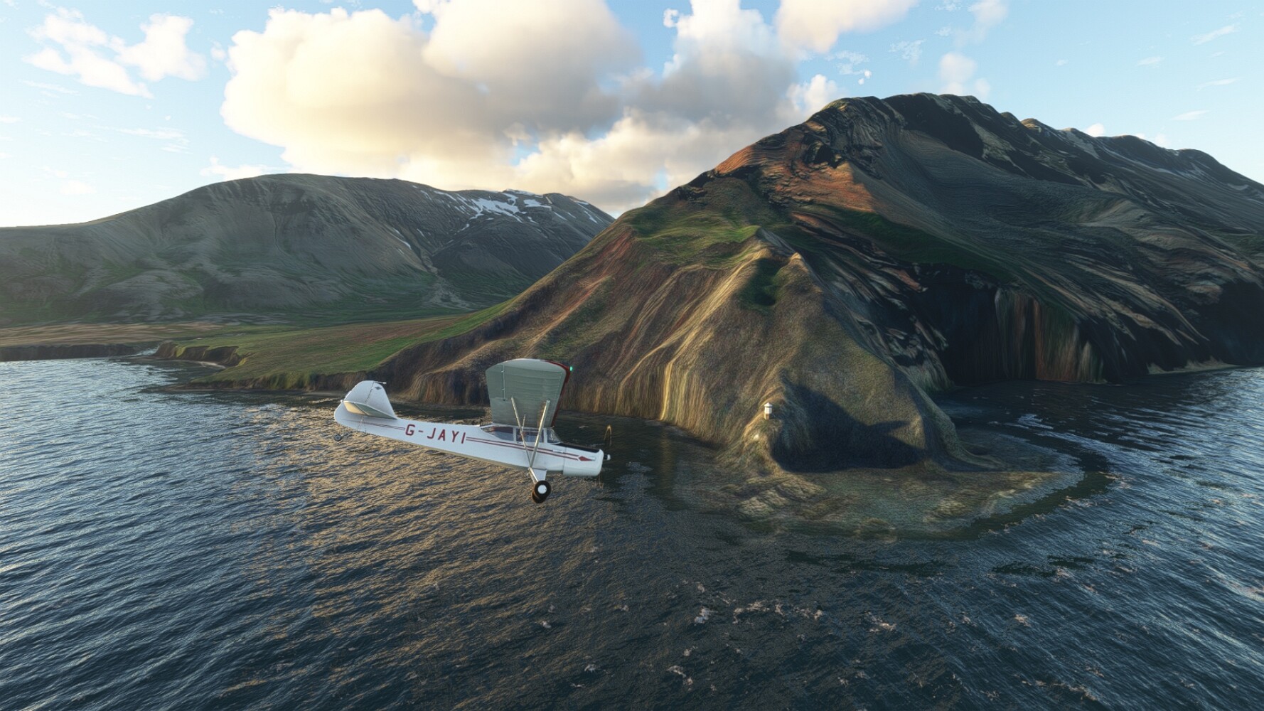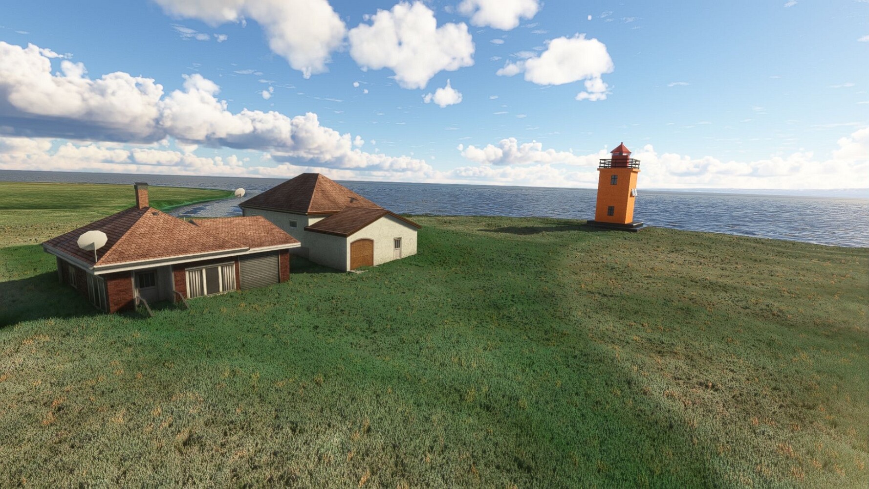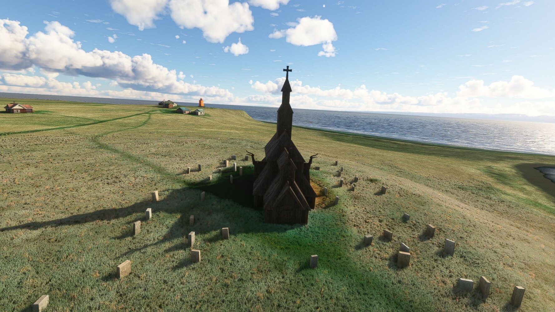 Noch ein Schlenker über den Flugplatzleuchtturm und weiter gings gen Westen. Hier wird wieder frisches Grün gepflanzt Sandformationen Es ist die Bucht Öxarfjördur. Es folgt ein längeres Stück flacher Steilküste. Und da findet sich schon das nächste Leuchtfeuer. Tjörnes, die Nummer 44. Wir erkennen es nun schon sofort: ein Standardmodell mittlerer Höhe. Aber es gibt eine herrliche Aussicht von hier oben. Die Insel Lundey ist auch leuchtbefeuert. Kaum zu erkennen. Putzig, die fünfunfvierzig... Und am nördlichen Ortsbeginn von Husavik steht der nächste, der ist aber nun wirklich ein besonderes Stück. Zitronengelb, halbrund und... schick gestaltet: Húsavikurviti Hätte ihn in die 1930er Jahre datiert... Nummer 46! Er thront in der Tat über dem Hafen des Ortes. Nun kommen deutlich höhere Berge in Sicht. Da rauscht ein Wasserfall ins Meer. Hier gibt nun wirklich einsame Buchten. Und vor der Küste Flatey, das auch von einem Leuchtfeuer gekennzeichnet ist. Und es gibt eine Kirche, die sieht aber nicht so aus wie in der virtuellen Welt, das scheint ein Stellvertretermodell aus einem Addon zu sein. Aber nett anzusehen ist sie trotzdem. Der Turm ist allerdings natürlich naturgetreu umgesetzt, die 47. Solartechnik ist auch zu finden. Und hier der Beweis: er erfüllt seine Funktion! Am Morgen nach dieser ungeplanen Unterbrechung gings weiter gen Westen. Hier liegt überall noch Schnee. In dieser Einsamkeit findet sich aber dann doch noch ein Leuchtturm. Fast nicht zu erkennen: die 48. Das Leuchtfeuer von Gjörgurtá Wie die Region sehr abgelegen. Hier geht es jetzt in den Eyjafjö... Überall stürzen Bäche dem Meer entgegen. Die Insel Hrisey Dalvík Am Ostufer der Bucht liegt der Ort Svalbardseyri, Dessen Landzunge wird von einem kleinen Standardmodell gekennzeichnet. Die Nummer 49. Das Ziel der Etappe kommt in Sicht, Akureyri, die größte Siedlung der Region mit dem größten Flugplatz. Der macht schon was her. Die Umsetzung stammt von Asobo und war Teil des World Updates XV. Teil 09Teil 11