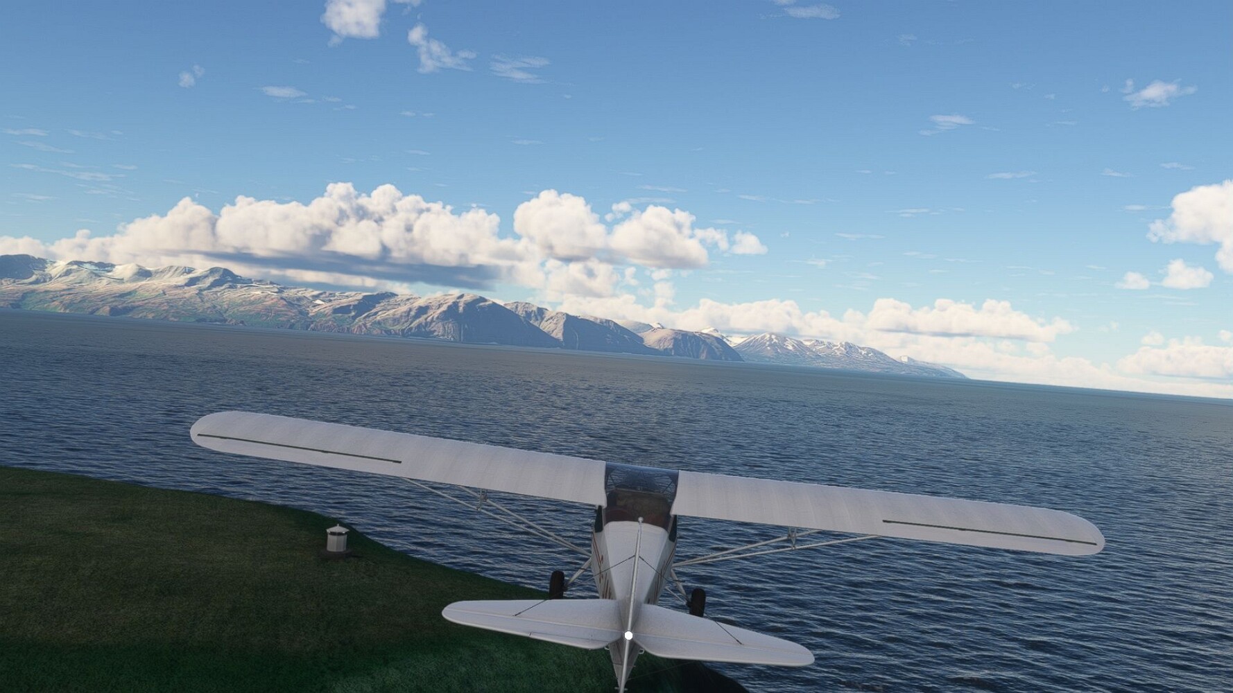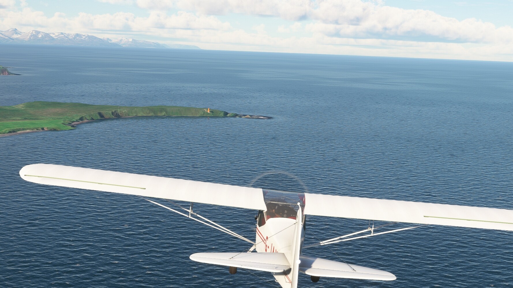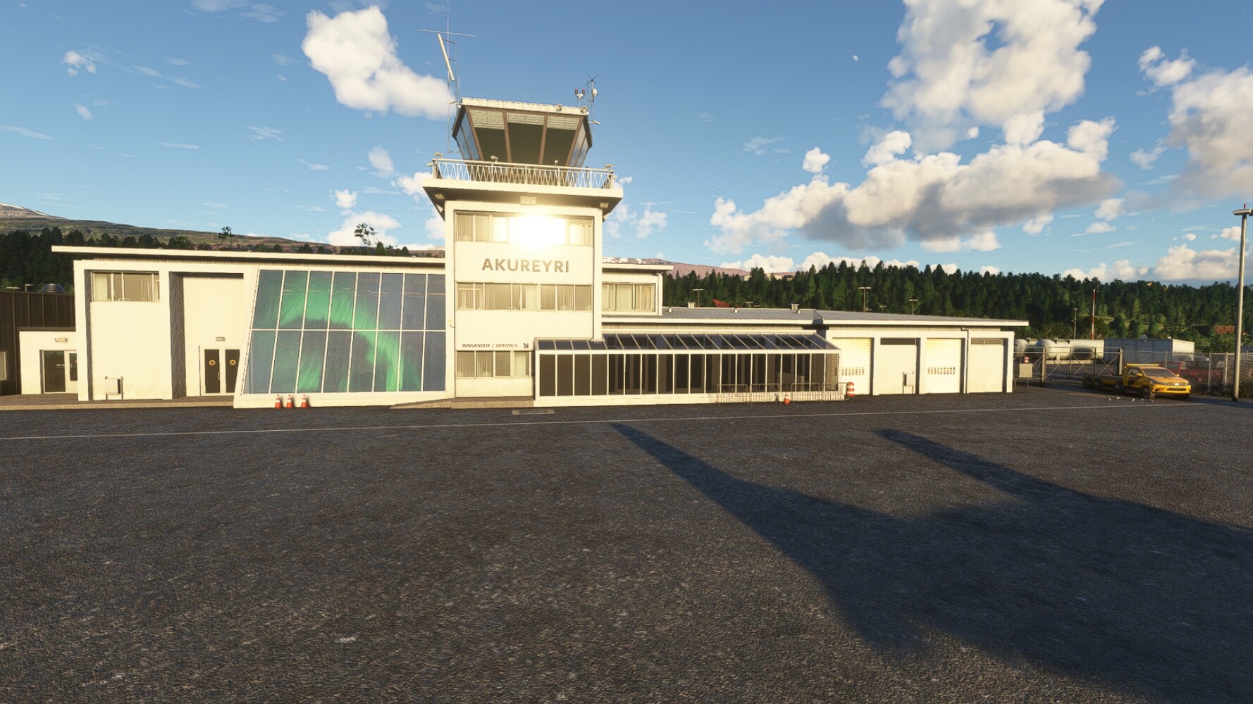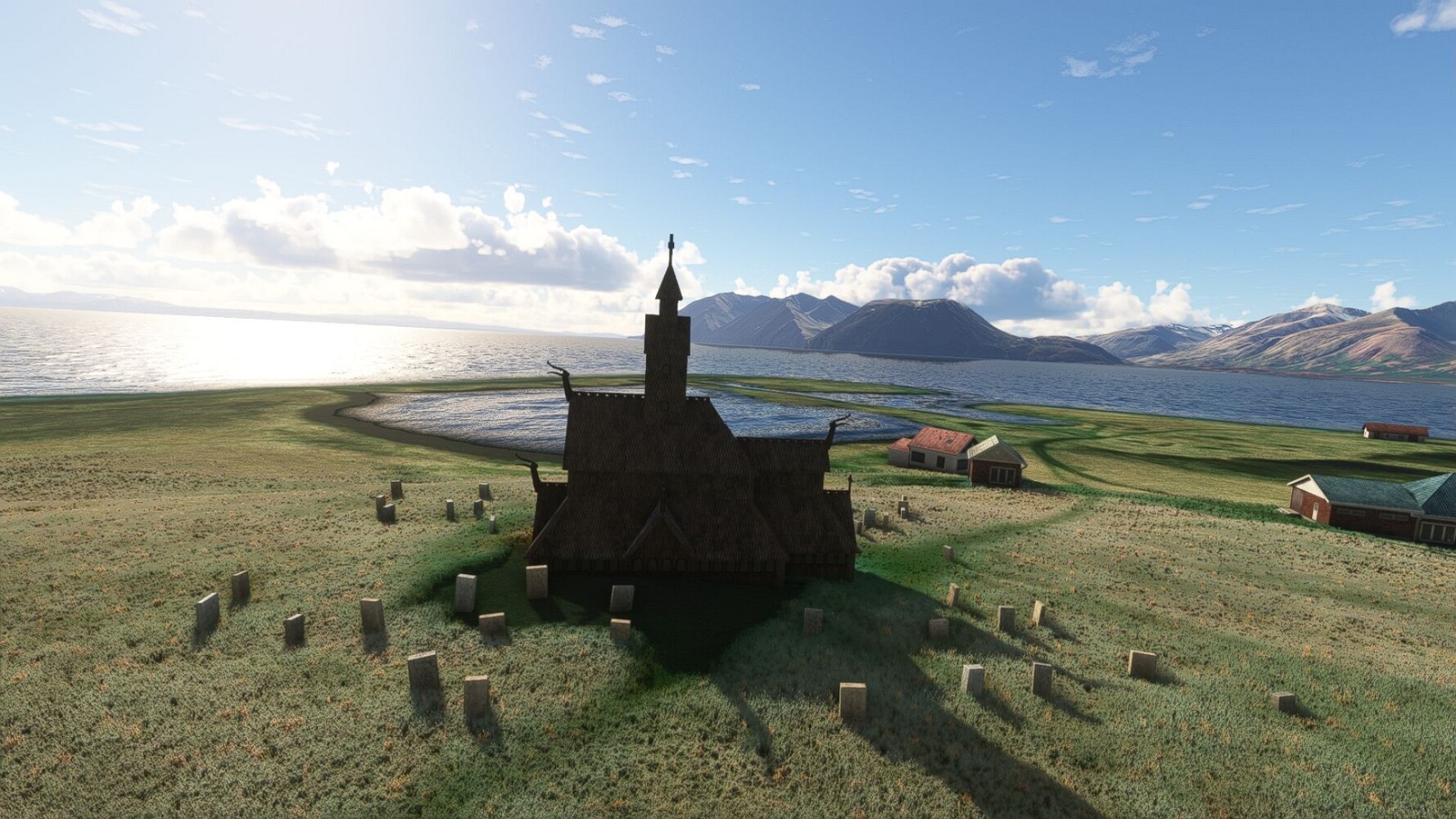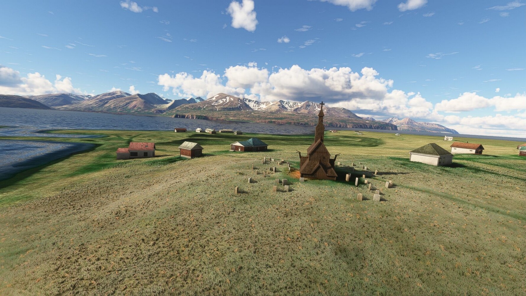 Noch ein Schlenker über den Flugplatzleuchtturm und weiter gings gen Westen. Hier wird wieder frisches Grün gepflanzt Sandformationen Es ist die Bucht Öxarfjördur. Es folgt ein längeres Stück flacher Steilküste. Und da findet sich schon das nächste Leuchtfeuer. Tjörnes, die Nummer 44. Wir erkennen es nun schon sofort: ein Standardmodell mittlerer Höhe. Aber es gibt eine herrliche Aussicht von hier oben. Die Insel Lundey ist auch leuchtbefeuert. Kaum zu erkennen. Putzig, die fünfunfvierzig... Und am nördlichen Ortsbeginn von Husavik steht der nächste, der ist aber nun wirklich ein besonderes Stück. Zitronengelb, halbrund und... schick gestaltet: Húsavikurviti Hätte ihn in die 1930er Jahre datiert... Nummer 46! Er thront in der Tat über dem Hafen des Ortes. Nun kommen deutlich höhere Berge in Sicht. Da rauscht ein Wasserfall ins Meer. Hier gibt nun wirklich einsame Buchten. Und vor der Küste Flatey, das auch von einem Leuchtfeuer gekennzeichnet ist. Und es gibt eine Kirche, die sieht aber nicht so aus wie in der virtuellen Welt, das scheint ein Stellvertretermodell aus einem Addon zu sein. Aber nett anzusehen ist sie trotzdem. Der Turm ist allerdings natürlich naturgetreu umgesetzt, die 47. Solartechnik ist auch zu finden. Und hier der Beweis: er erfüllt seine Funktion! Am Morgen nach dieser ungeplanen Unterbrechung gings weiter gen Westen. Hier liegt überall noch Schnee. In dieser Einsamkeit findet sich aber dann doch noch ein Leuchtturm. Fast nicht zu erkennen: die 48. Das Leuchtfeuer von Gjörgurtá Wie die Region sehr abgelegen. Hier geht es jetzt in den Eyjafjö... Überall stürzen Bäche dem Meer entgegen. Die Insel Hrisey Dalvík Am Ostufer der Bucht liegt der Ort Svalbardseyri, Dessen Landzunge wird von einem kleinen Standardmodell gekennzeichnet. Die Nummer 49. Das Ziel der Etappe kommt in Sicht, Akureyri, die größte Siedlung der Region mit dem größten Flugplatz. Der macht schon was her. Die Umsetzung stammt von Asobo und war Teil des World Updates XV. Teil 09Teil 11