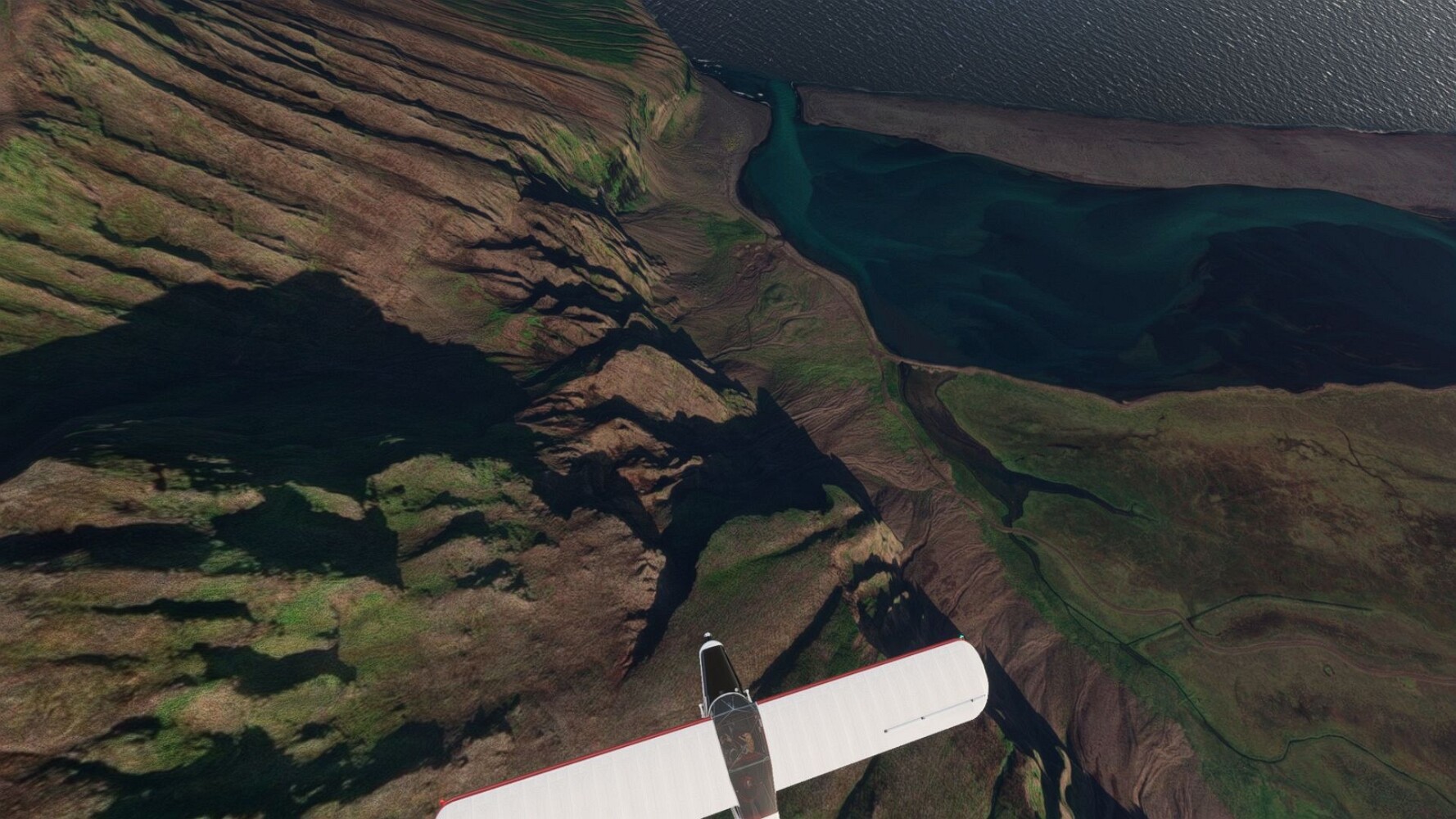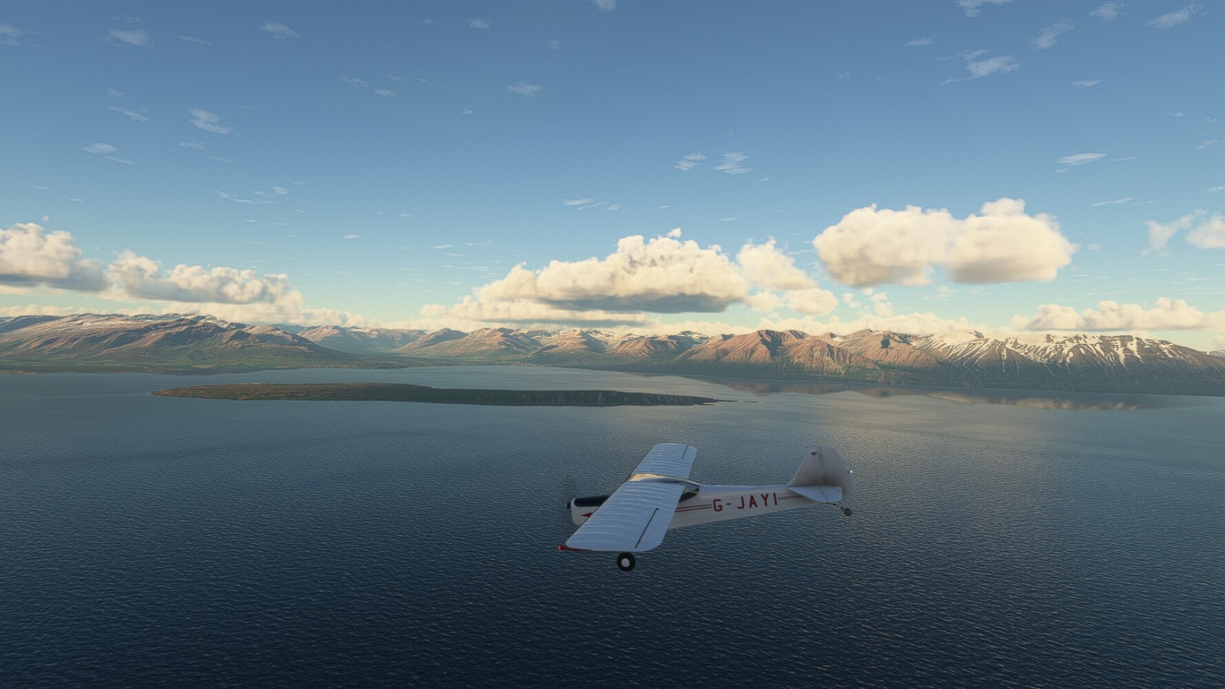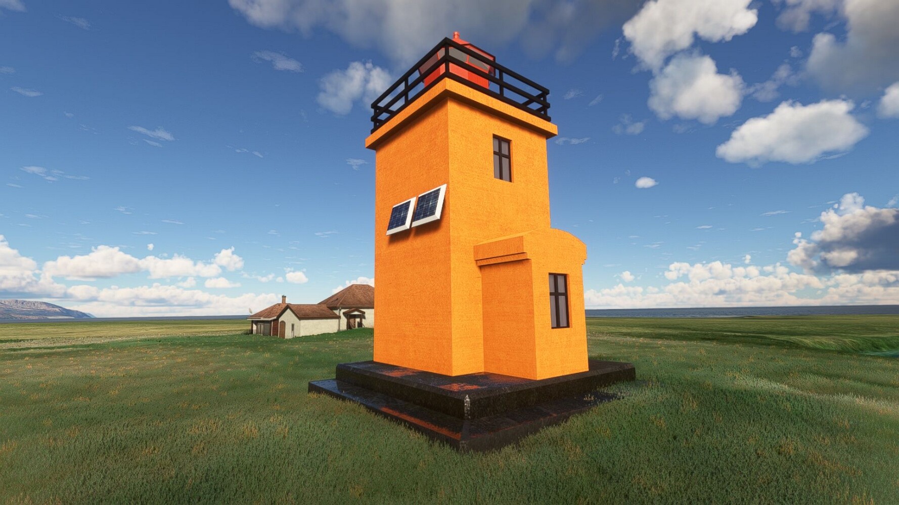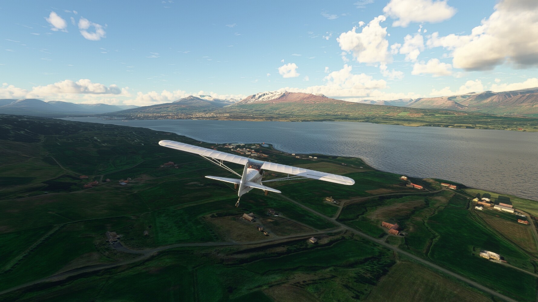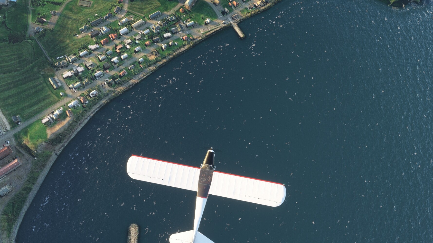 Noch ein Schlenker über den Flugplatzleuchtturm und weiter gings gen Westen. Hier wird wieder frisches Grün gepflanzt Sandformationen Es ist die Bucht Öxarfjördur. Es folgt ein längeres Stück flacher Steilküste. Und da findet sich schon das nächste Leuchtfeuer. Tjörnes, die Nummer 44. Wir erkennen es nun schon sofort: ein Standardmodell mittlerer Höhe. Aber es gibt eine herrliche Aussicht von hier oben. Die Insel Lundey ist auch leuchtbefeuert. Kaum zu erkennen. Putzig, die fünfunfvierzig... Und am nördlichen Ortsbeginn von Husavik steht der nächste, der ist aber nun wirklich ein besonderes Stück. Zitronengelb, halbrund und... schick gestaltet: Húsavikurviti Hätte ihn in die 1930er Jahre datiert... Nummer 46! Er thront in der Tat über dem Hafen des Ortes. Nun kommen deutlich höhere Berge in Sicht. Da rauscht ein Wasserfall ins Meer. Hier gibt nun wirklich einsame Buchten. Und vor der Küste Flatey, das auch von einem Leuchtfeuer gekennzeichnet ist. Und es gibt eine Kirche, die sieht aber nicht so aus wie in der virtuellen Welt, das scheint ein Stellvertretermodell aus einem Addon zu sein. Aber nett anzusehen ist sie trotzdem. Der Turm ist allerdings natürlich naturgetreu umgesetzt, die 47. Solartechnik ist auch zu finden. Und hier der Beweis: er erfüllt seine Funktion! Am Morgen nach dieser ungeplanen Unterbrechung gings weiter gen Westen. Hier liegt überall noch Schnee. In dieser Einsamkeit findet sich aber dann doch noch ein Leuchtturm. Fast nicht zu erkennen: die 48. Das Leuchtfeuer von Gjörgurtá Wie die Region sehr abgelegen. Hier geht es jetzt in den Eyjafjö... Überall stürzen Bäche dem Meer entgegen. Die Insel Hrisey Dalvík Am Ostufer der Bucht liegt der Ort Svalbardseyri, Dessen Landzunge wird von einem kleinen Standardmodell gekennzeichnet. Die Nummer 49. Das Ziel der Etappe kommt in Sicht, Akureyri, die größte Siedlung der Region mit dem größten Flugplatz. Der macht schon was her. Die Umsetzung stammt von Asobo und war Teil des World Updates XV. Teil 09Teil 11