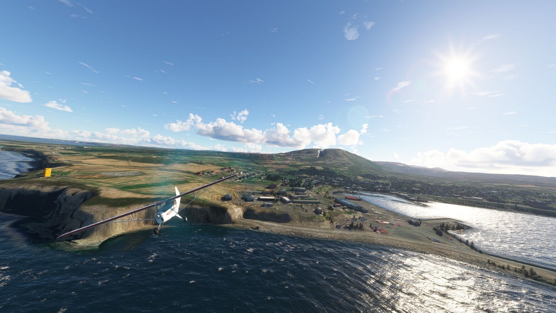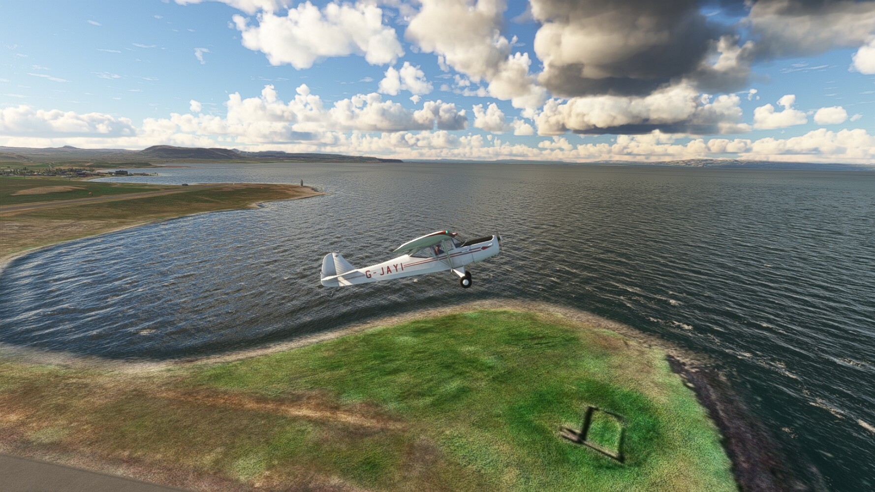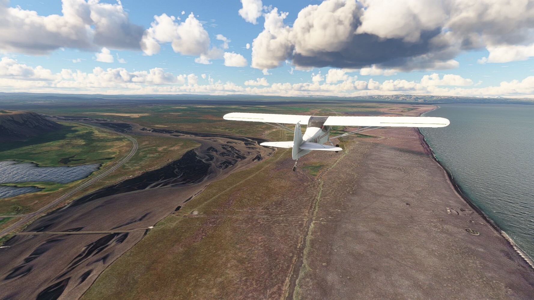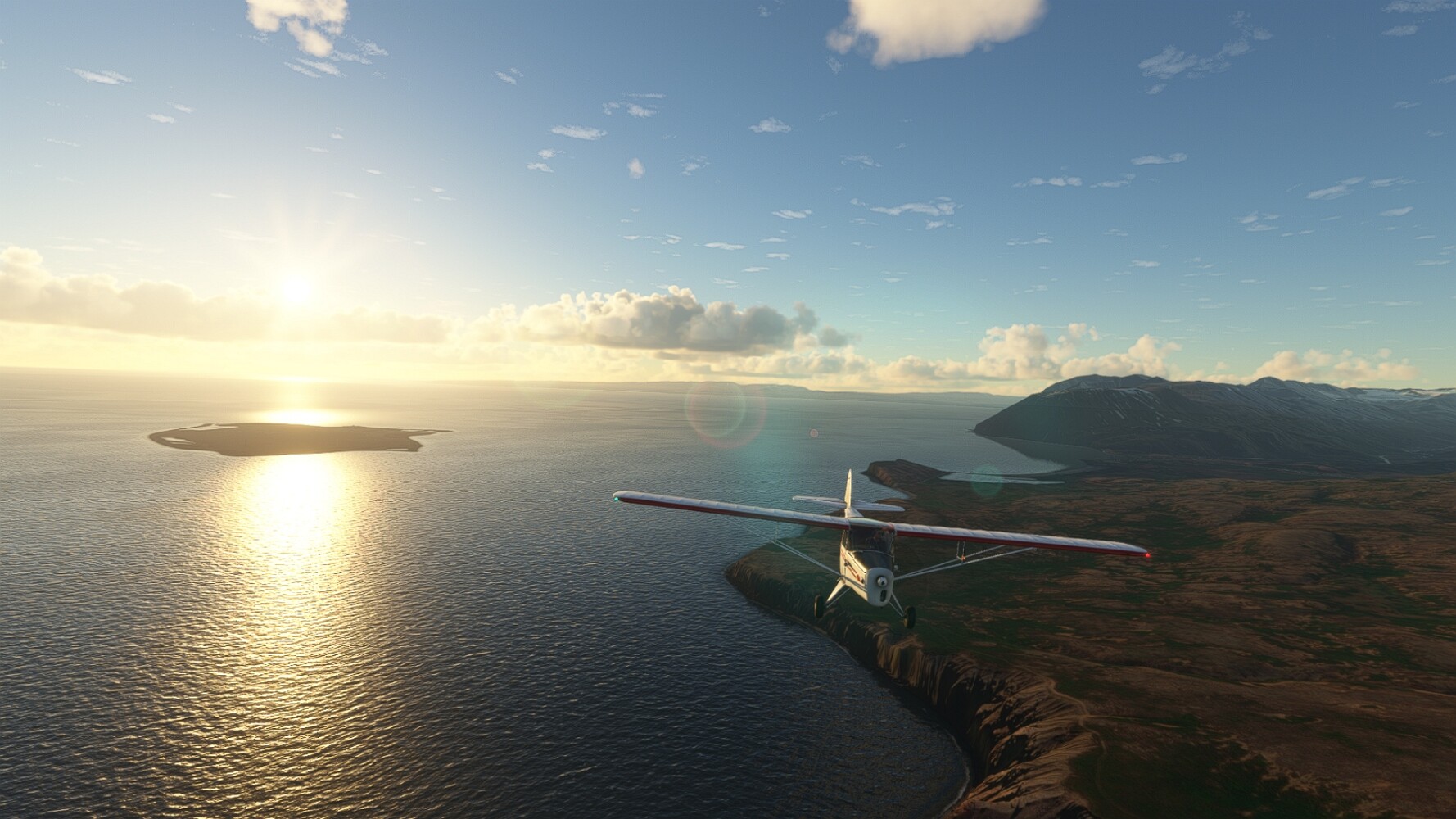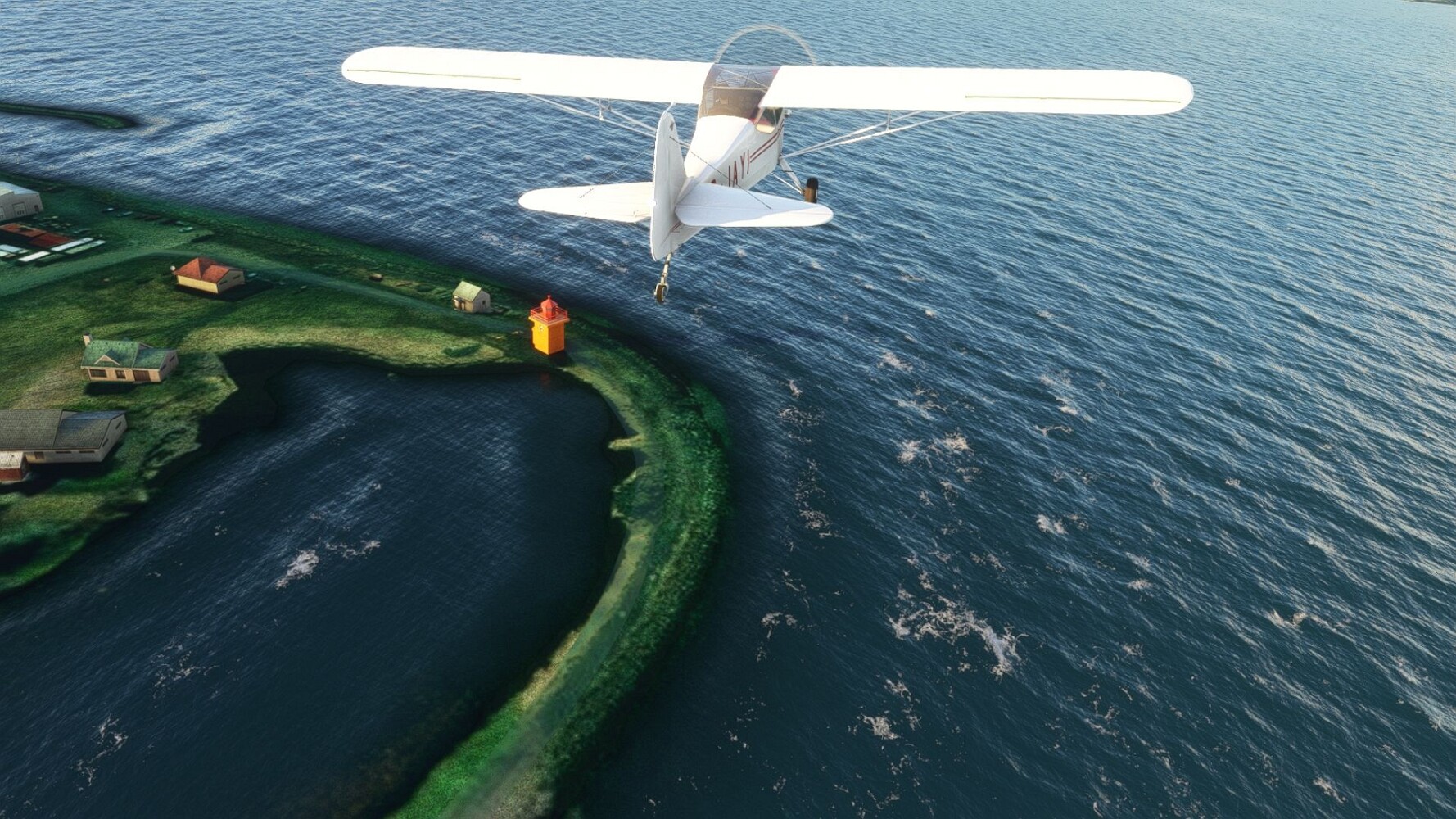 Noch ein Schlenker über den Flugplatzleuchtturm und weiter gings gen Westen. Hier wird wieder frisches Grün gepflanzt Sandformationen Es ist die Bucht Öxarfjördur. Es folgt ein längeres Stück flacher Steilküste. Und da findet sich schon das nächste Leuchtfeuer. Tjörnes, die Nummer 44. Wir erkennen es nun schon sofort: ein Standardmodell mittlerer Höhe. Aber es gibt eine herrliche Aussicht von hier oben. Die Insel Lundey ist auch leuchtbefeuert. Kaum zu erkennen. Putzig, die fünfunfvierzig... Und am nördlichen Ortsbeginn von Husavik steht der nächste, der ist aber nun wirklich ein besonderes Stück. Zitronengelb, halbrund und... schick gestaltet: Húsavikurviti Hätte ihn in die 1930er Jahre datiert... Nummer 46! Er thront in der Tat über dem Hafen des Ortes. Nun kommen deutlich höhere Berge in Sicht. Da rauscht ein Wasserfall ins Meer. Hier gibt nun wirklich einsame Buchten. Und vor der Küste Flatey, das auch von einem Leuchtfeuer gekennzeichnet ist. Und es gibt eine Kirche, die sieht aber nicht so aus wie in der virtuellen Welt, das scheint ein Stellvertretermodell aus einem Addon zu sein. Aber nett anzusehen ist sie trotzdem. Der Turm ist allerdings natürlich naturgetreu umgesetzt, die 47. Solartechnik ist auch zu finden. Und hier der Beweis: er erfüllt seine Funktion! Am Morgen nach dieser ungeplanen Unterbrechung gings weiter gen Westen. Hier liegt überall noch Schnee. In dieser Einsamkeit findet sich aber dann doch noch ein Leuchtturm. Fast nicht zu erkennen: die 48. Das Leuchtfeuer von Gjörgurtá Wie die Region sehr abgelegen. Hier geht es jetzt in den Eyjafjö... Überall stürzen Bäche dem Meer entgegen. Die Insel Hrisey Dalvík Am Ostufer der Bucht liegt der Ort Svalbardseyri, Dessen Landzunge wird von einem kleinen Standardmodell gekennzeichnet. Die Nummer 49. Das Ziel der Etappe kommt in Sicht, Akureyri, die größte Siedlung der Region mit dem größten Flugplatz. Der macht schon was her. Die Umsetzung stammt von Asobo und war Teil des World Updates XV. Teil 09Teil 11