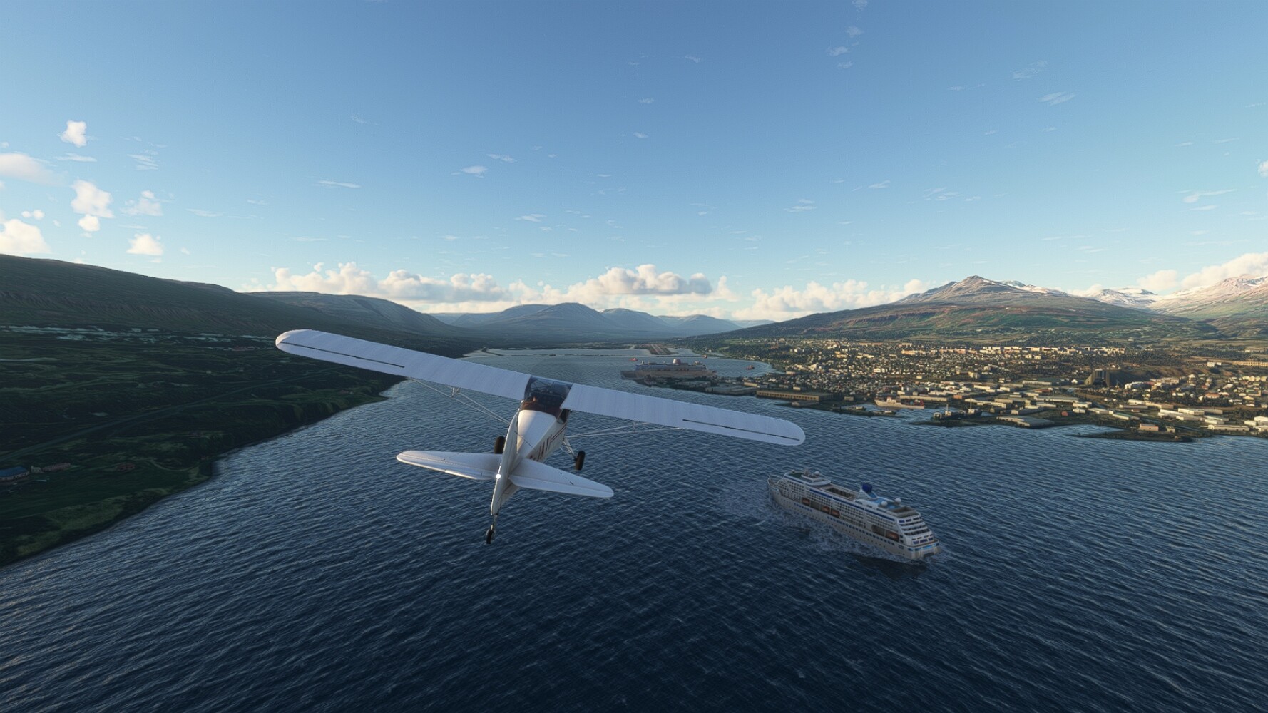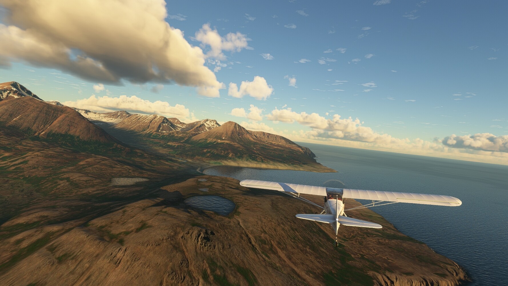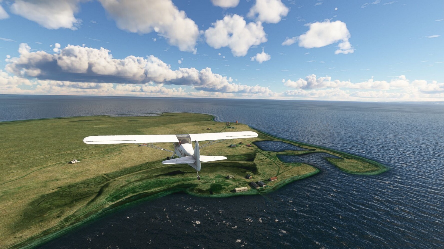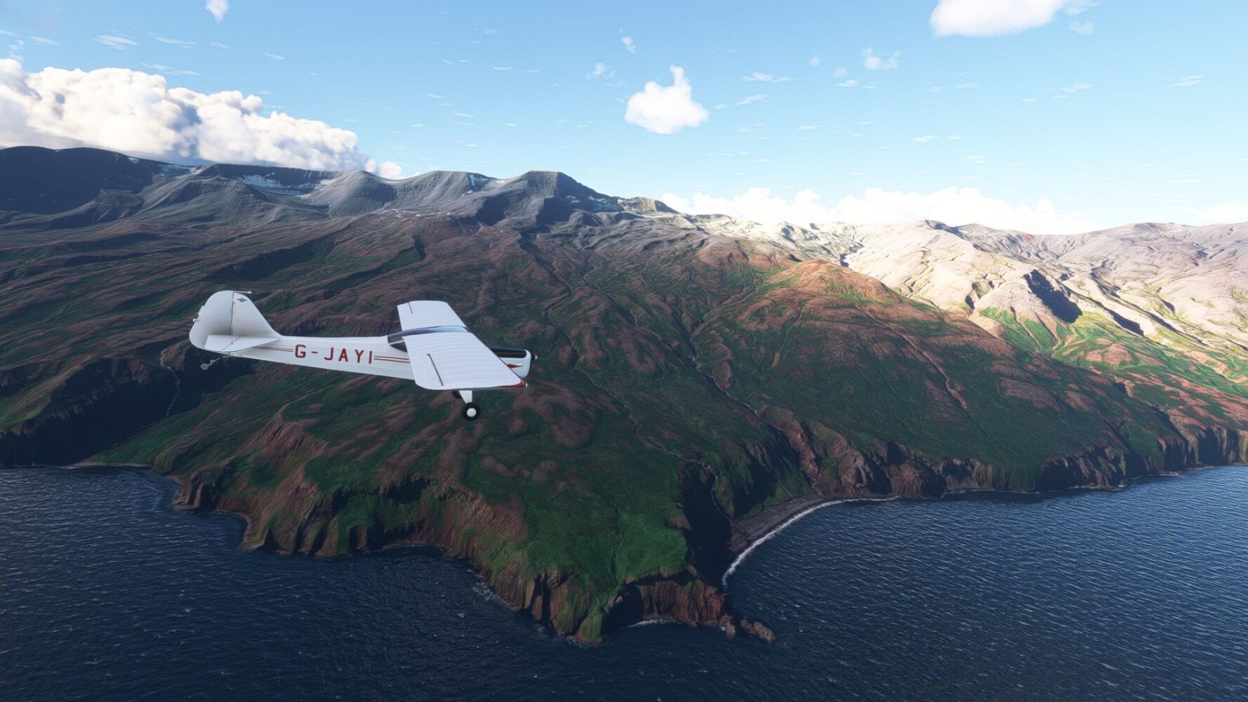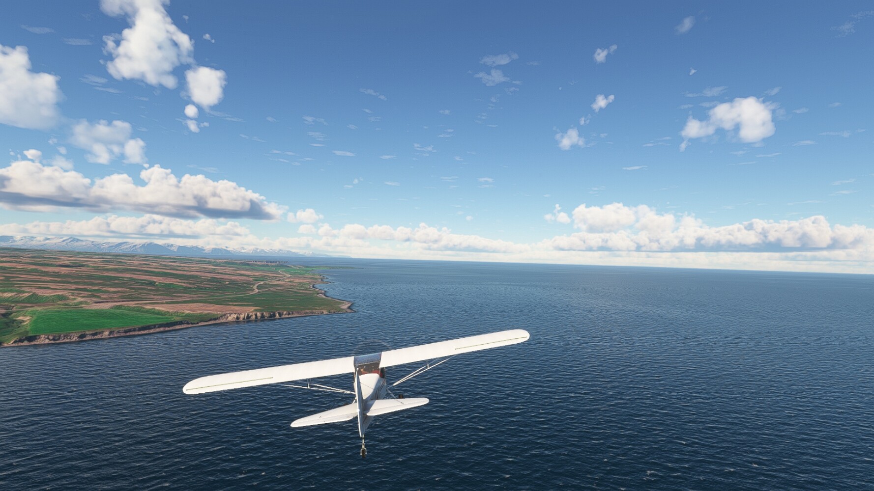 Noch ein Schlenker über den Flugplatzleuchtturm und weiter gings gen Westen. Hier wird wieder frisches Grün gepflanzt Sandformationen Es ist die Bucht Öxarfjördur. Es folgt ein längeres Stück flacher Steilküste. Und da findet sich schon das nächste Leuchtfeuer. Tjörnes, die Nummer 44. Wir erkennen es nun schon sofort: ein Standardmodell mittlerer Höhe. Aber es gibt eine herrliche Aussicht von hier oben. Die Insel Lundey ist auch leuchtbefeuert. Kaum zu erkennen. Putzig, die fünfunfvierzig... Und am nördlichen Ortsbeginn von Husavik steht der nächste, der ist aber nun wirklich ein besonderes Stück. Zitronengelb, halbrund und... schick gestaltet: Húsavikurviti Hätte ihn in die 1930er Jahre datiert... Nummer 46! Er thront in der Tat über dem Hafen des Ortes. Nun kommen deutlich höhere Berge in Sicht. Da rauscht ein Wasserfall ins Meer. Hier gibt nun wirklich einsame Buchten. Und vor der Küste Flatey, das auch von einem Leuchtfeuer gekennzeichnet ist. Und es gibt eine Kirche, die sieht aber nicht so aus wie in der virtuellen Welt, das scheint ein Stellvertretermodell aus einem Addon zu sein. Aber nett anzusehen ist sie trotzdem. Der Turm ist allerdings natürlich naturgetreu umgesetzt, die 47. Solartechnik ist auch zu finden. Und hier der Beweis: er erfüllt seine Funktion! Am Morgen nach dieser ungeplanen Unterbrechung gings weiter gen Westen. Hier liegt überall noch Schnee. In dieser Einsamkeit findet sich aber dann doch noch ein Leuchtturm. Fast nicht zu erkennen: die 48. Das Leuchtfeuer von Gjörgurtá Wie die Region sehr abgelegen. Hier geht es jetzt in den Eyjafjö... Überall stürzen Bäche dem Meer entgegen. Die Insel Hrisey Dalvík Am Ostufer der Bucht liegt der Ort Svalbardseyri, Dessen Landzunge wird von einem kleinen Standardmodell gekennzeichnet. Die Nummer 49. Das Ziel der Etappe kommt in Sicht, Akureyri, die größte Siedlung der Region mit dem größten Flugplatz. Der macht schon was her. Die Umsetzung stammt von Asobo und war Teil des World Updates XV. Teil 09Teil 11