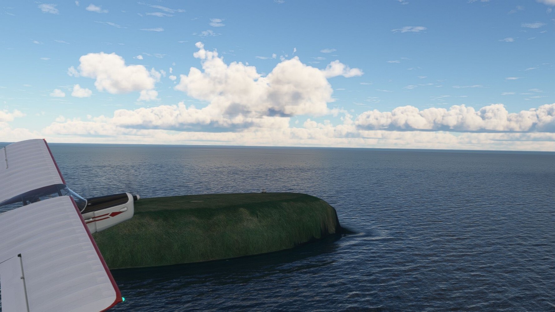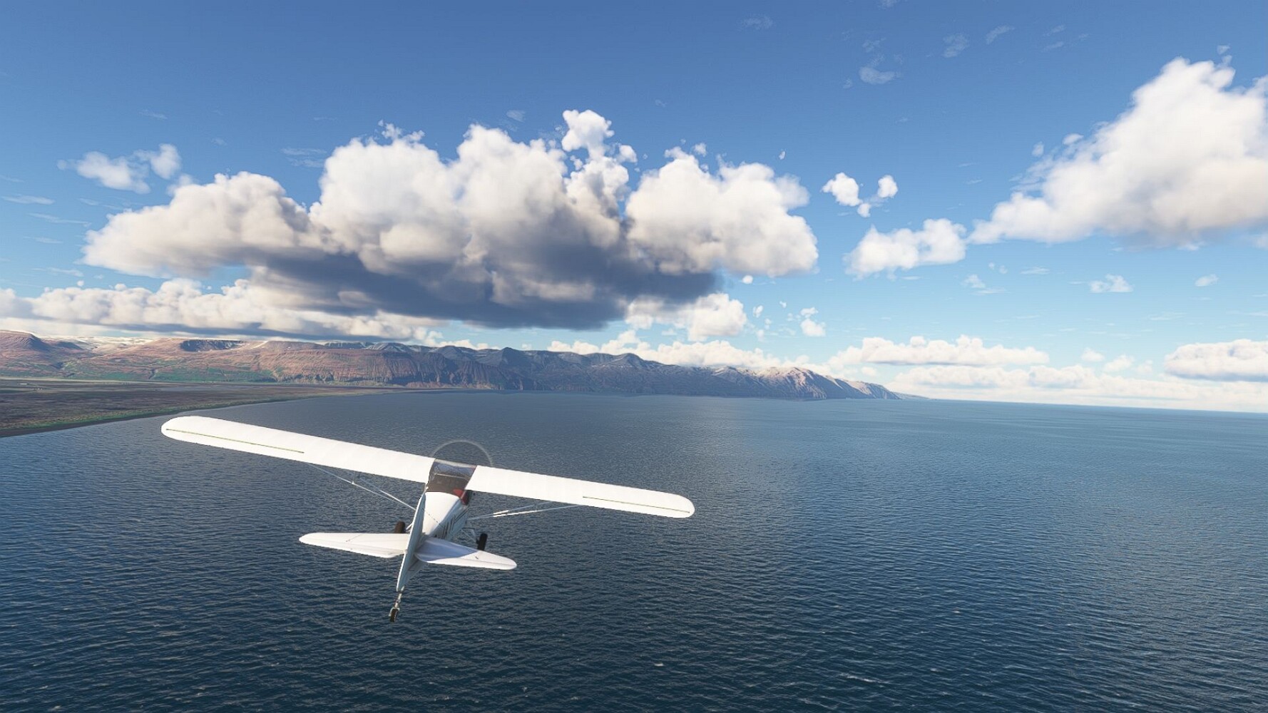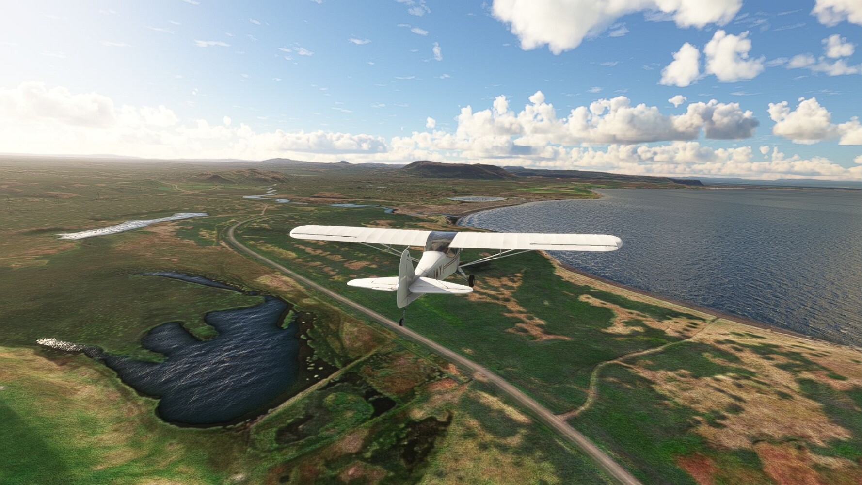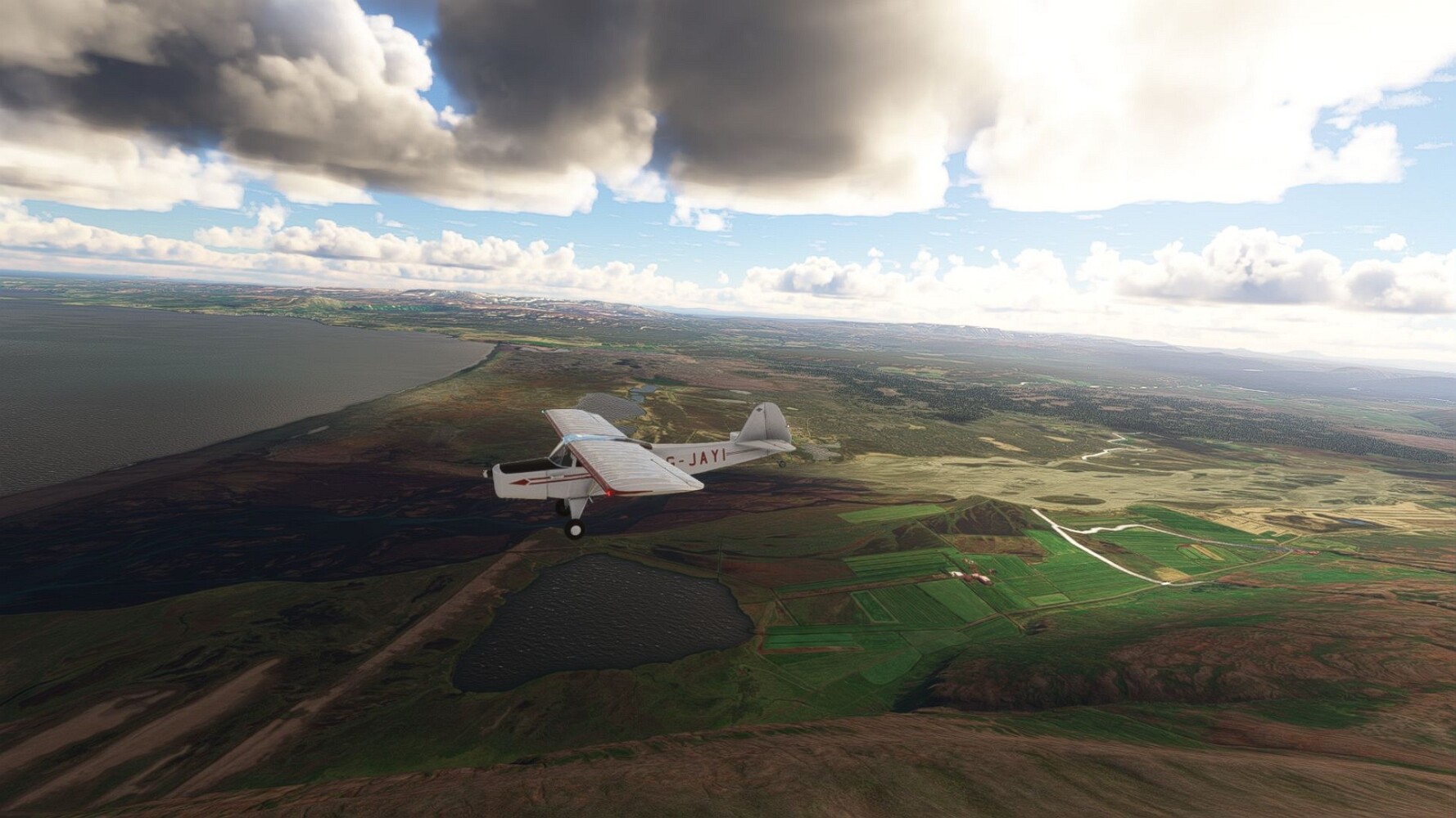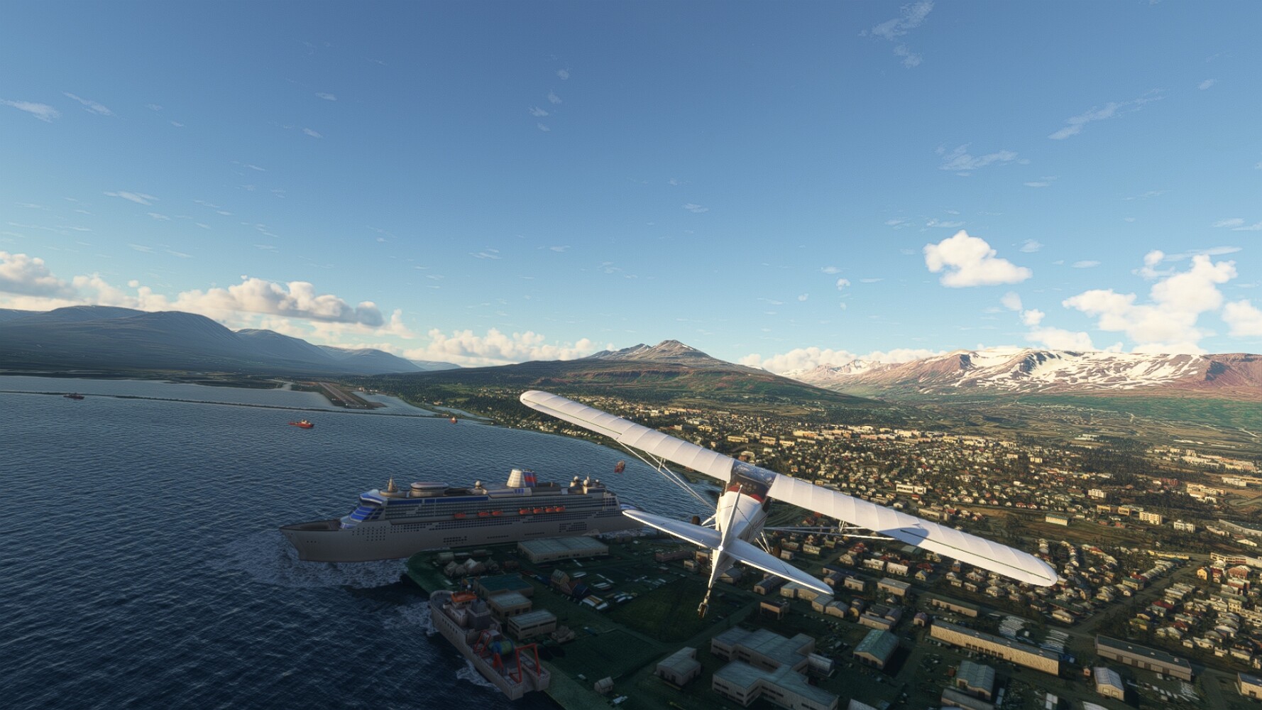Noch ein Schlenker über den Flugplatzleuchtturm und weiter gings gen Westen. Hier wird wieder frisches Grün gepflanzt Sandformationen Es ist die Bucht Öxarfjördur. Es folgt ein längeres Stück flacher Steilküste. Und da findet sich schon das nächste Leuchtfeuer. Tjörnes, die Nummer 44. Wir erkennen es nun schon sofort: ein Standardmodell mittlerer Höhe. Aber es gibt eine herrliche Aussicht von hier oben. Die Insel Lundey ist auch leuchtbefeuert. Kaum zu erkennen. Putzig, die fünfunfvierzig... Und am nördlichen Ortsbeginn von Husavik steht der nächste, der ist aber nun wirklich ein besonderes Stück. Zitronengelb, halbrund und... schick gestaltet: Húsavikurviti Hätte ihn in die 1930er Jahre datiert... Nummer 46! Er thront in der Tat über dem Hafen des Ortes. Nun kommen deutlich höhere Berge in Sicht. Da rauscht ein Wasserfall ins Meer. Hier gibt nun wirklich einsame Buchten. Und vor der Küste Flatey, das auch von einem Leuchtfeuer gekennzeichnet ist. Und es gibt eine Kirche, die sieht aber nicht so aus wie in der virtuellen Welt, das scheint ein Stellvertretermodell aus einem Addon zu sein. Aber nett anzusehen ist sie trotzdem. Der Turm ist allerdings natürlich naturgetreu umgesetzt, die 47. Solartechnik ist auch zu finden. Und hier der Beweis: er erfüllt seine Funktion! Am Morgen nach dieser ungeplanen Unterbrechung gings weiter gen Westen. Hier liegt überall noch Schnee. In dieser Einsamkeit findet sich aber dann doch noch ein Leuchtturm. Fast nicht zu erkennen: die 48. Das Leuchtfeuer von Gjörgurtá Wie die Region sehr abgelegen. Hier geht es jetzt in den Eyjafjö... Überall stürzen Bäche dem Meer entgegen. Die Insel Hrisey Dalvík Am Ostufer der Bucht liegt der Ort Svalbardseyri, Dessen Landzunge wird von einem kleinen Standardmodell gekennzeichnet. Die Nummer 49. Das Ziel der Etappe kommt in Sicht, Akureyri, die größte Siedlung der Region mit dem größten Flugplatz. Der macht schon was her. Die Umsetzung stammt von Asobo und war Teil des World Updates XV. Teil 09Teil 11