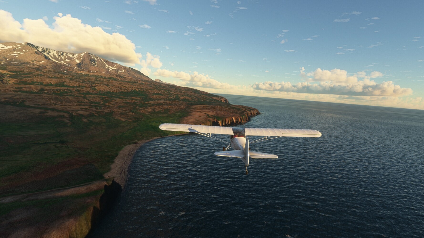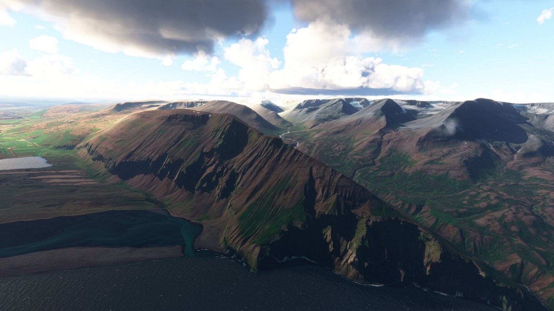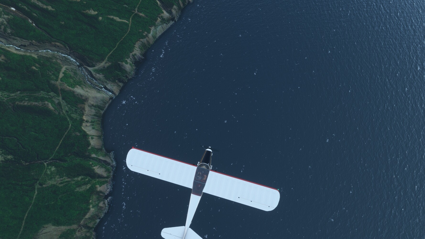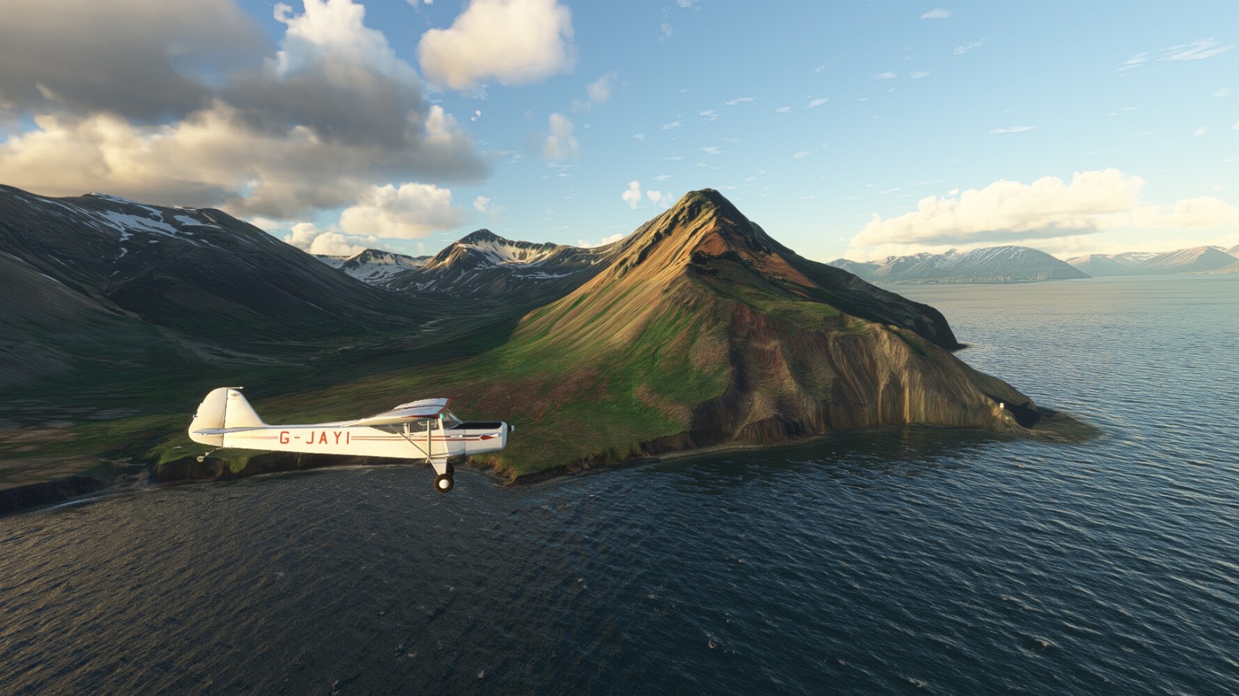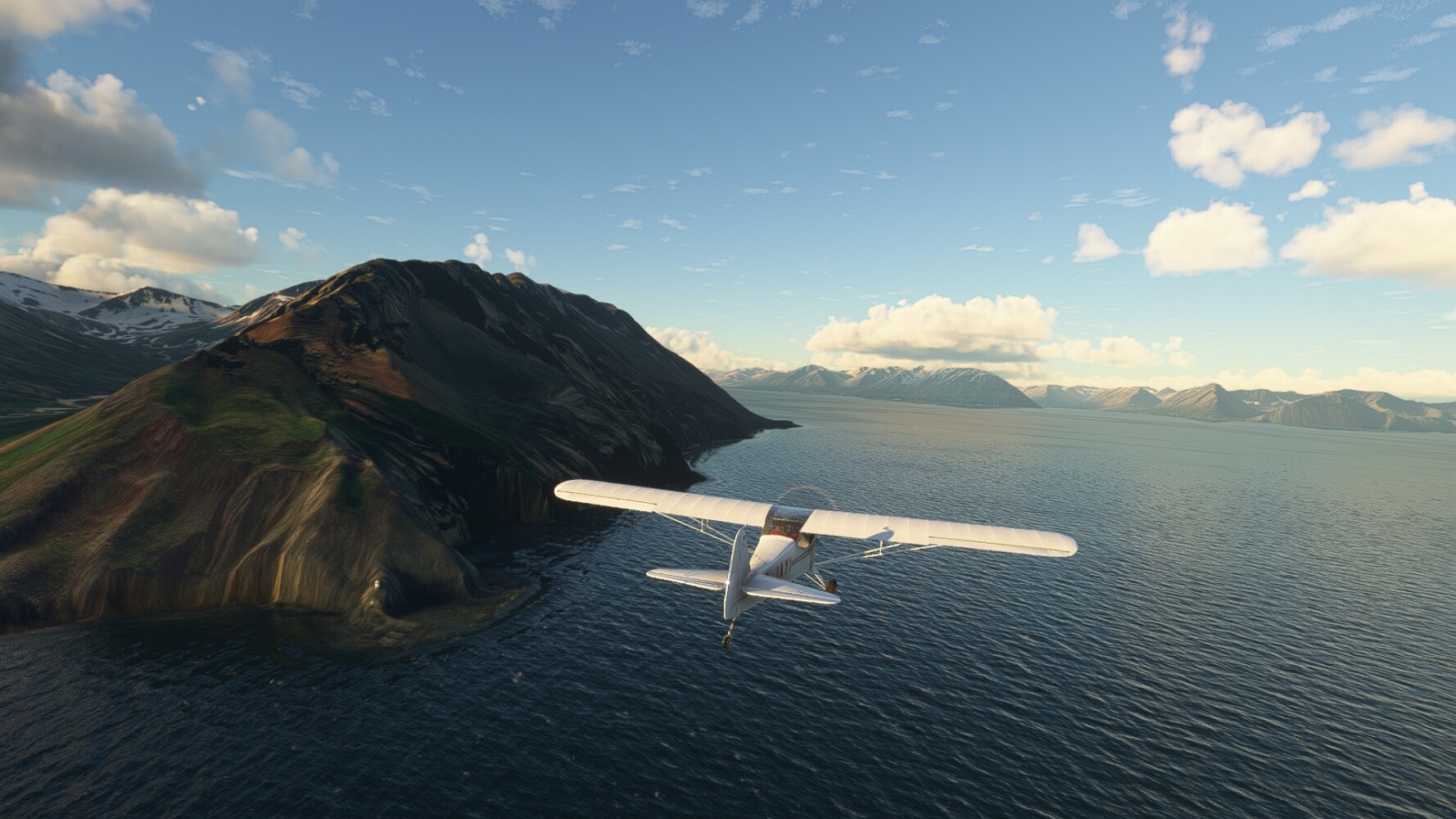 Noch ein Schlenker über den Flugplatzleuchtturm und weiter gings gen Westen. Hier wird wieder frisches Grün gepflanzt Sandformationen Es ist die Bucht Öxarfjördur. Es folgt ein längeres Stück flacher Steilküste. Und da findet sich schon das nächste Leuchtfeuer. Tjörnes, die Nummer 44. Wir erkennen es nun schon sofort: ein Standardmodell mittlerer Höhe. Aber es gibt eine herrliche Aussicht von hier oben. Die Insel Lundey ist auch leuchtbefeuert. Kaum zu erkennen. Putzig, die fünfunfvierzig... Und am nördlichen Ortsbeginn von Husavik steht der nächste, der ist aber nun wirklich ein besonderes Stück. Zitronengelb, halbrund und... schick gestaltet: Húsavikurviti Hätte ihn in die 1930er Jahre datiert... Nummer 46! Er thront in der Tat über dem Hafen des Ortes. Nun kommen deutlich höhere Berge in Sicht. Da rauscht ein Wasserfall ins Meer. Hier gibt nun wirklich einsame Buchten. Und vor der Küste Flatey, das auch von einem Leuchtfeuer gekennzeichnet ist. Und es gibt eine Kirche, die sieht aber nicht so aus wie in der virtuellen Welt, das scheint ein Stellvertretermodell aus einem Addon zu sein. Aber nett anzusehen ist sie trotzdem. Der Turm ist allerdings natürlich naturgetreu umgesetzt, die 47. Solartechnik ist auch zu finden. Und hier der Beweis: er erfüllt seine Funktion! Am Morgen nach dieser ungeplanen Unterbrechung gings weiter gen Westen. Hier liegt überall noch Schnee. In dieser Einsamkeit findet sich aber dann doch noch ein Leuchtturm. Fast nicht zu erkennen: die 48. Das Leuchtfeuer von Gjörgurtá Wie die Region sehr abgelegen. Hier geht es jetzt in den Eyjafjö... Überall stürzen Bäche dem Meer entgegen. Die Insel Hrisey Dalvík Am Ostufer der Bucht liegt der Ort Svalbardseyri, Dessen Landzunge wird von einem kleinen Standardmodell gekennzeichnet. Die Nummer 49. Das Ziel der Etappe kommt in Sicht, Akureyri, die größte Siedlung der Region mit dem größten Flugplatz. Der macht schon was her. Die Umsetzung stammt von Asobo und war Teil des World Updates XV. Teil 09Teil 11