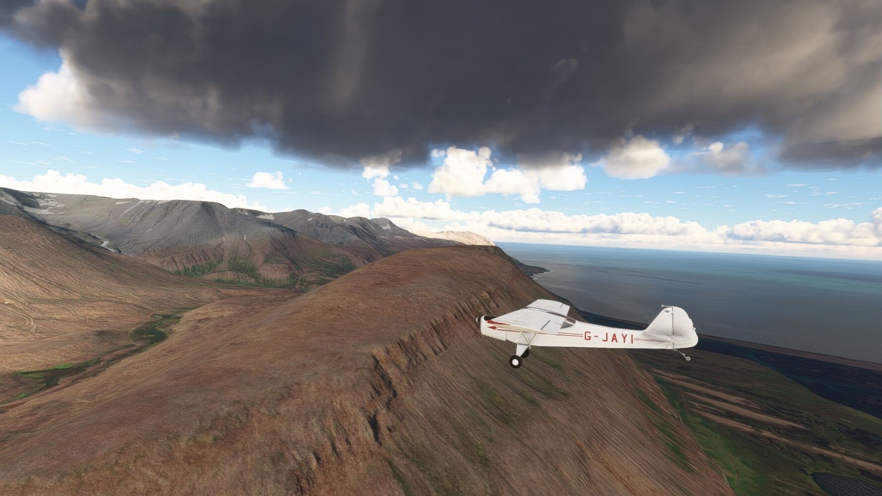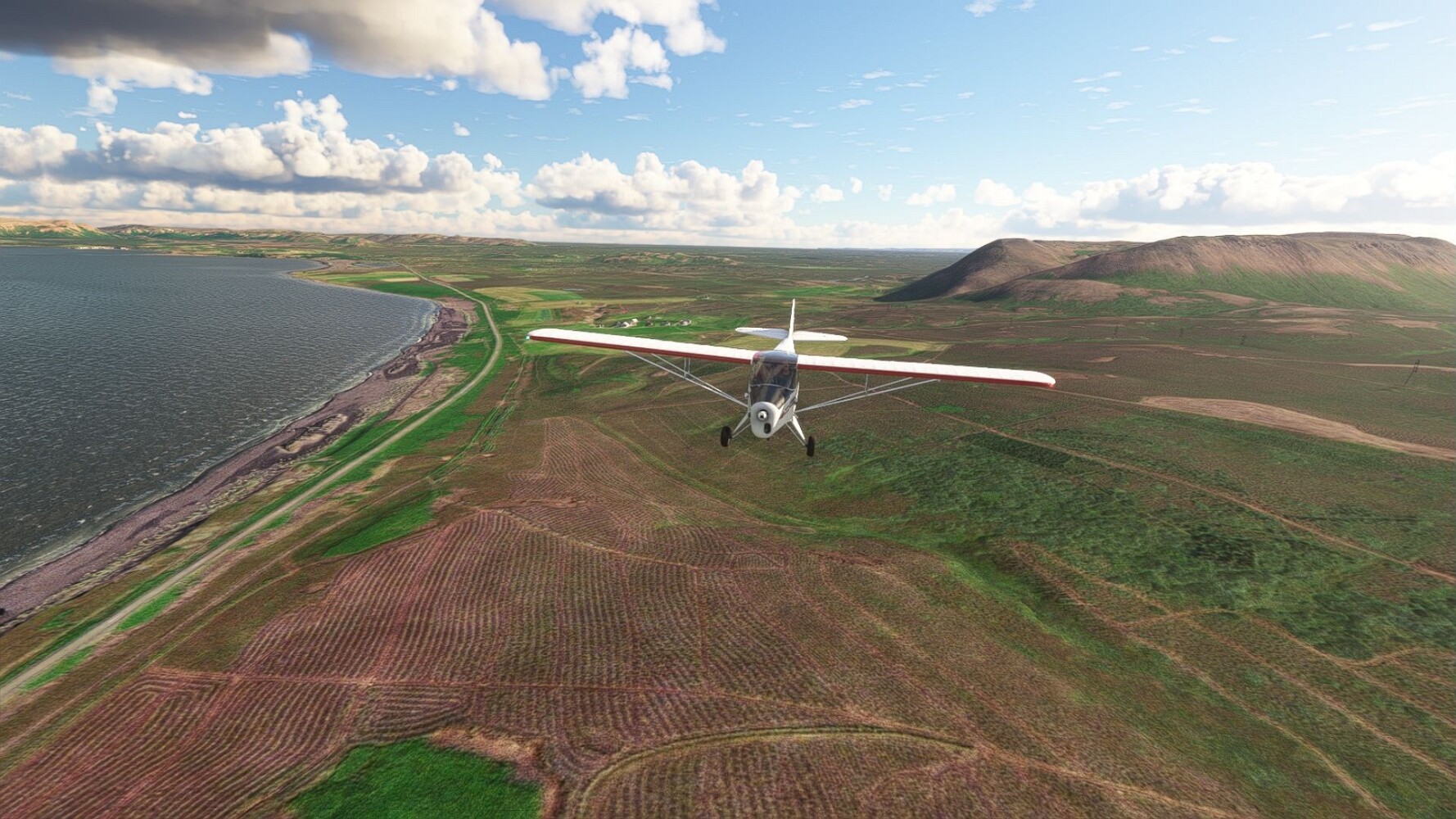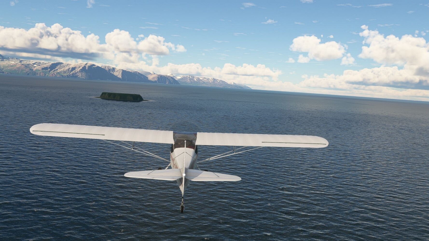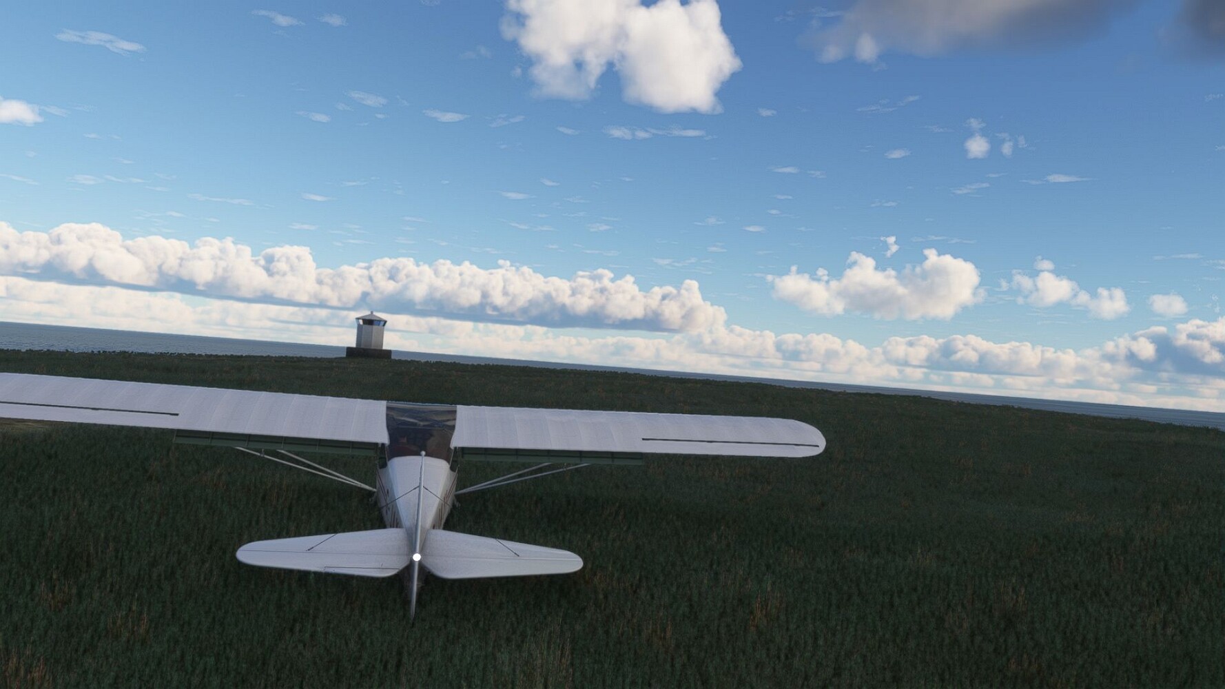 Noch ein Schlenker über den Flugplatzleuchtturm und weiter gings gen Westen. Hier wird wieder frisches Grün gepflanzt Sandformationen Es ist die Bucht Öxarfjördur. Es folgt ein längeres Stück flacher Steilküste. Und da findet sich schon das nächste Leuchtfeuer. Tjörnes, die Nummer 44. Wir erkennen es nun schon sofort: ein Standardmodell mittlerer Höhe. Aber es gibt eine herrliche Aussicht von hier oben. Die Insel Lundey ist auch leuchtbefeuert. Kaum zu erkennen. Putzig, die fünfunfvierzig... Und am nördlichen Ortsbeginn von Husavik steht der nächste, der ist aber nun wirklich ein besonderes Stück. Zitronengelb, halbrund und... schick gestaltet: Húsavikurviti Hätte ihn in die 1930er Jahre datiert... Nummer 46! Er thront in der Tat über dem Hafen des Ortes. Nun kommen deutlich höhere Berge in Sicht. Da rauscht ein Wasserfall ins Meer. Hier gibt nun wirklich einsame Buchten. Und vor der Küste Flatey, das auch von einem Leuchtfeuer gekennzeichnet ist. Und es gibt eine Kirche, die sieht aber nicht so aus wie in der virtuellen Welt, das scheint ein Stellvertretermodell aus einem Addon zu sein. Aber nett anzusehen ist sie trotzdem. Der Turm ist allerdings natürlich naturgetreu umgesetzt, die 47. Solartechnik ist auch zu finden. Und hier der Beweis: er erfüllt seine Funktion! Am Morgen nach dieser ungeplanen Unterbrechung gings weiter gen Westen. Hier liegt überall noch Schnee. In dieser Einsamkeit findet sich aber dann doch noch ein Leuchtturm. Fast nicht zu erkennen: die 48. Das Leuchtfeuer von Gjörgurtá Wie die Region sehr abgelegen. Hier geht es jetzt in den Eyjafjö... Überall stürzen Bäche dem Meer entgegen. Die Insel Hrisey Dalvík Am Ostufer der Bucht liegt der Ort Svalbardseyri, Dessen Landzunge wird von einem kleinen Standardmodell gekennzeichnet. Die Nummer 49. Das Ziel der Etappe kommt in Sicht, Akureyri, die größte Siedlung der Region mit dem größten Flugplatz. Der macht schon was her. Die Umsetzung stammt von Asobo und war Teil des World Updates XV. Teil 09Teil 11