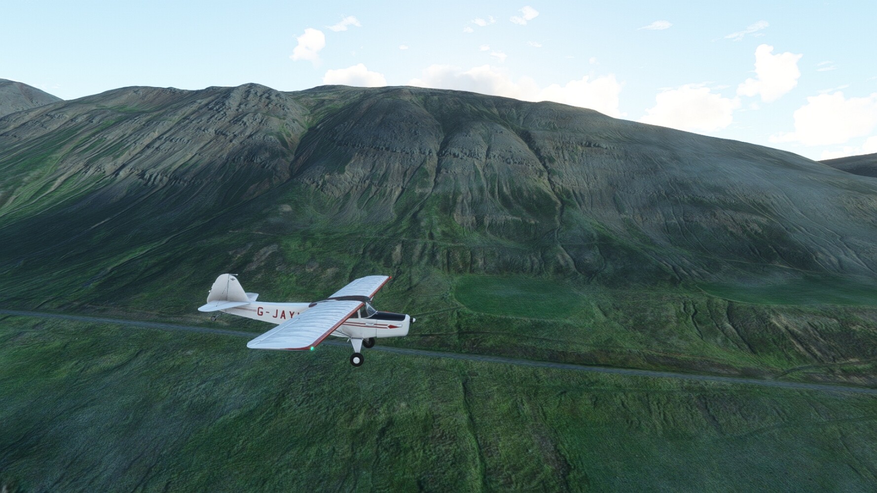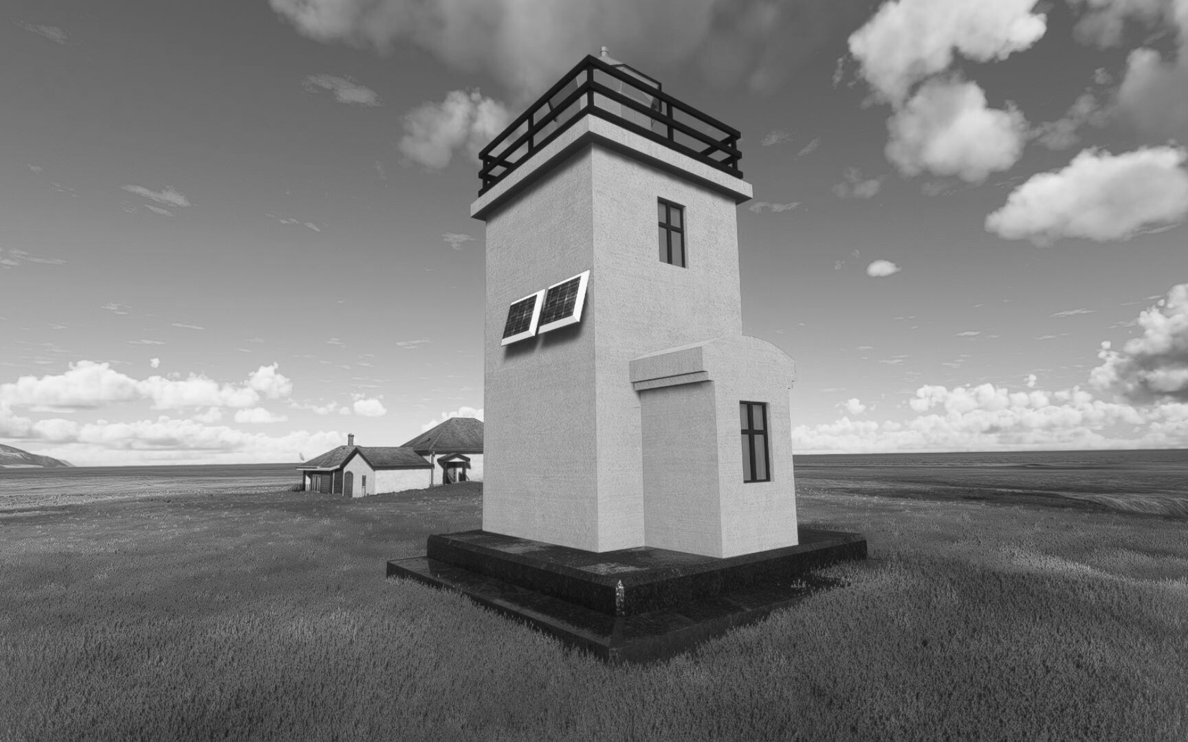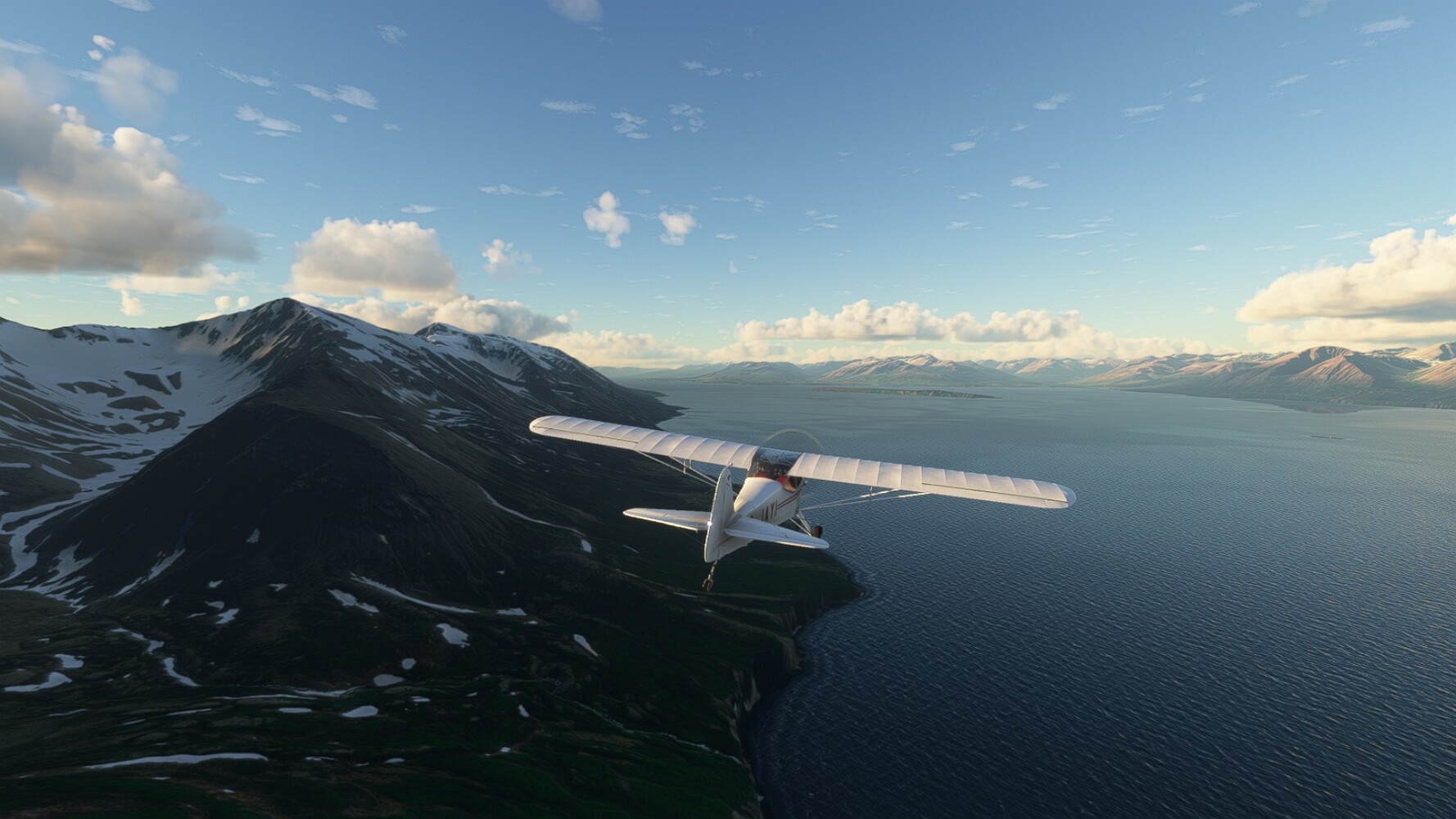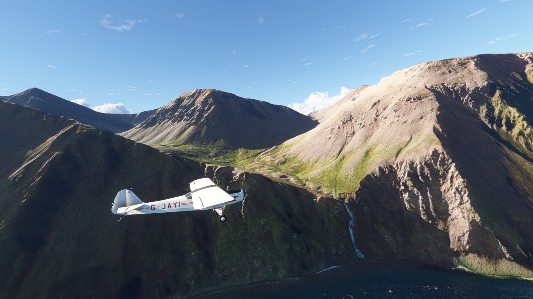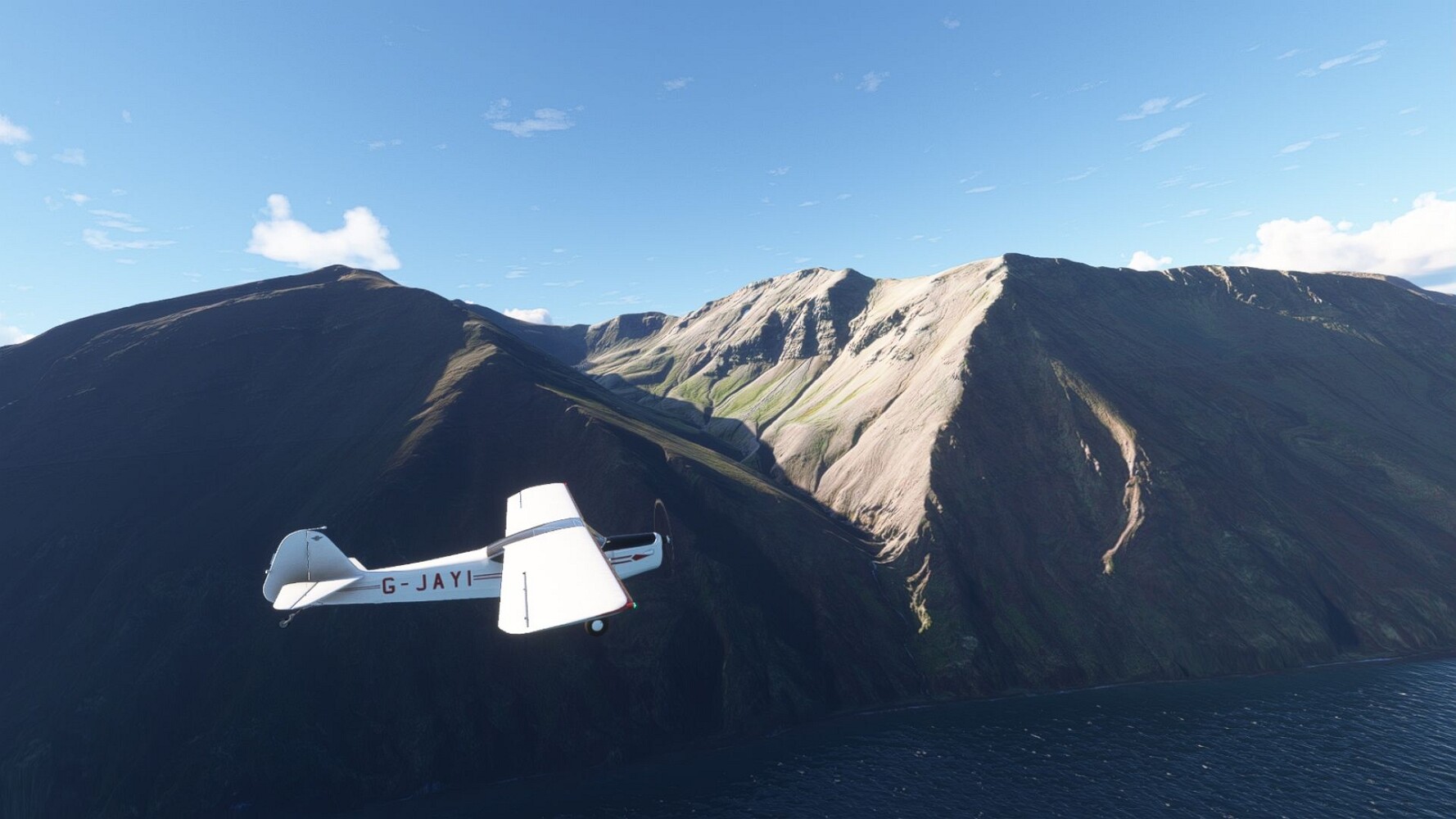 Noch ein Schlenker über den Flugplatzleuchtturm und weiter gings gen Westen. Hier wird wieder frisches Grün gepflanzt Sandformationen Es ist die Bucht Öxarfjördur. Es folgt ein längeres Stück flacher Steilküste. Und da findet sich schon das nächste Leuchtfeuer. Tjörnes, die Nummer 44. Wir erkennen es nun schon sofort: ein Standardmodell mittlerer Höhe. Aber es gibt eine herrliche Aussicht von hier oben. Die Insel Lundey ist auch leuchtbefeuert. Kaum zu erkennen. Putzig, die fünfunfvierzig... Und am nördlichen Ortsbeginn von Husavik steht der nächste, der ist aber nun wirklich ein besonderes Stück. Zitronengelb, halbrund und... schick gestaltet: Húsavikurviti Hätte ihn in die 1930er Jahre datiert... Nummer 46! Er thront in der Tat über dem Hafen des Ortes. Nun kommen deutlich höhere Berge in Sicht. Da rauscht ein Wasserfall ins Meer. Hier gibt nun wirklich einsame Buchten. Und vor der Küste Flatey, das auch von einem Leuchtfeuer gekennzeichnet ist. Und es gibt eine Kirche, die sieht aber nicht so aus wie in der virtuellen Welt, das scheint ein Stellvertretermodell aus einem Addon zu sein. Aber nett anzusehen ist sie trotzdem. Der Turm ist allerdings natürlich naturgetreu umgesetzt, die 47. Solartechnik ist auch zu finden. Und hier der Beweis: er erfüllt seine Funktion! Am Morgen nach dieser ungeplanen Unterbrechung gings weiter gen Westen. Hier liegt überall noch Schnee. In dieser Einsamkeit findet sich aber dann doch noch ein Leuchtturm. Fast nicht zu erkennen: die 48. Das Leuchtfeuer von Gjörgurtá Wie die Region sehr abgelegen. Hier geht es jetzt in den Eyjafjö... Überall stürzen Bäche dem Meer entgegen. Die Insel Hrisey Dalvík Am Ostufer der Bucht liegt der Ort Svalbardseyri, Dessen Landzunge wird von einem kleinen Standardmodell gekennzeichnet. Die Nummer 49. Das Ziel der Etappe kommt in Sicht, Akureyri, die größte Siedlung der Region mit dem größten Flugplatz. Der macht schon was her. Die Umsetzung stammt von Asobo und war Teil des World Updates XV. Teil 09Teil 11