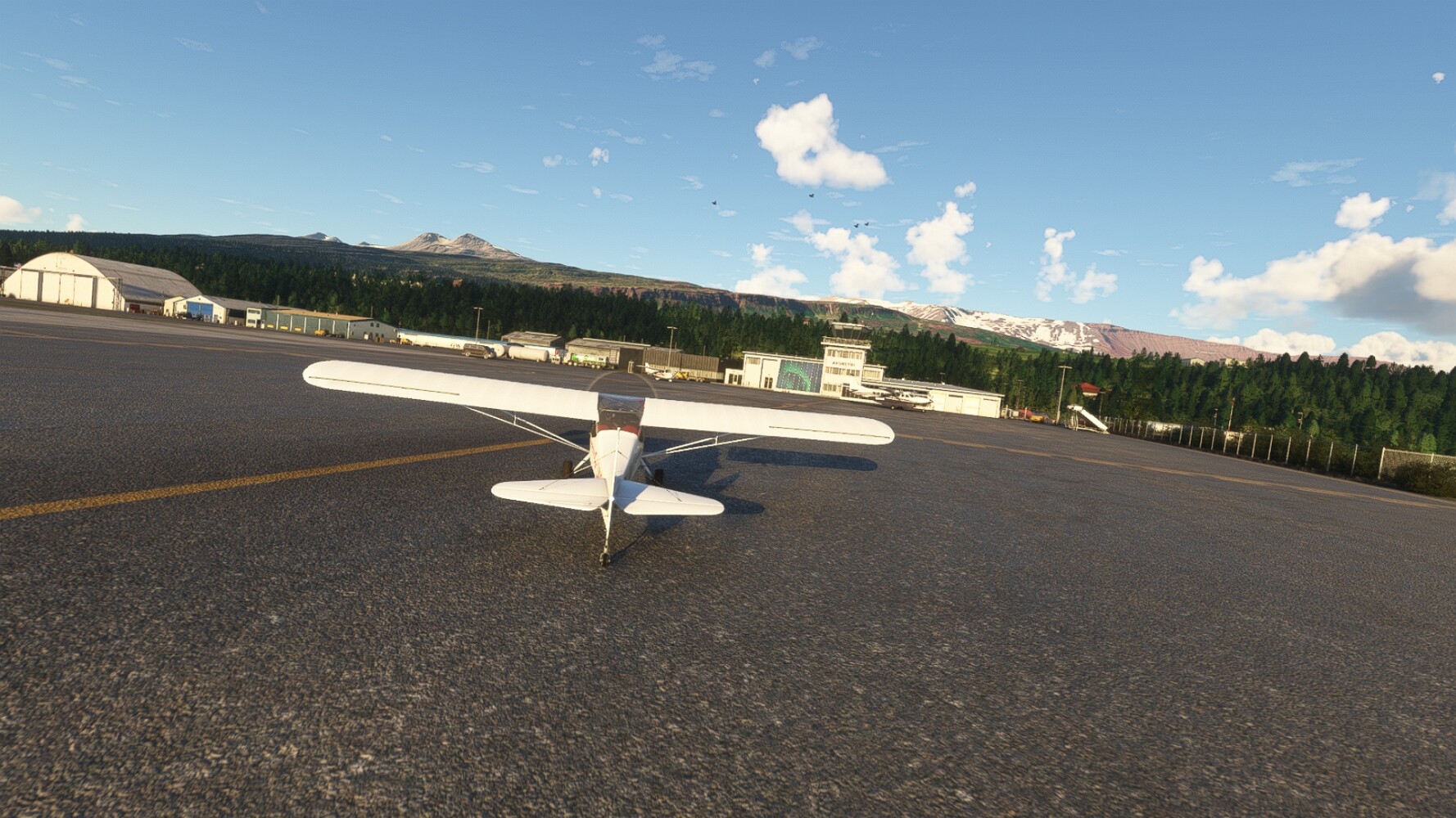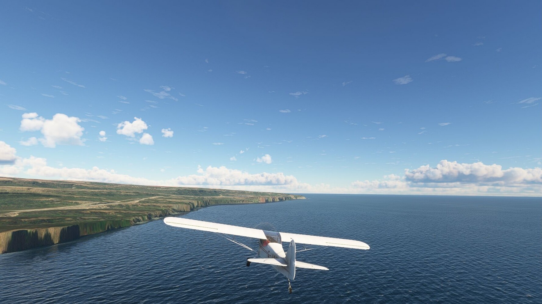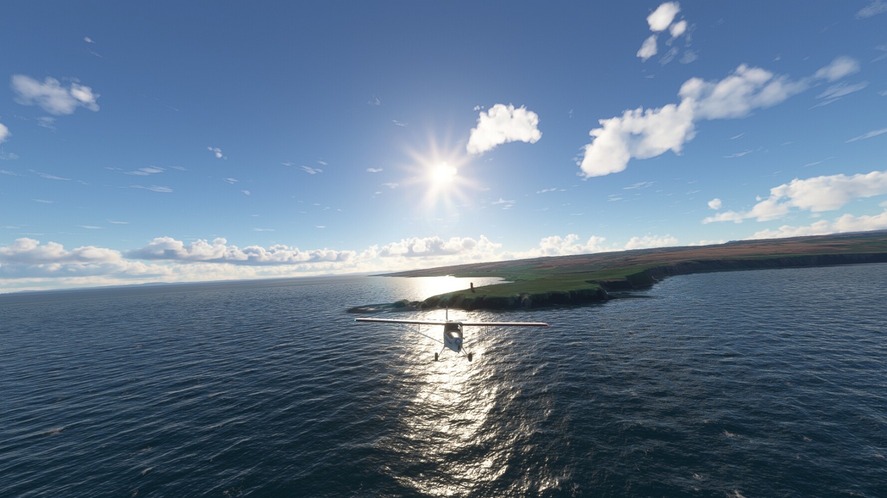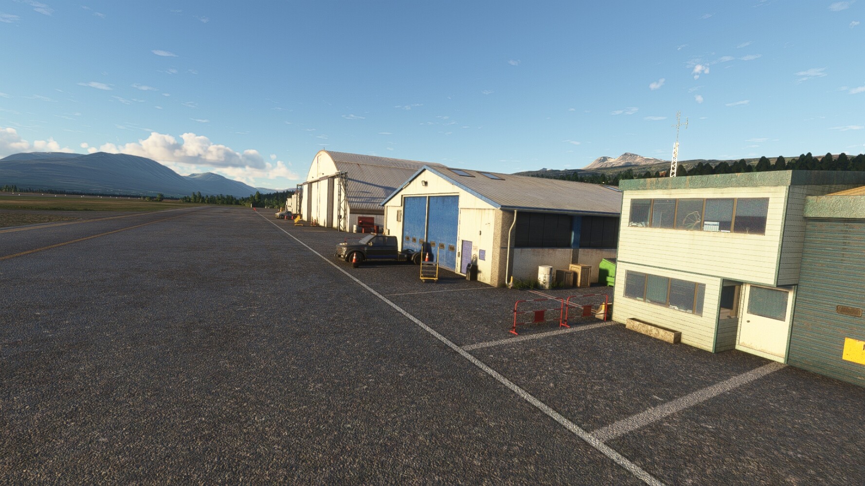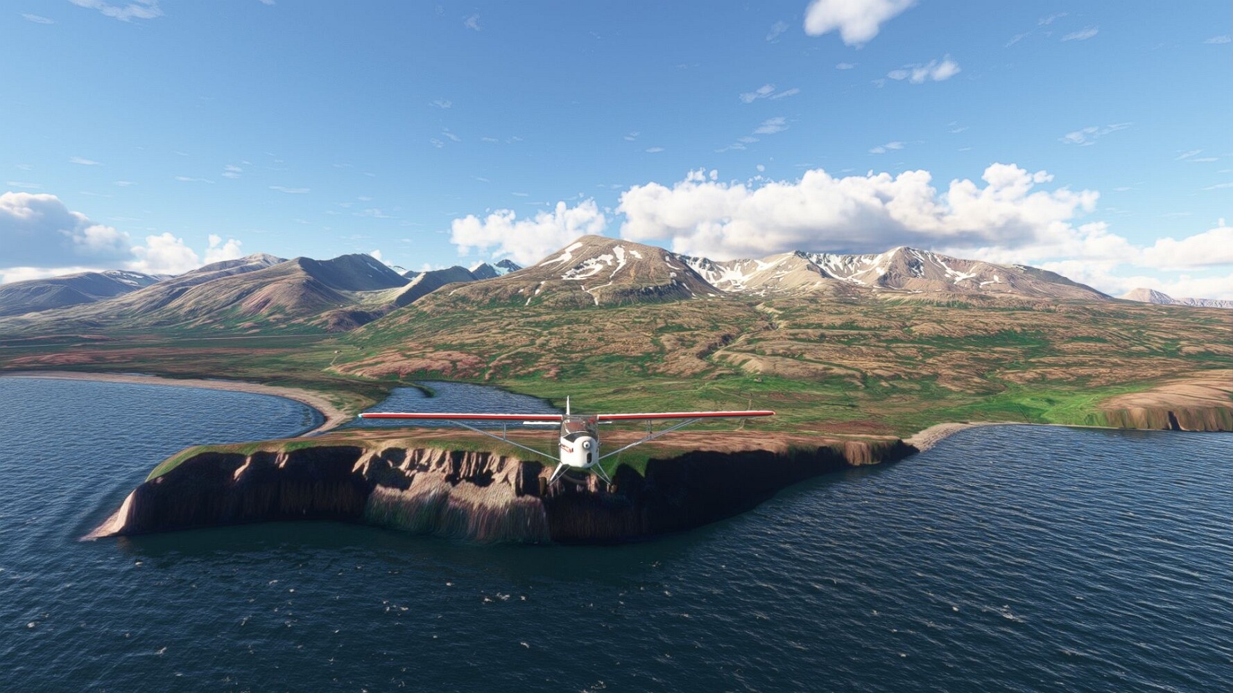 Noch ein Schlenker über den Flugplatzleuchtturm und weiter gings gen Westen. Hier wird wieder frisches Grün gepflanzt Sandformationen Es ist die Bucht Öxarfjördur. Es folgt ein längeres Stück flacher Steilküste. Und da findet sich schon das nächste Leuchtfeuer. Tjörnes, die Nummer 44. Wir erkennen es nun schon sofort: ein Standardmodell mittlerer Höhe. Aber es gibt eine herrliche Aussicht von hier oben. Die Insel Lundey ist auch leuchtbefeuert. Kaum zu erkennen. Putzig, die fünfunfvierzig... Und am nördlichen Ortsbeginn von Husavik steht der nächste, der ist aber nun wirklich ein besonderes Stück. Zitronengelb, halbrund und... schick gestaltet: Húsavikurviti Hätte ihn in die 1930er Jahre datiert... Nummer 46! Er thront in der Tat über dem Hafen des Ortes. Nun kommen deutlich höhere Berge in Sicht. Da rauscht ein Wasserfall ins Meer. Hier gibt nun wirklich einsame Buchten. Und vor der Küste Flatey, das auch von einem Leuchtfeuer gekennzeichnet ist. Und es gibt eine Kirche, die sieht aber nicht so aus wie in der virtuellen Welt, das scheint ein Stellvertretermodell aus einem Addon zu sein. Aber nett anzusehen ist sie trotzdem. Der Turm ist allerdings natürlich naturgetreu umgesetzt, die 47. Solartechnik ist auch zu finden. Und hier der Beweis: er erfüllt seine Funktion! Am Morgen nach dieser ungeplanen Unterbrechung gings weiter gen Westen. Hier liegt überall noch Schnee. In dieser Einsamkeit findet sich aber dann doch noch ein Leuchtturm. Fast nicht zu erkennen: die 48. Das Leuchtfeuer von Gjörgurtá Wie die Region sehr abgelegen. Hier geht es jetzt in den Eyjafjö... Überall stürzen Bäche dem Meer entgegen. Die Insel Hrisey Dalvík Am Ostufer der Bucht liegt der Ort Svalbardseyri, Dessen Landzunge wird von einem kleinen Standardmodell gekennzeichnet. Die Nummer 49. Das Ziel der Etappe kommt in Sicht, Akureyri, die größte Siedlung der Region mit dem größten Flugplatz. Der macht schon was her. Die Umsetzung stammt von Asobo und war Teil des World Updates XV. Teil 09Teil 11