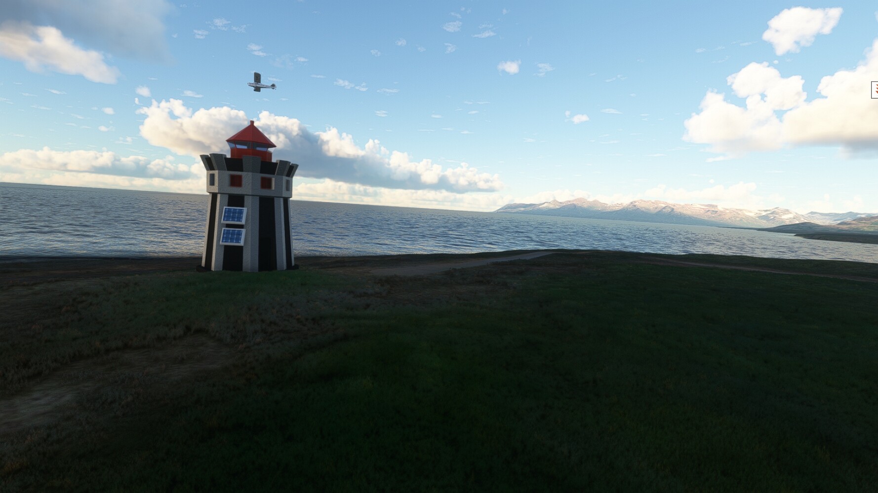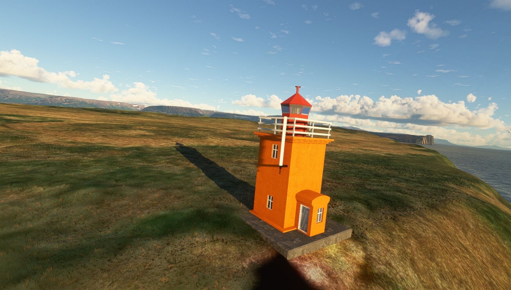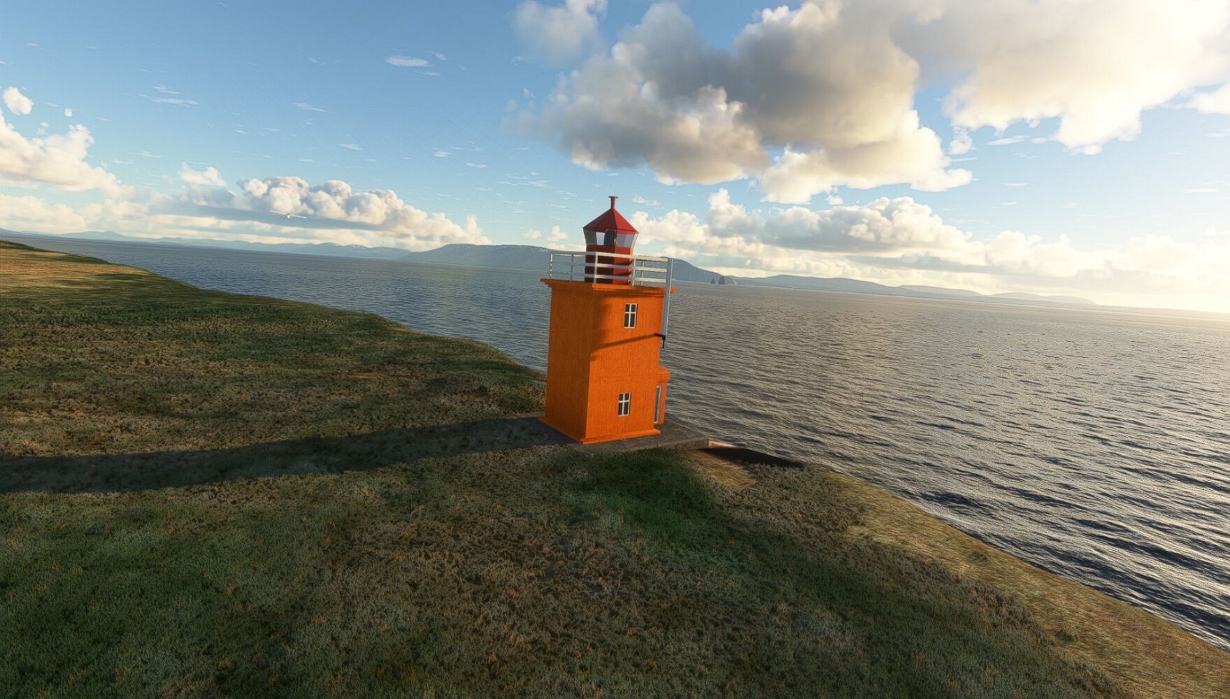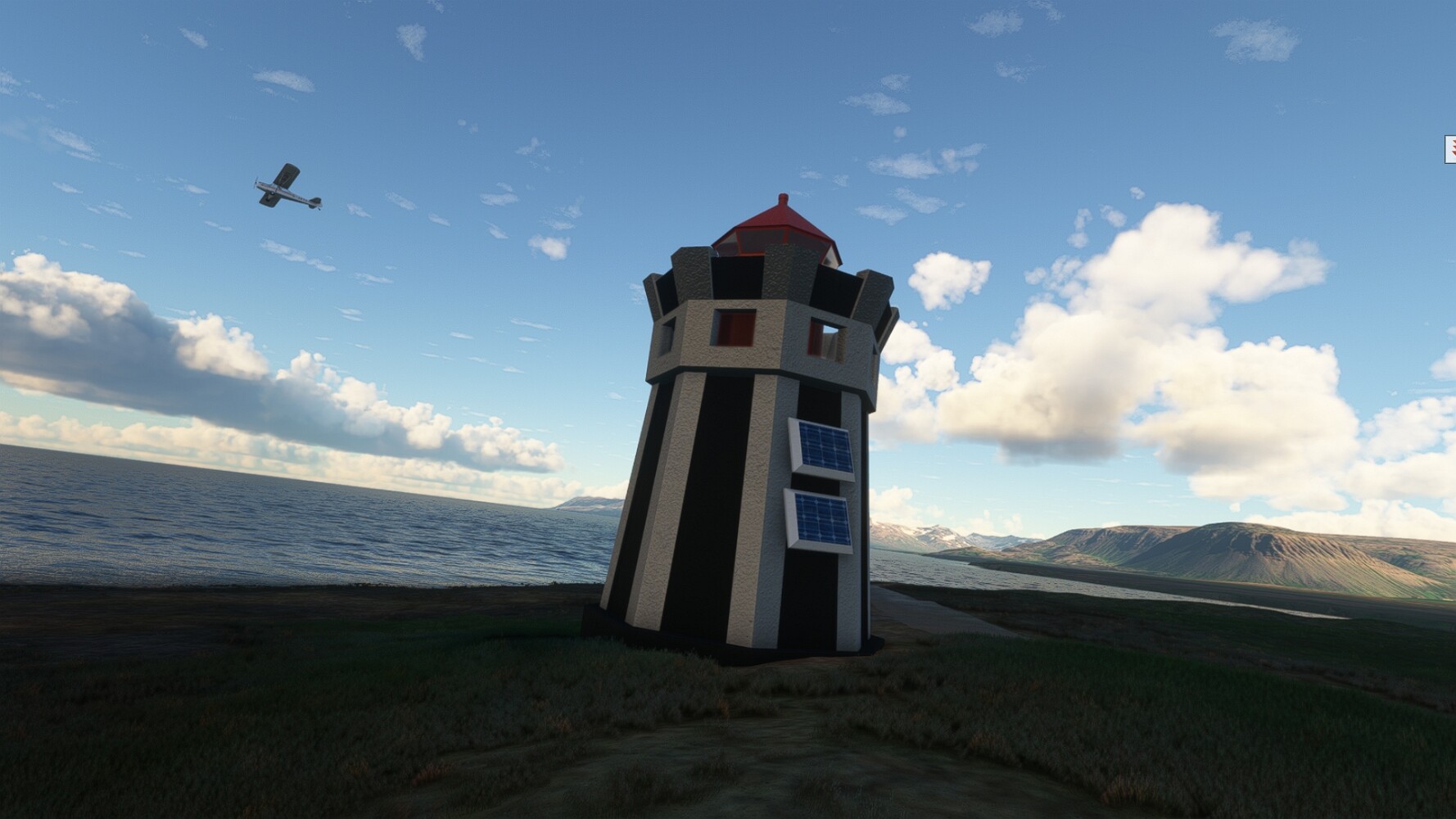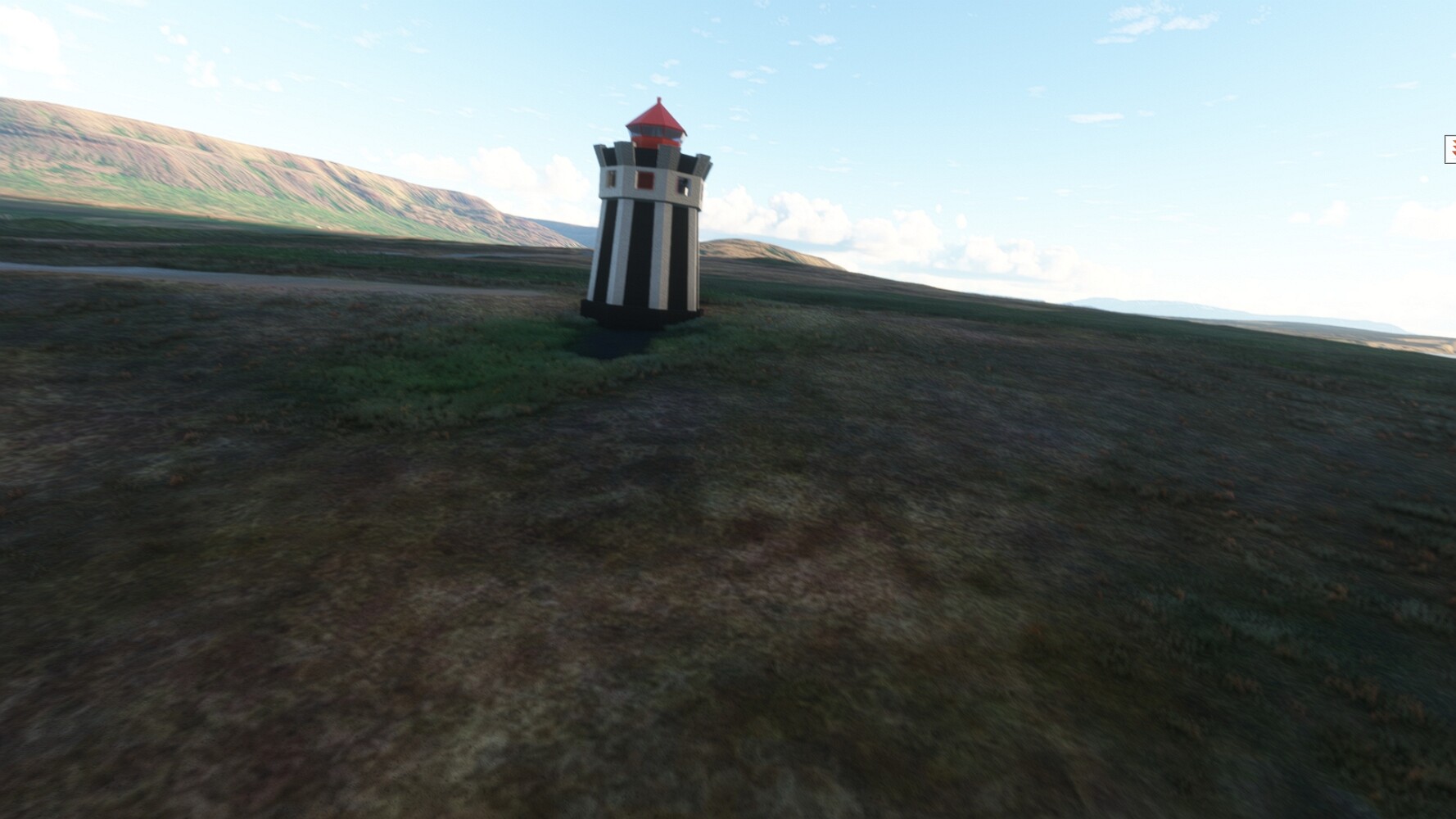 Schon geht wieder in die Lüfte! Siglufjordur Hier fehlen mal wieder die Luftbilder, die KI hat ein Pflaster drauf geklebt. Noch ein Turm? Ne wieder eine KI-Bau am Hang :-) Aber hier: die 54. Das ist der Saudanes Leuchtturm, das Modell stammt mal wieder nicht von Garf, sondern von Asobo. Auch sehr detailreich. Hier gibts mehr Infos: Link Hier gibts Wolkenbilder am Boden, lässt sich wohl nicht verhindern. Die Bucht von Miklavatn Die vorgelagerten Dünen sperren die Bucht zum Meer. Hier gibt ein bisschen Landwirtschaft. Gewaltige Tafelberge Da scheint die 55 zu kommen! Der Leuchtturm Straumnesviti. Ein ungewöhnliches Leuchtfeuer. Windumtoste Landzunge Weiter gings zur vorgelagerten Insel Málmey, da soll es auch ein Leuchtfeuer geben. Da ist es, die 56. Die Insel ist unbewohnt. Wieder ein altbekanntes Modell, Eingang zur Seeseite. Wenig Infos zu finden. Hier gibts was: Link Eine letzte Schleife Links eine beeindruckendes Steinmeer, rechts ein Meshfehler. Eieieiei, unschön! Heukugeln wie überall Die Piste ist schwer zu finden, bin im Anflug auf Stóragerdi (BI51). Wohl eine Schafzähl- und sortieranlage. GEschafft, das Wetter wurde wüster. So viel für heute. Teil 11Teil 13