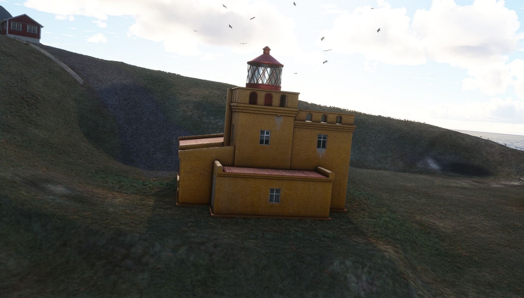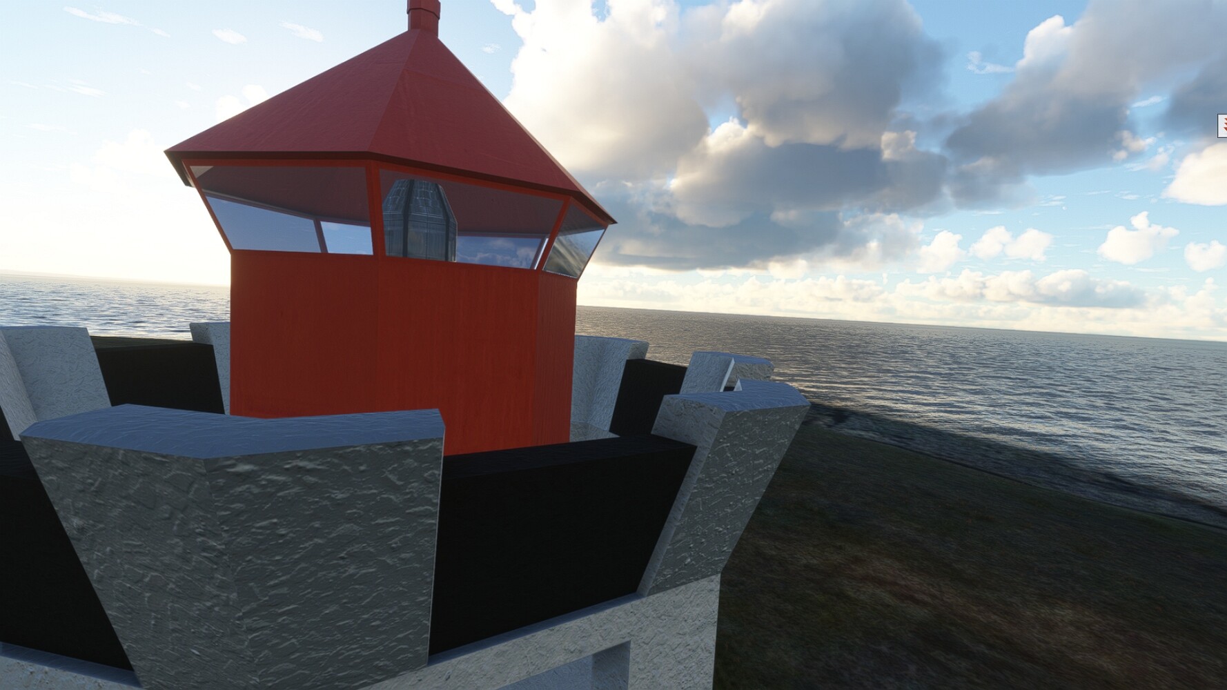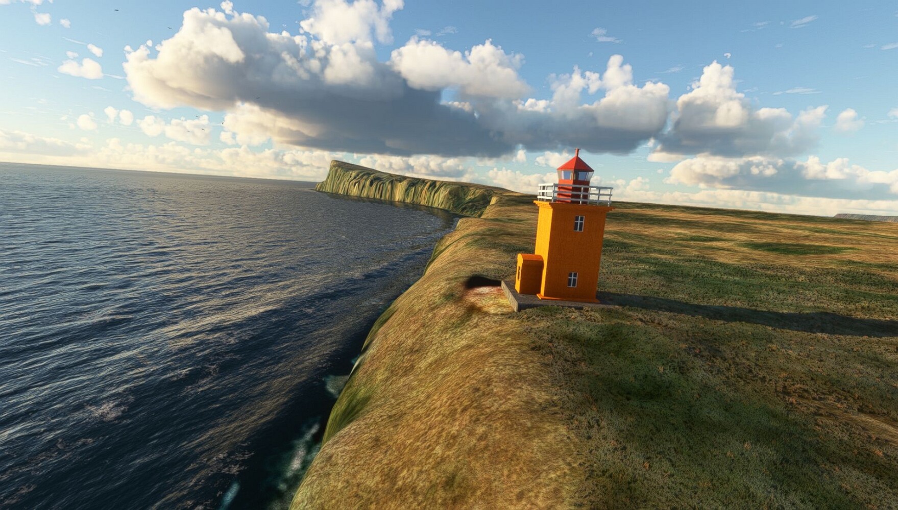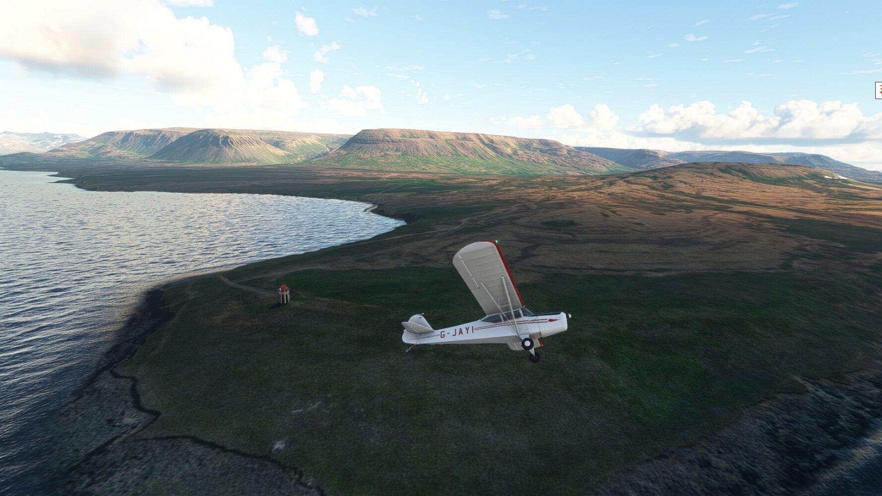Schon geht wieder in die Lüfte! Siglufjordur Hier fehlen mal wieder die Luftbilder, die KI hat ein Pflaster drauf geklebt. Noch ein Turm? Ne wieder eine KI-Bau am Hang :-) Aber hier: die 54. Das ist der Saudanes Leuchtturm, das Modell stammt mal wieder nicht von Garf, sondern von Asobo. Auch sehr detailreich. Hier gibts mehr Infos: Link Hier gibts Wolkenbilder am Boden, lässt sich wohl nicht verhindern. Die Bucht von Miklavatn Die vorgelagerten Dünen sperren die Bucht zum Meer. Hier gibt ein bisschen Landwirtschaft. Gewaltige Tafelberge Da scheint die 55 zu kommen! Der Leuchtturm Straumnesviti. Ein ungewöhnliches Leuchtfeuer. Windumtoste Landzunge Weiter gings zur vorgelagerten Insel Málmey, da soll es auch ein Leuchtfeuer geben. Da ist es, die 56. Die Insel ist unbewohnt. Wieder ein altbekanntes Modell, Eingang zur Seeseite. Wenig Infos zu finden. Hier gibts was: Link Eine letzte Schleife Links eine beeindruckendes Steinmeer, rechts ein Meshfehler. Eieieiei, unschön! Heukugeln wie überall Die Piste ist schwer zu finden, bin im Anflug auf Stóragerdi (BI51). Wohl eine Schafzähl- und sortieranlage. GEschafft, das Wetter wurde wüster. So viel für heute. Teil 11Teil 13